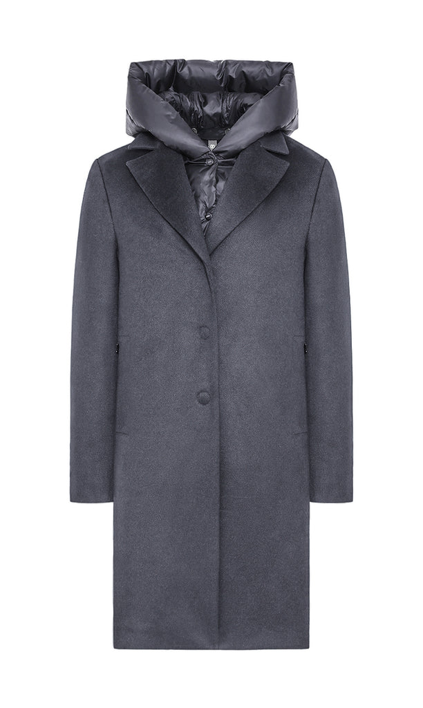 Single-breasted coat in technical wool with down padding, featuring a detachable bib with hood made of color-matching superlight technical fabric and a deep central back slit closed by hidden snap buttons. Front closure with 3 buttons and zippered side welt pockets.