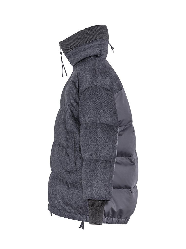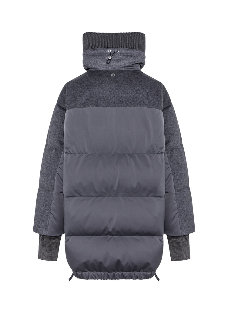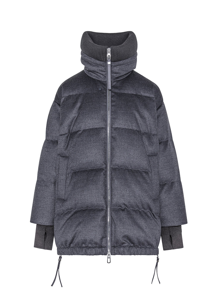 Long down jacket made with the combination of technical wool and satin, characterized by a high collar with an external drawstring and an inner in wide-ribbed wool knit. Openable and adjustable zippered sides, hidden elastic band that shrinks the bottom and sleeve hems with long wool knitted cuffs that can be worn as mittens due to the thumb hole. Double-slider zip closure with zip puller detail and side welt pockets with hidden snap button.