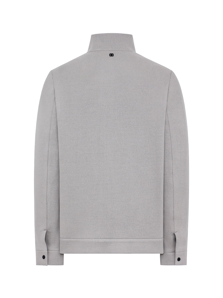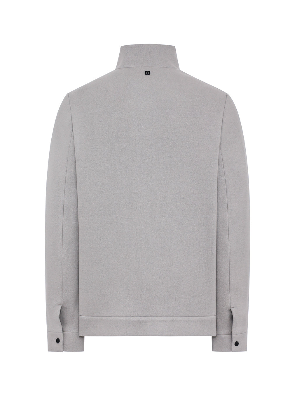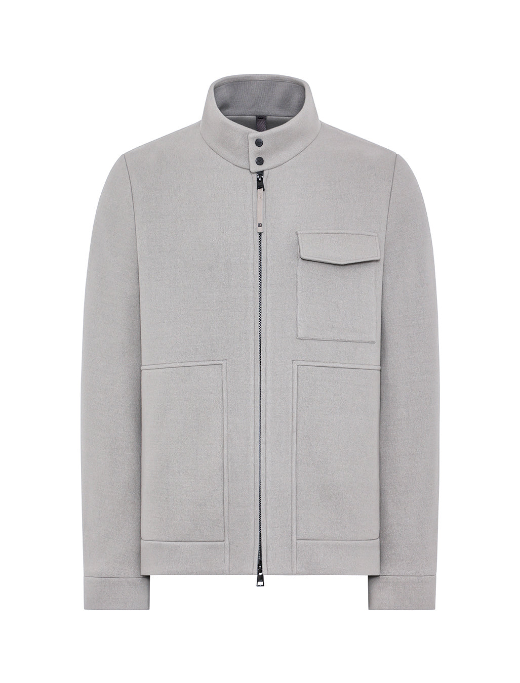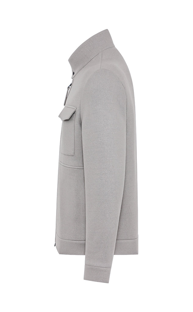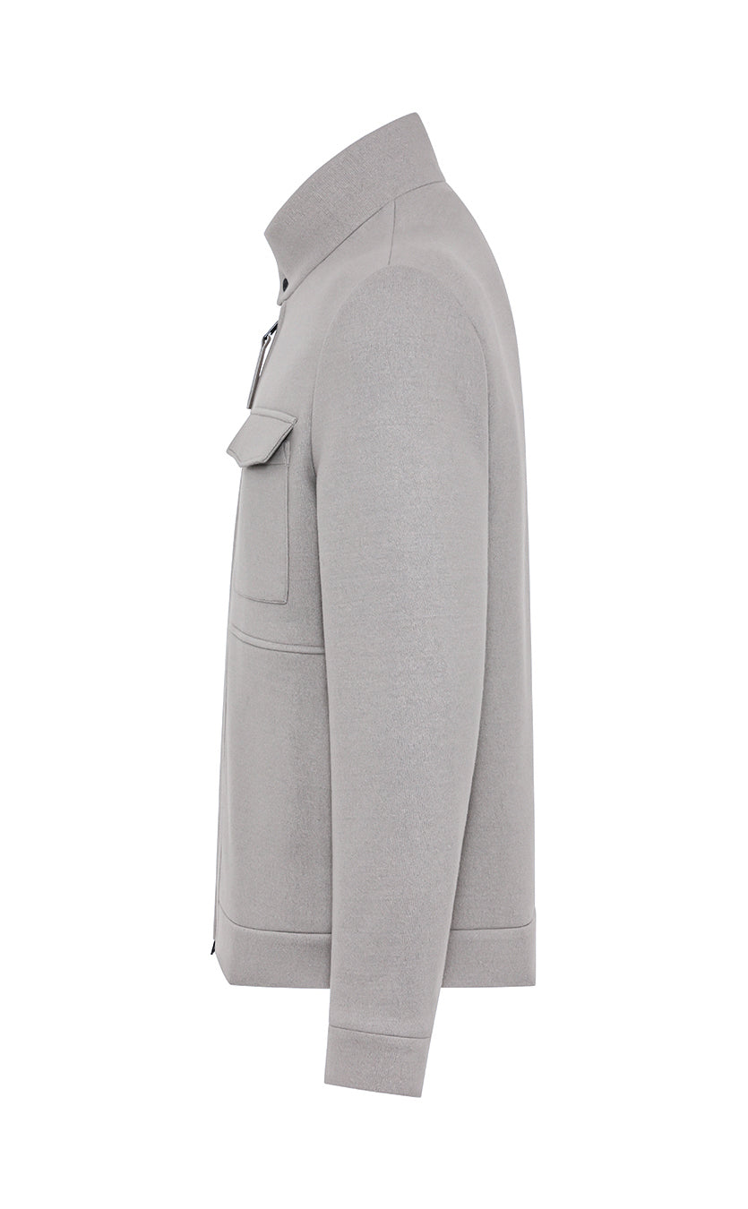 Unlined short jacket made of wool and cashmere jersey with a high stand collar and inner knit detail, double-slider zip closure, side patch pockets, small chest pocket with flap and sleeve bottom with slit and cuff closed by a snap button.