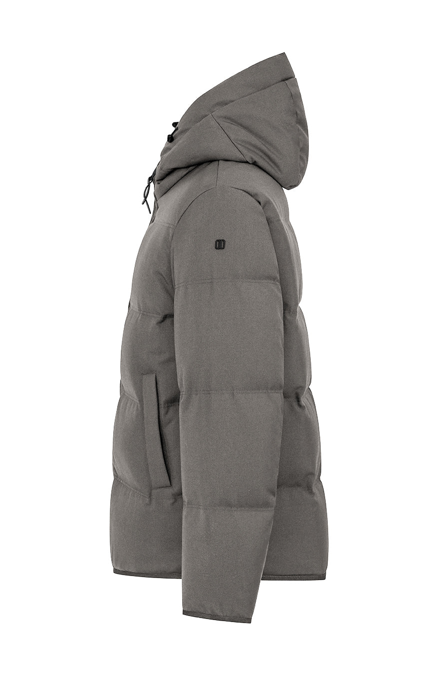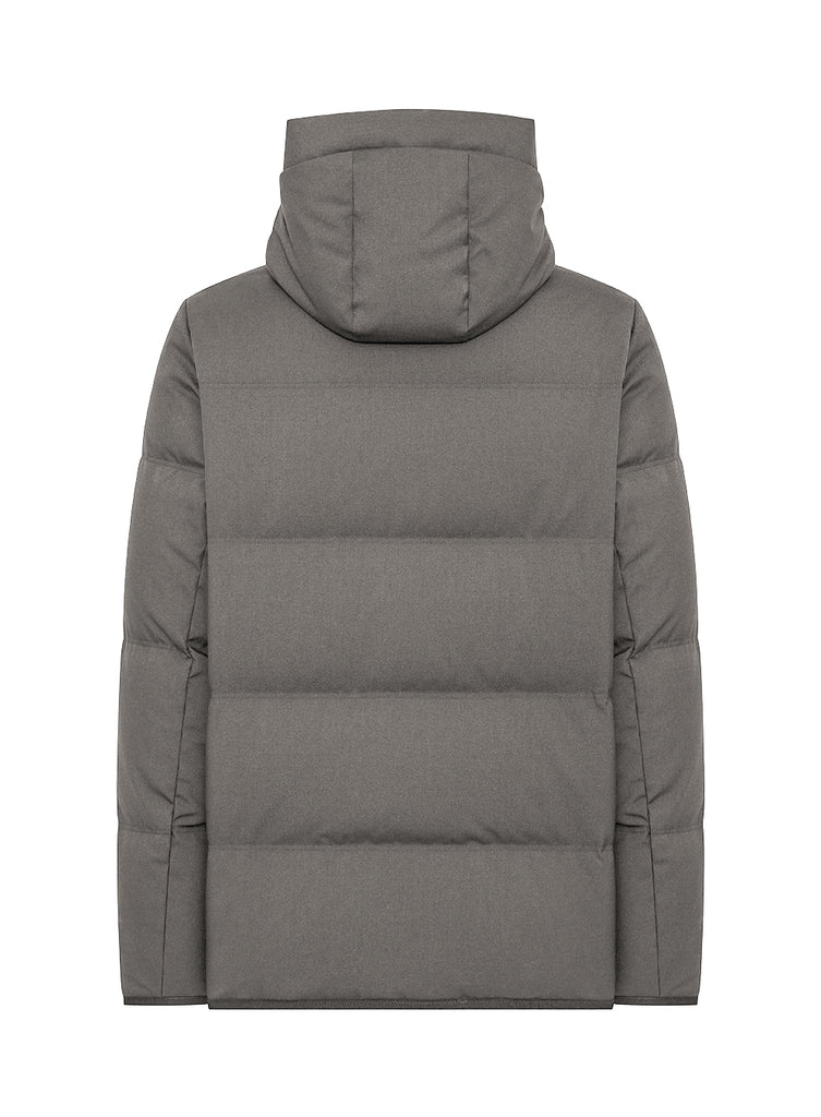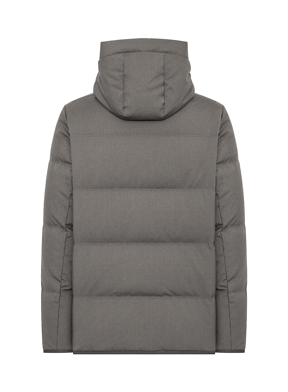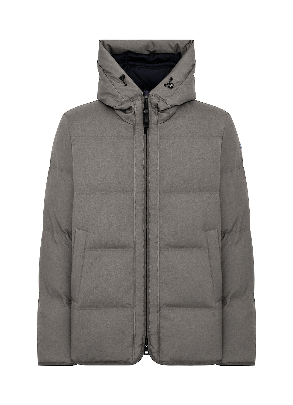 Wool-like short down jacket with adjustable hood with drawstring The garment is characterized by double-slider zipper and side contoured openings adjustable with zipper. Side welt pockets with hidden snap buttons and multi-functional inside pockets closed by invisible zipper.