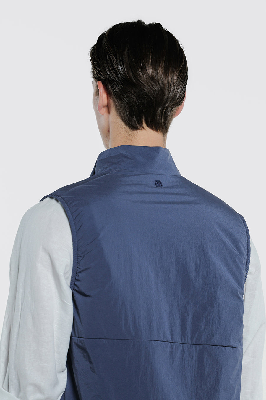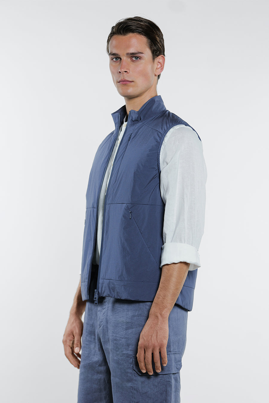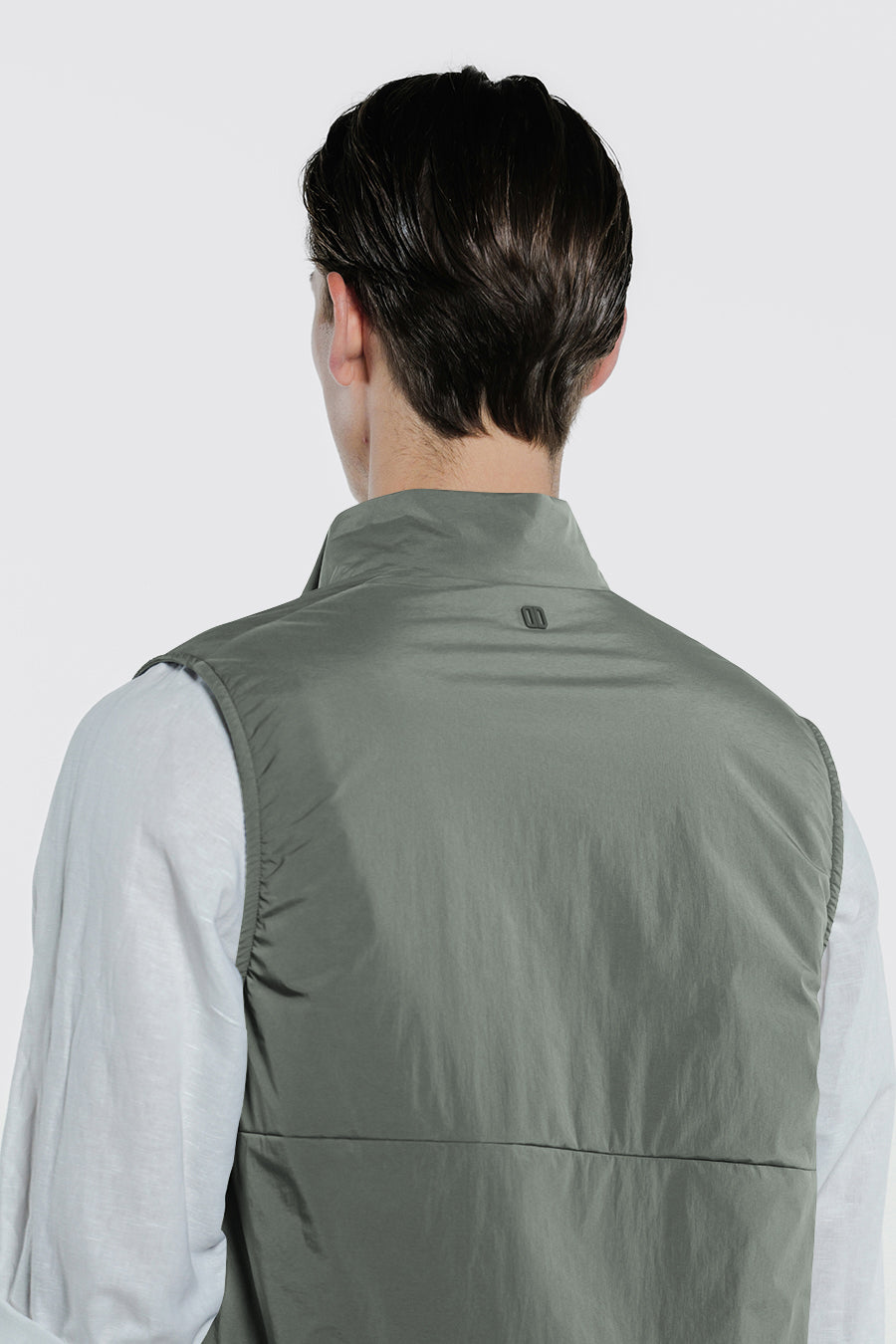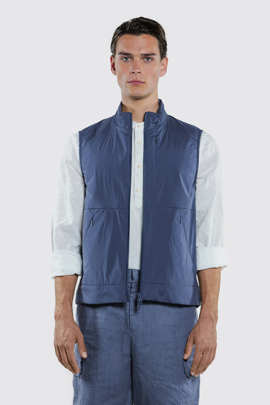Stretch technical fabric with water resistance finishing and garment dyeing chromatic effect. High technical performance synthetic padding contributes to thermal insulation, while maintaining high breathability.