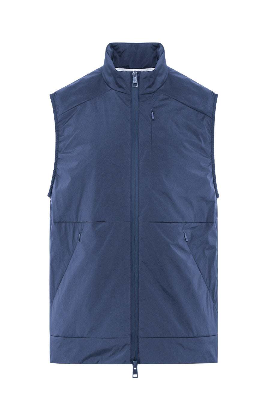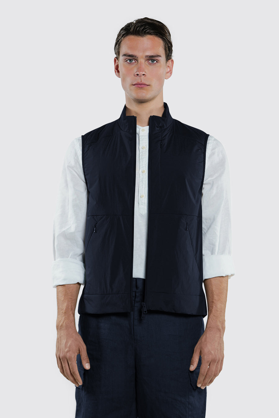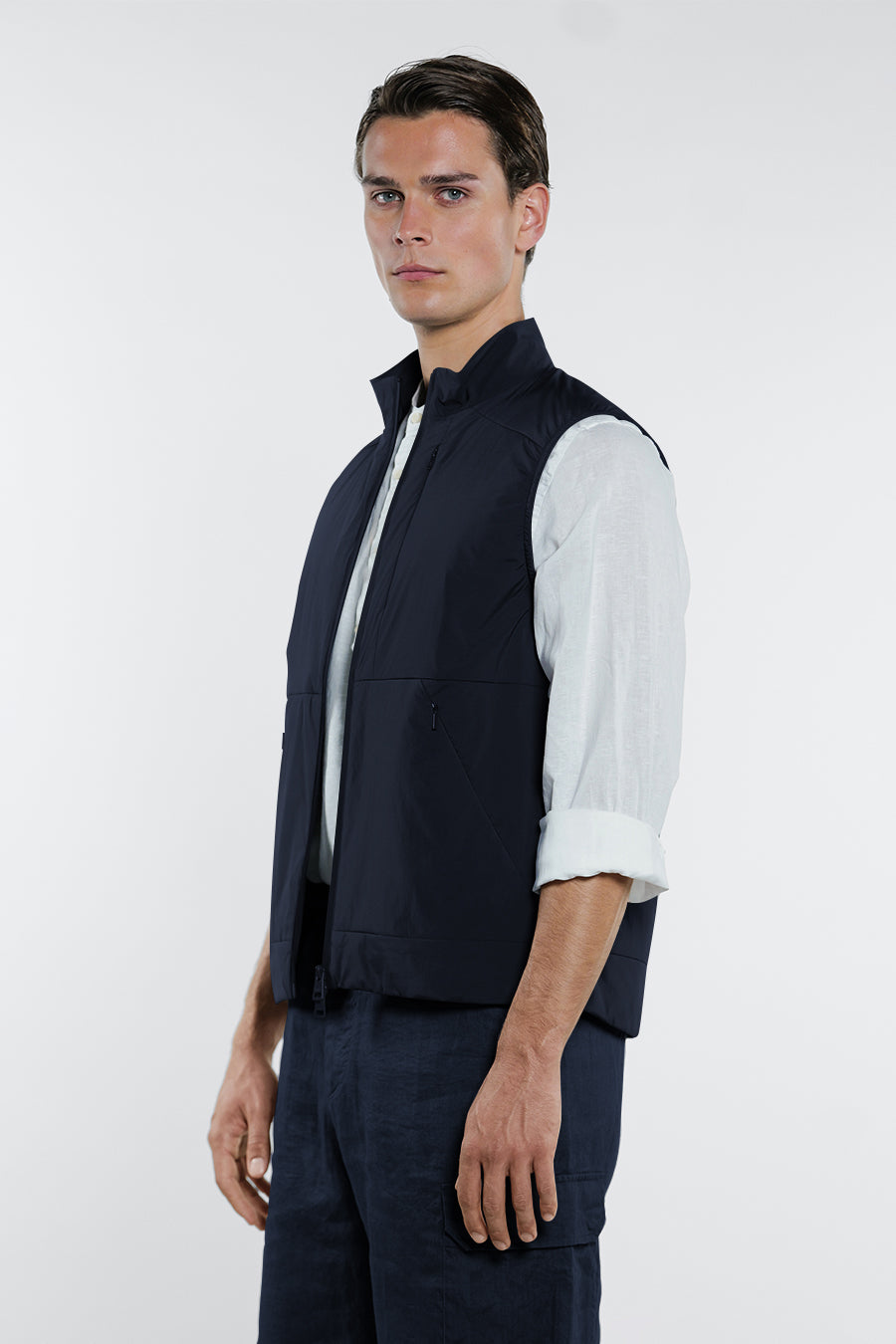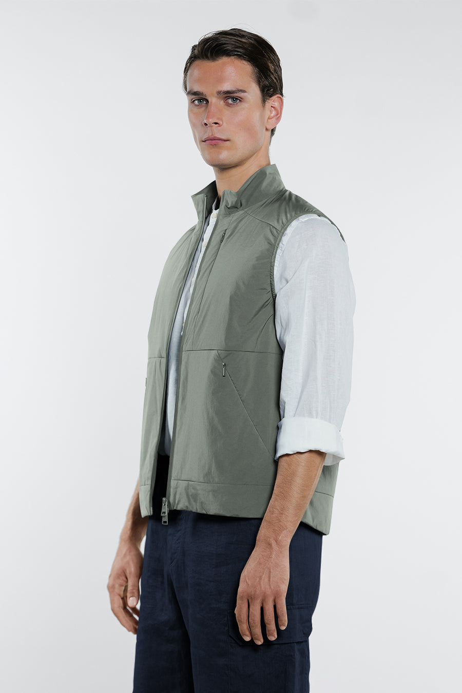 Stretch technical fabric with water resistance finishing and garment dyeing chromatic effect. High technical performance synthetic padding contributes to thermal insulation, while maintaining high breathability.