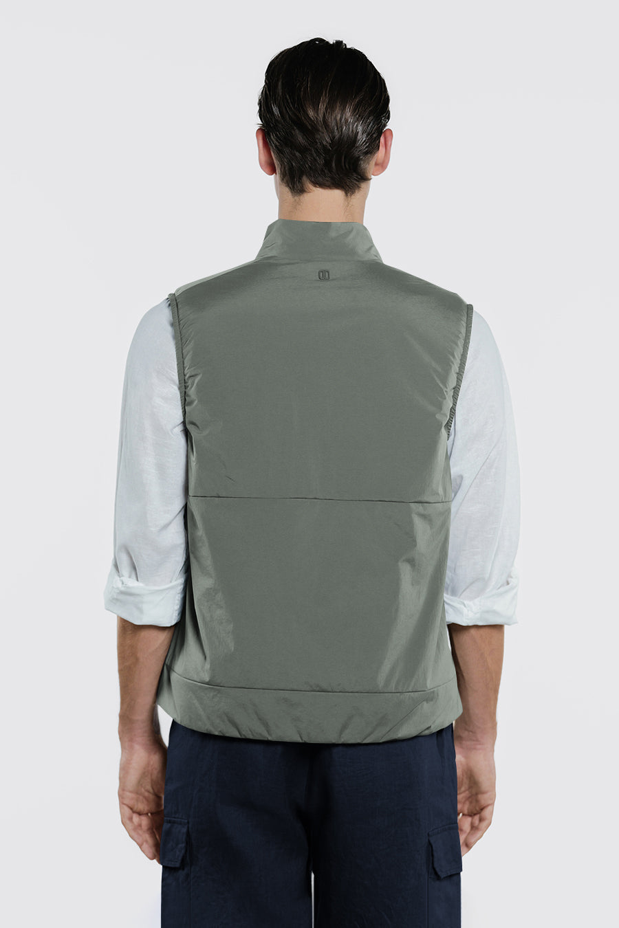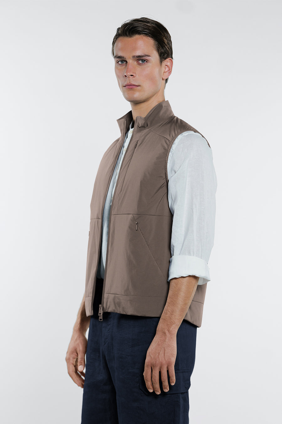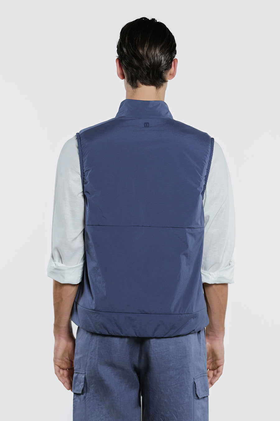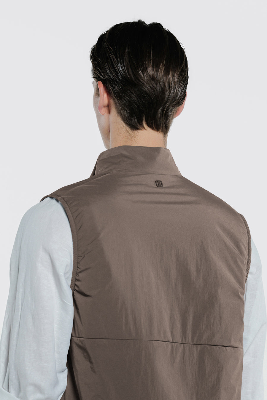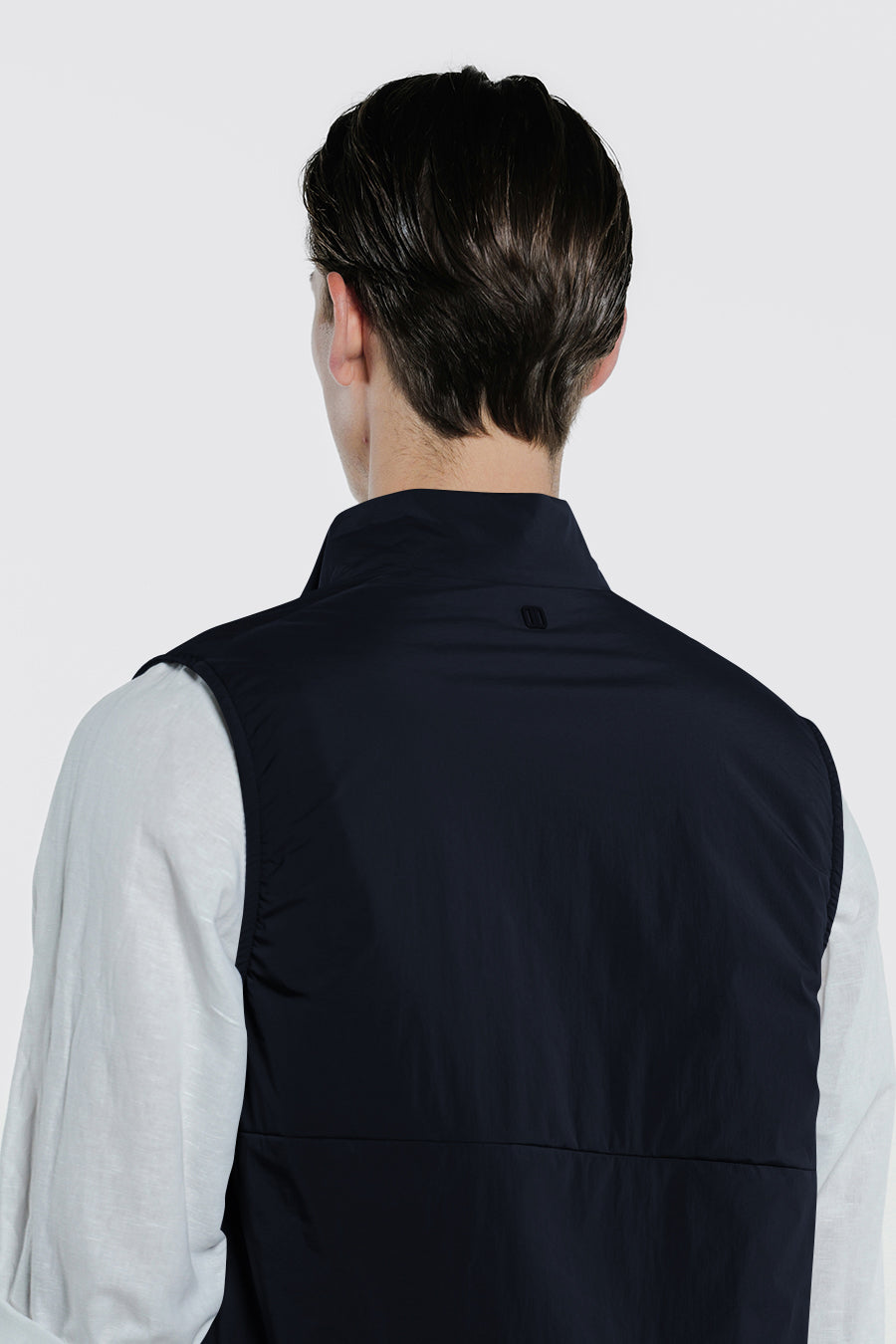 Stretch technical fabric with water resistance finishing and garment dyeing chromatic effect. High technical performance synthetic padding contributes to thermal insulation, while maintaining high breathability.