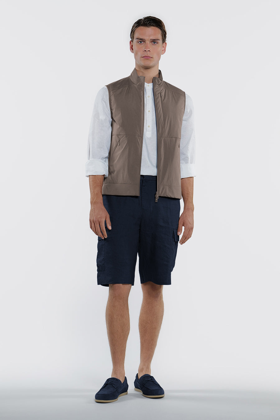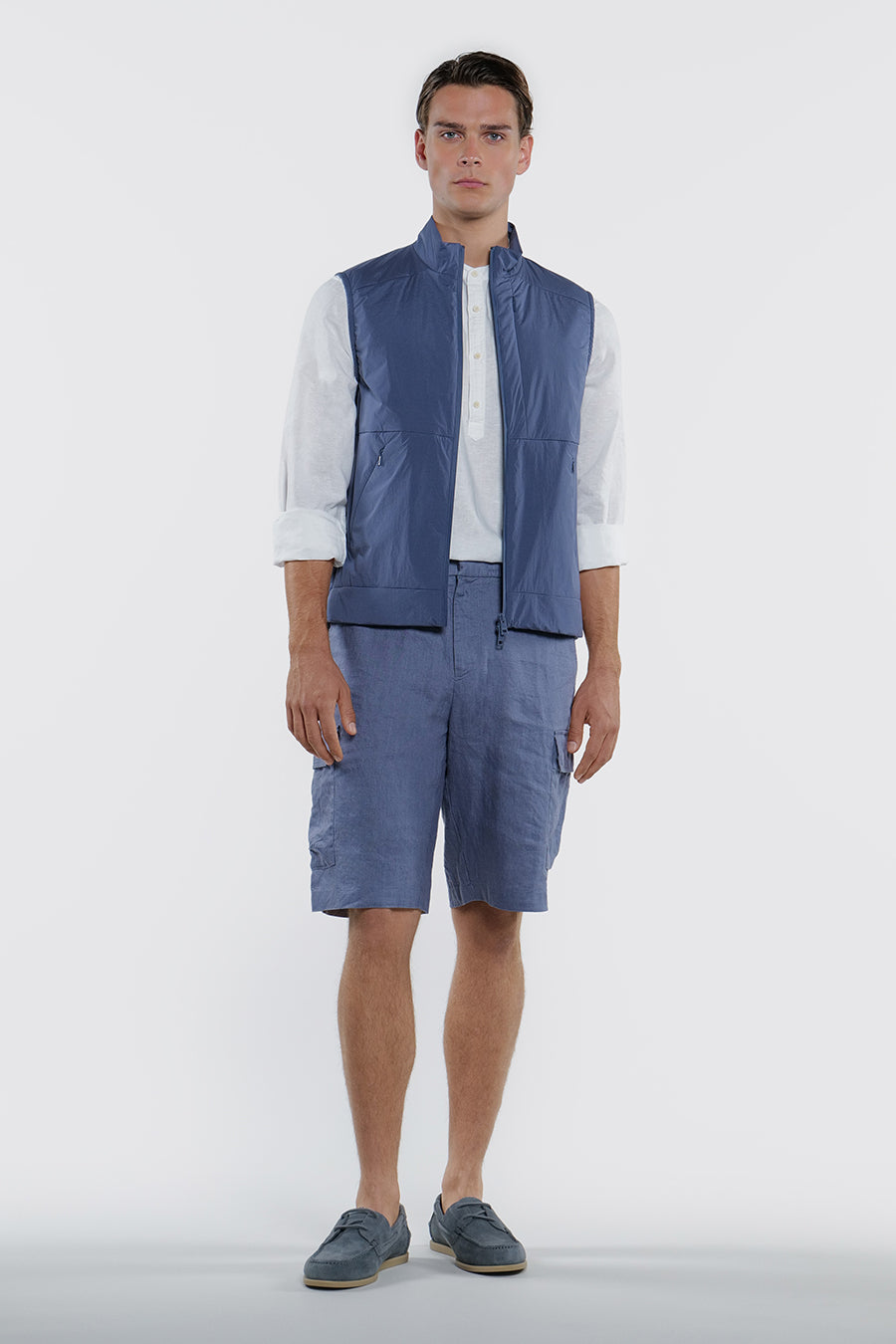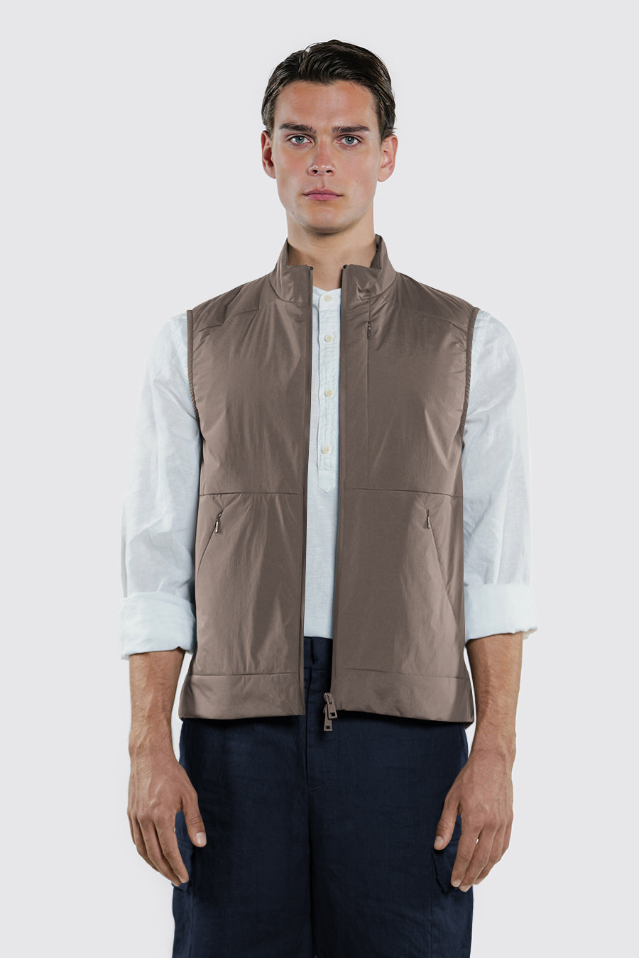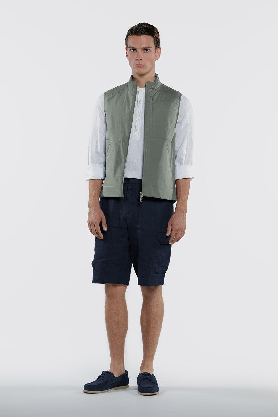 Stretch technical fabric with water resistance finishing and garment dyeing chromatic effect. High technical performance synthetic padding contributes to thermal insulation, while maintaining high breathability.