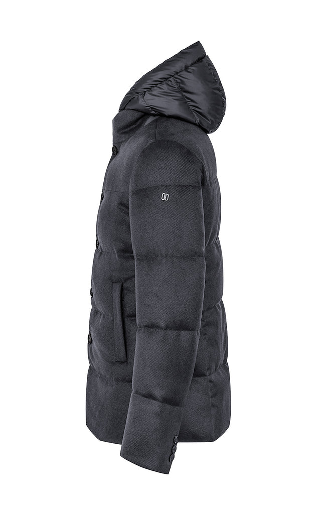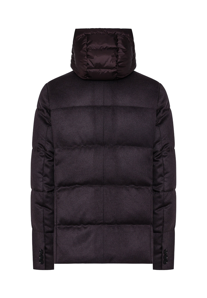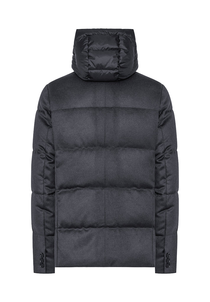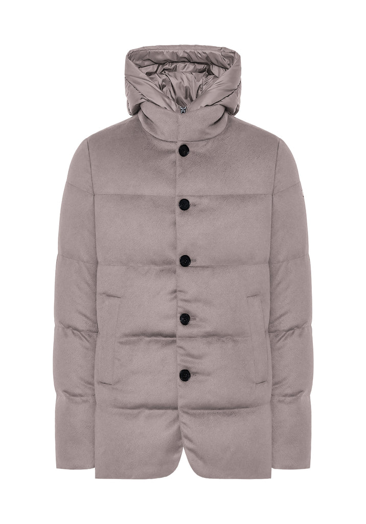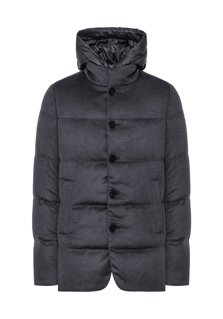 Technical wool quilted jacket with standing collar, characterized by under-collar neoprene embossed logo, featuring a detachable bib made of technical fabric with hood and double-slider zip closure. Front closure with buttons and hidden zippered side welt pockets.