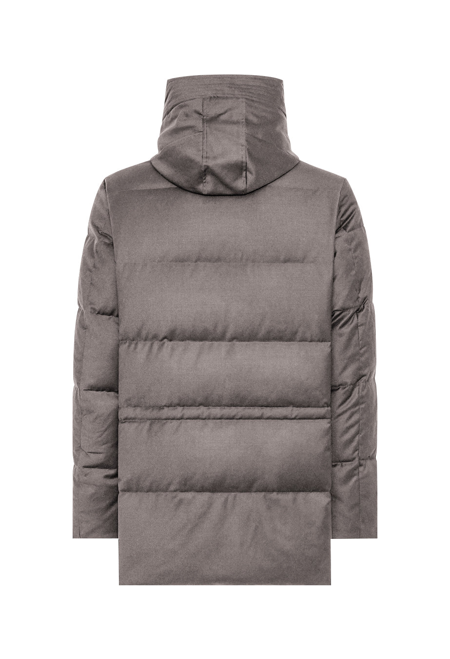 Quilted down padded parka in pure wool. Front closure with full-height zipper and hidden snap buttons, combination of low pockets with flap and snap closure and high hand warmer pockets. Technical knitted cuff at the bottom of the sleeve. Multi-functional pockets on the inside.