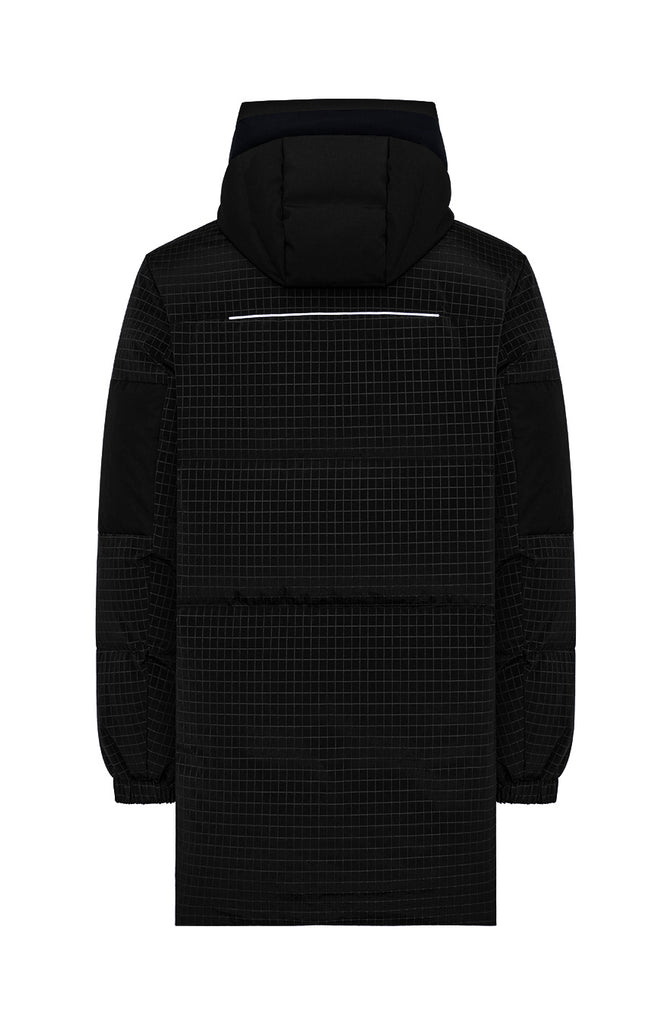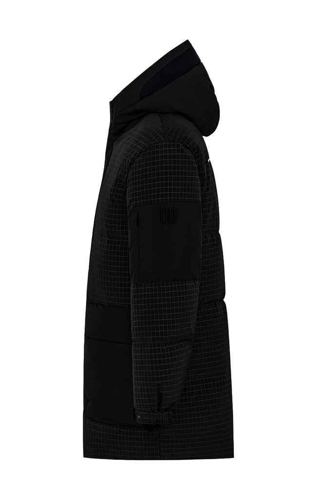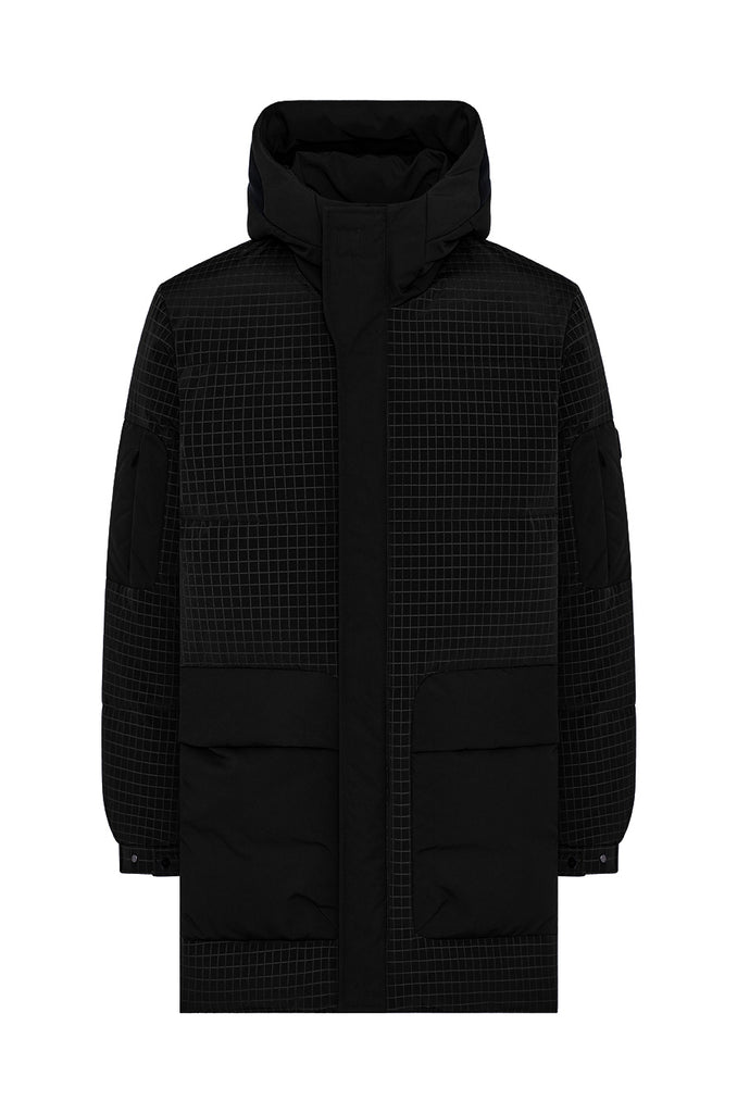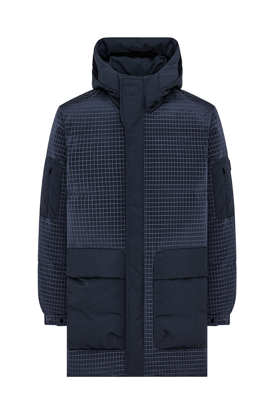 Parka in technical fabric with macro rip-stop nylon structure and down padding. Double front closure with double slider zipper and snap button covered by the front placket with FIDLOCK® button detail. Wide side patch pockets closed by snap buttons and invisible zipper, pockets on the sleeve and elasticated sleeve bottom, adjustable with snap buttons. On the inside, multi-functional pockets with reflective details.
