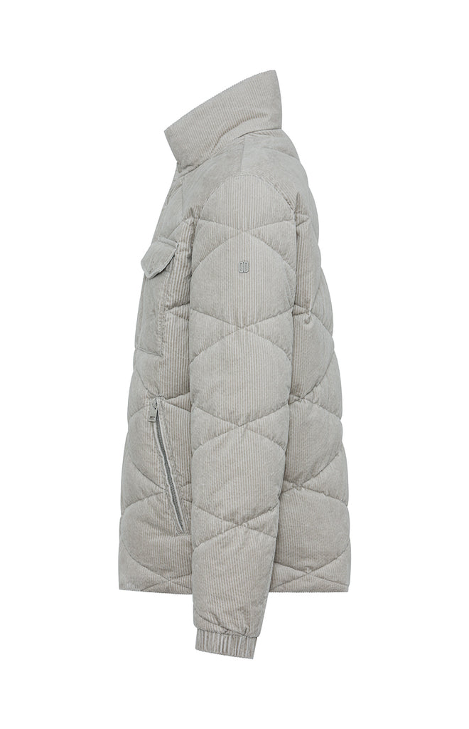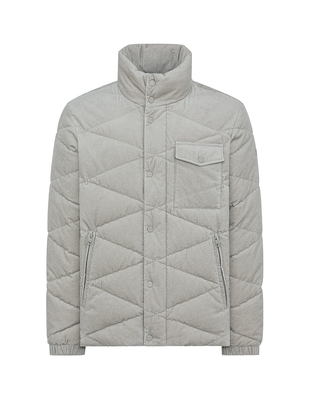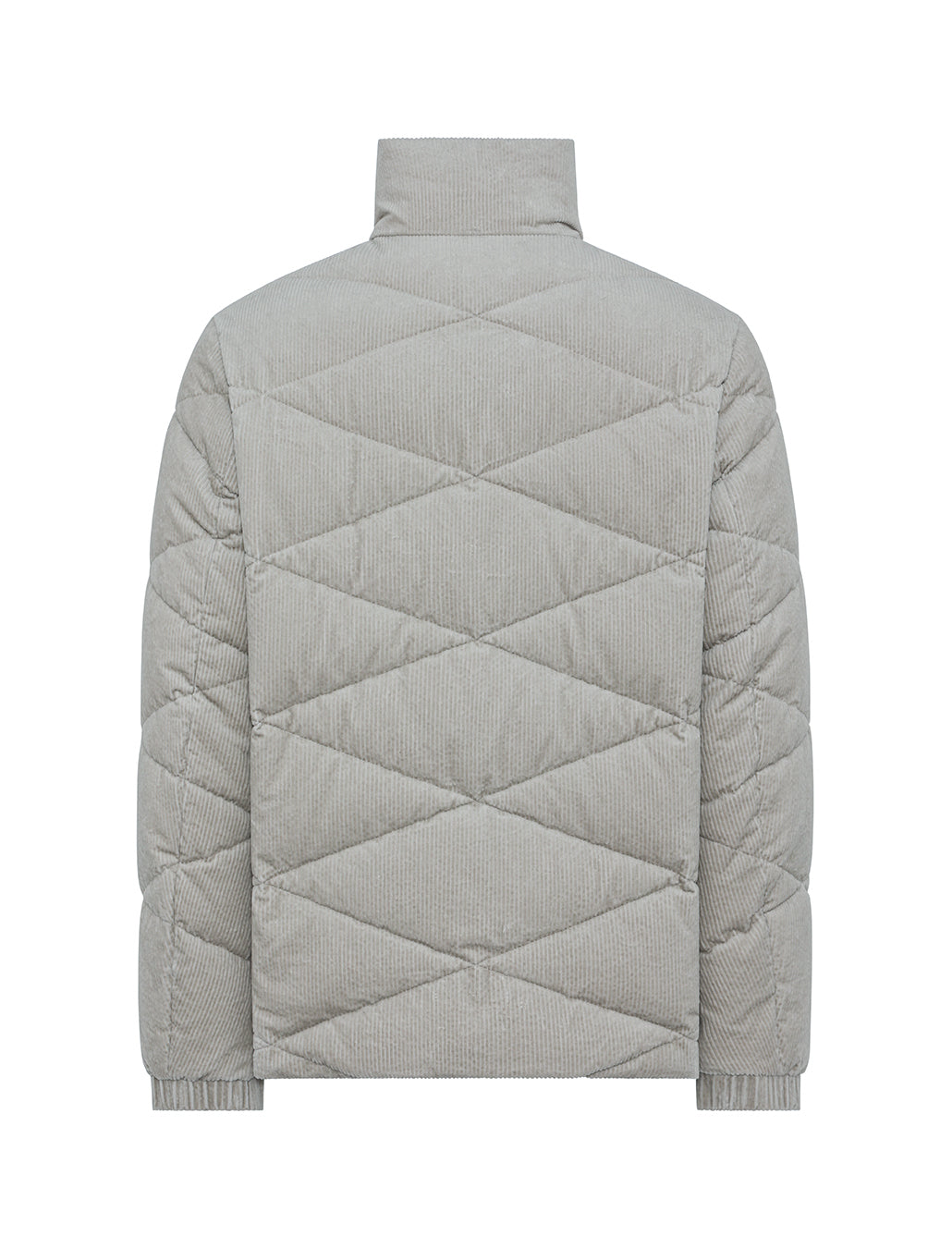Geometric quilted cotton corduroy jacket with down padding. Stand collar, double front closure with double-slider zipper and snap buttons fixed on the color-tone tape. Sleeve bottom with elastic band hidden in the cuff. Double-welt outer side pockets with zip closure and multi-function pockets with reflective details on the inside.