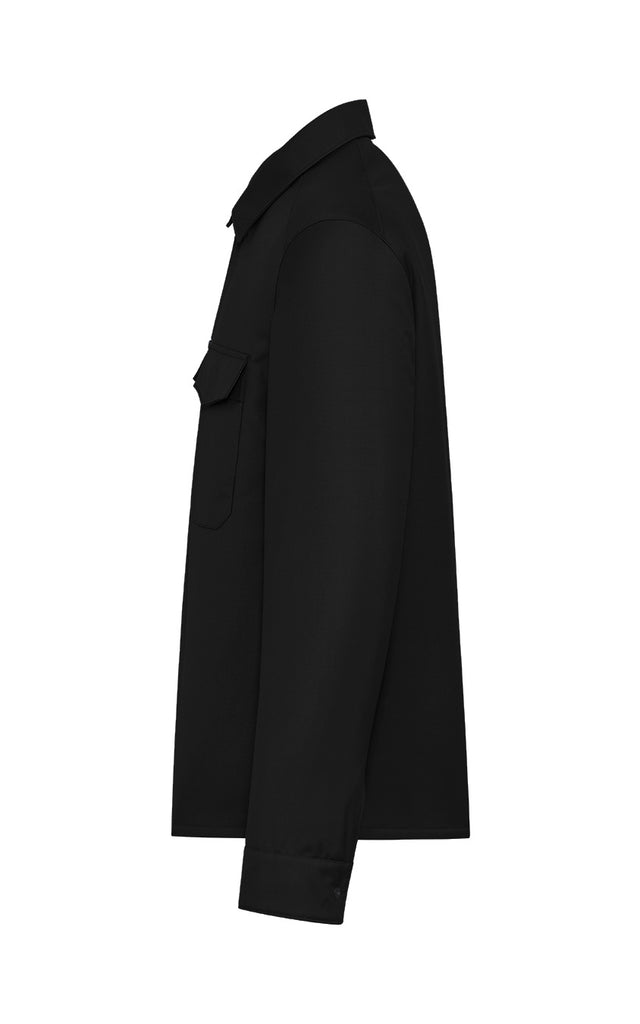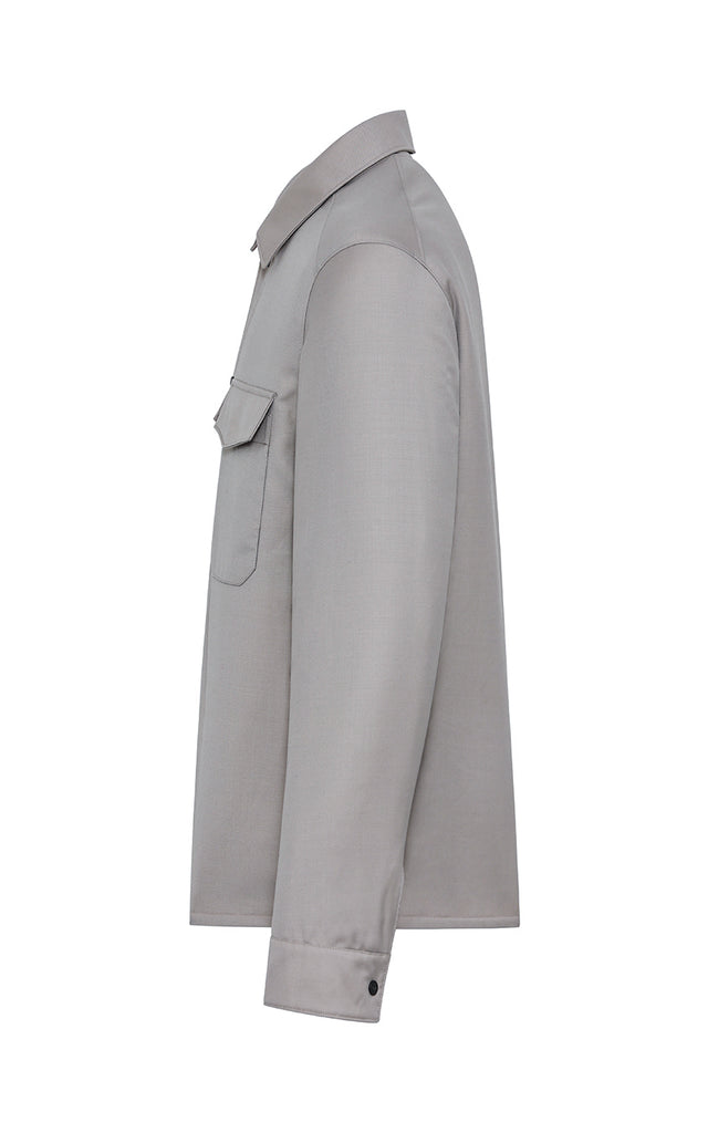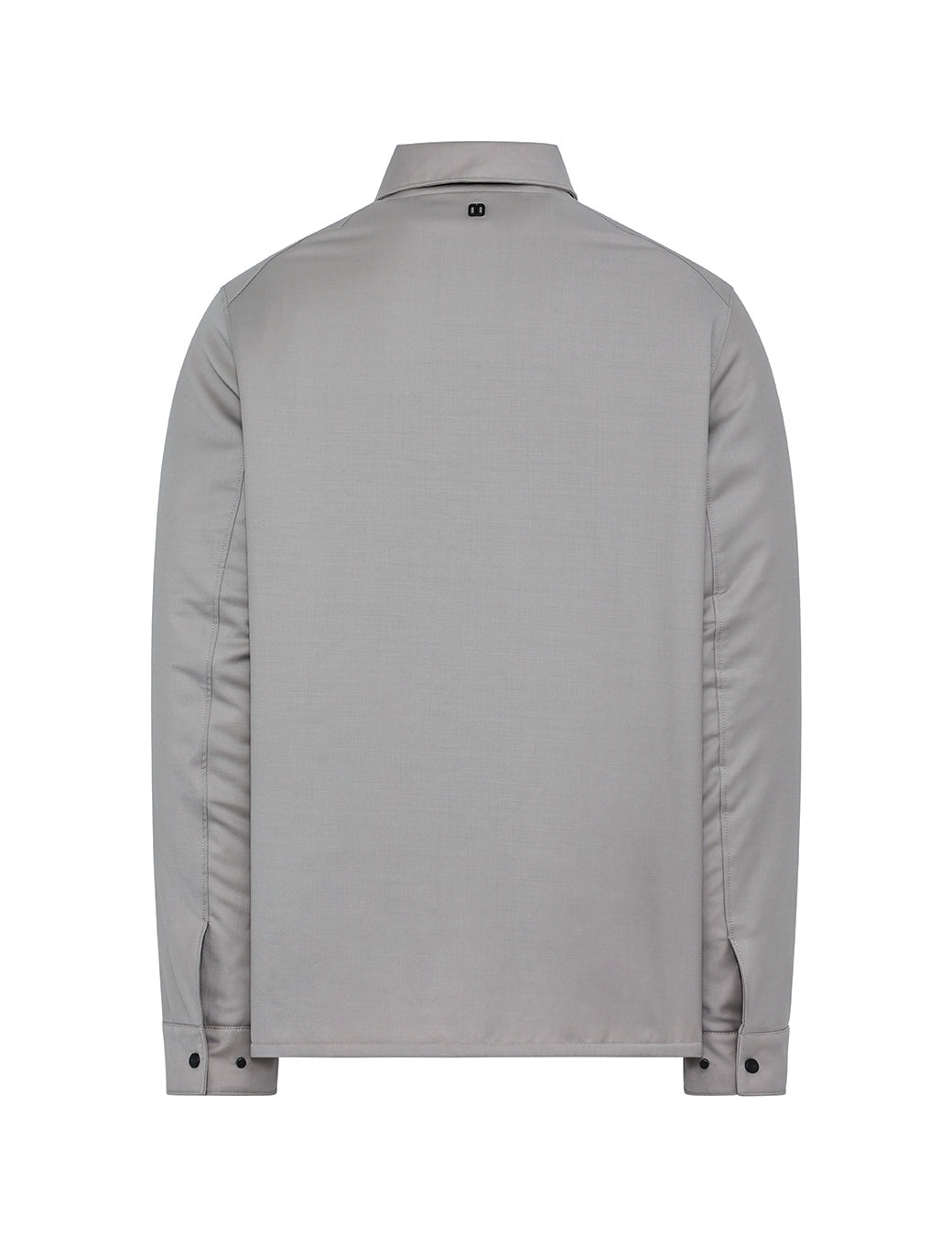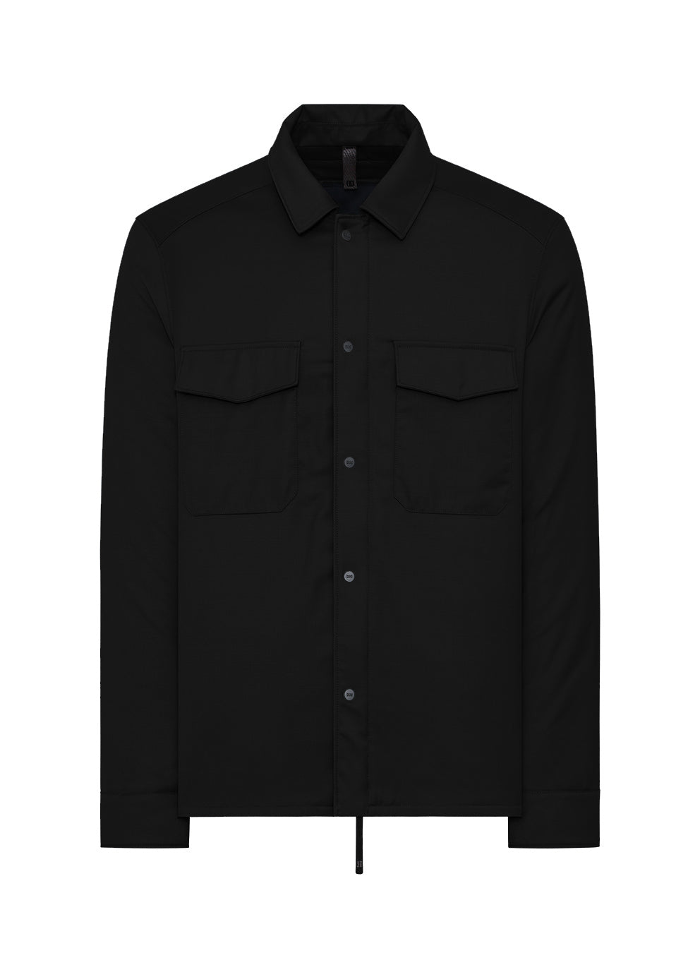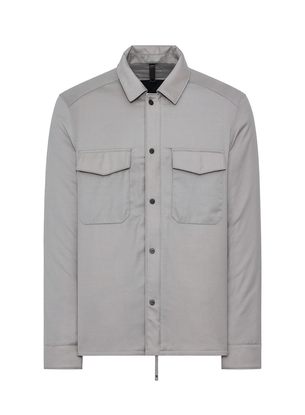 Shirt jacket made of technical wool with super lightweight padding. Double front closure with double slider zipper and snap buttons, side welt pockets inserted in the side cut and high patch pockets with flaps closed by a snap button. Multi-functional pockets on the inside.