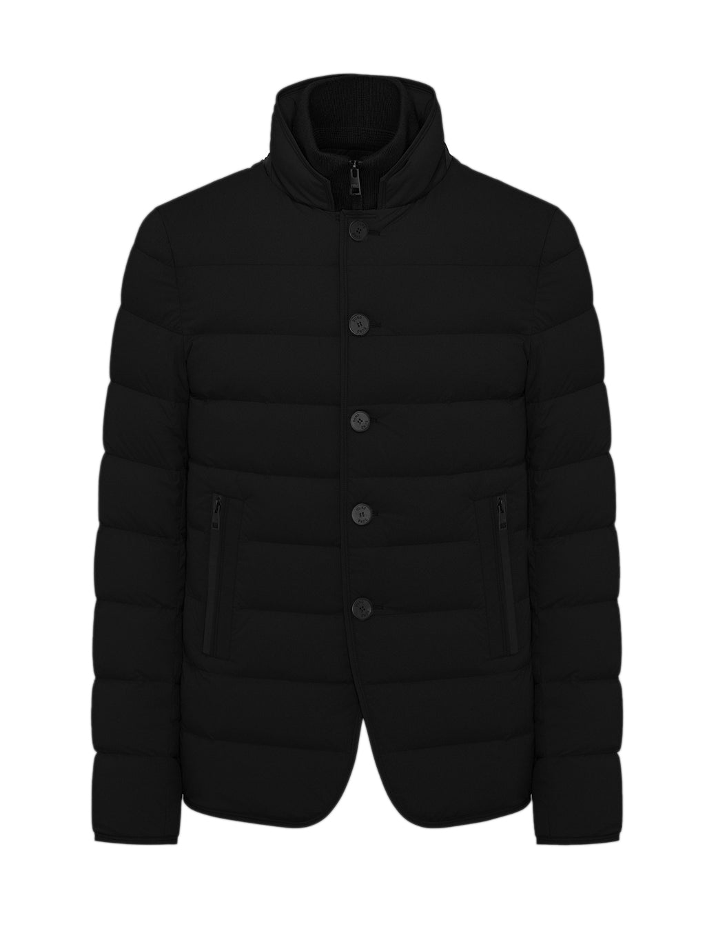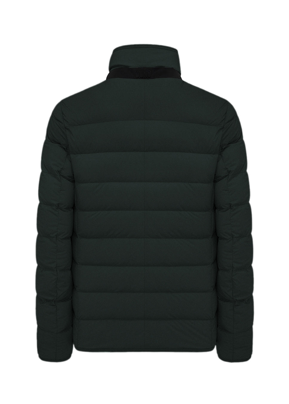 Down jacket in bi-stretch superlight fabric featuring a detachable bib with zip closure. Stand collar detailed with a black neoprene detail with embossed logo at the back, front closure with buttons and side welt pockets with water-resistant zipper. Multi-functional pockets with reflective detail on the inside.