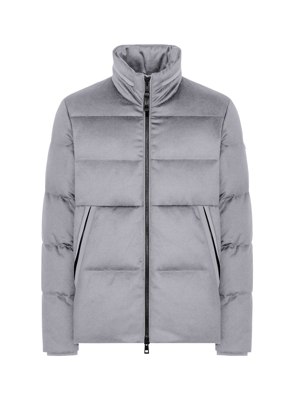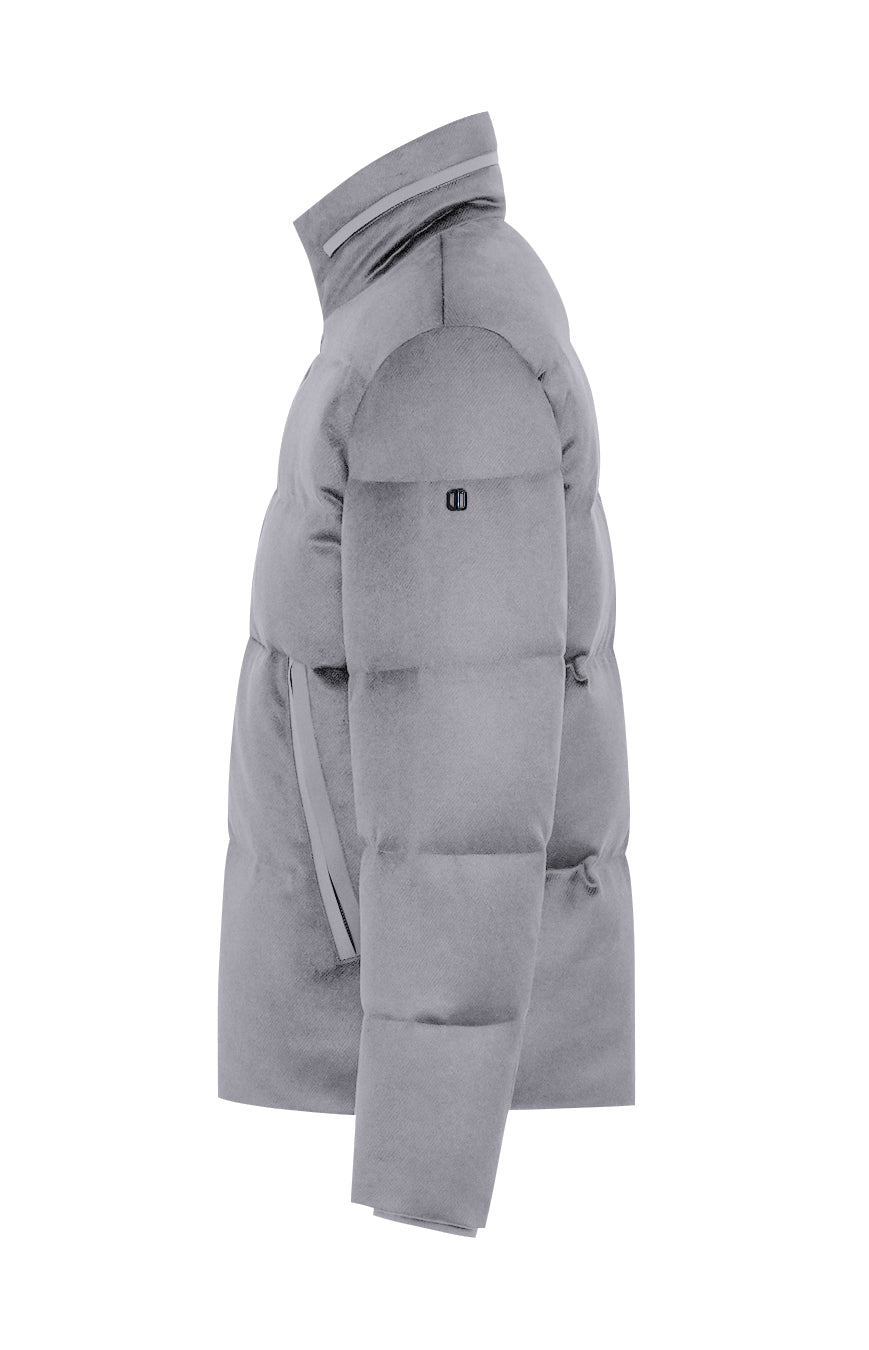 Short down jacket in technical wool with a stand collar containing a folded hood, front closure with double-slider zipper and wide side slant pockets with zipper closure, covered by welts. Hidden drawstring at the bottom and inner cuffs in technical knit. Multifunctional pockets on the inside, enriched with reflective details.