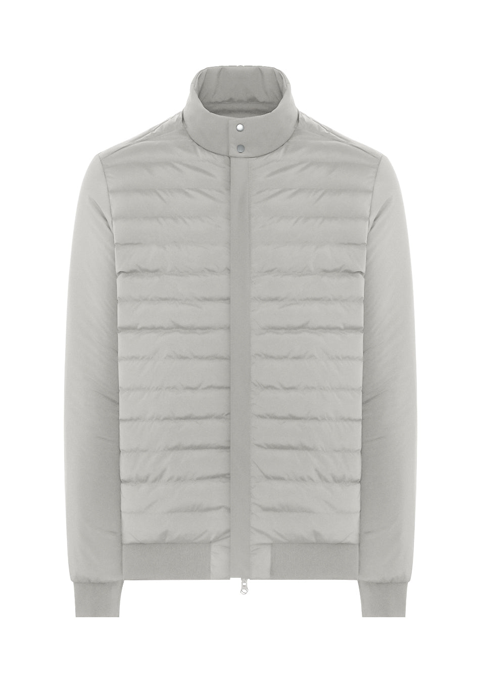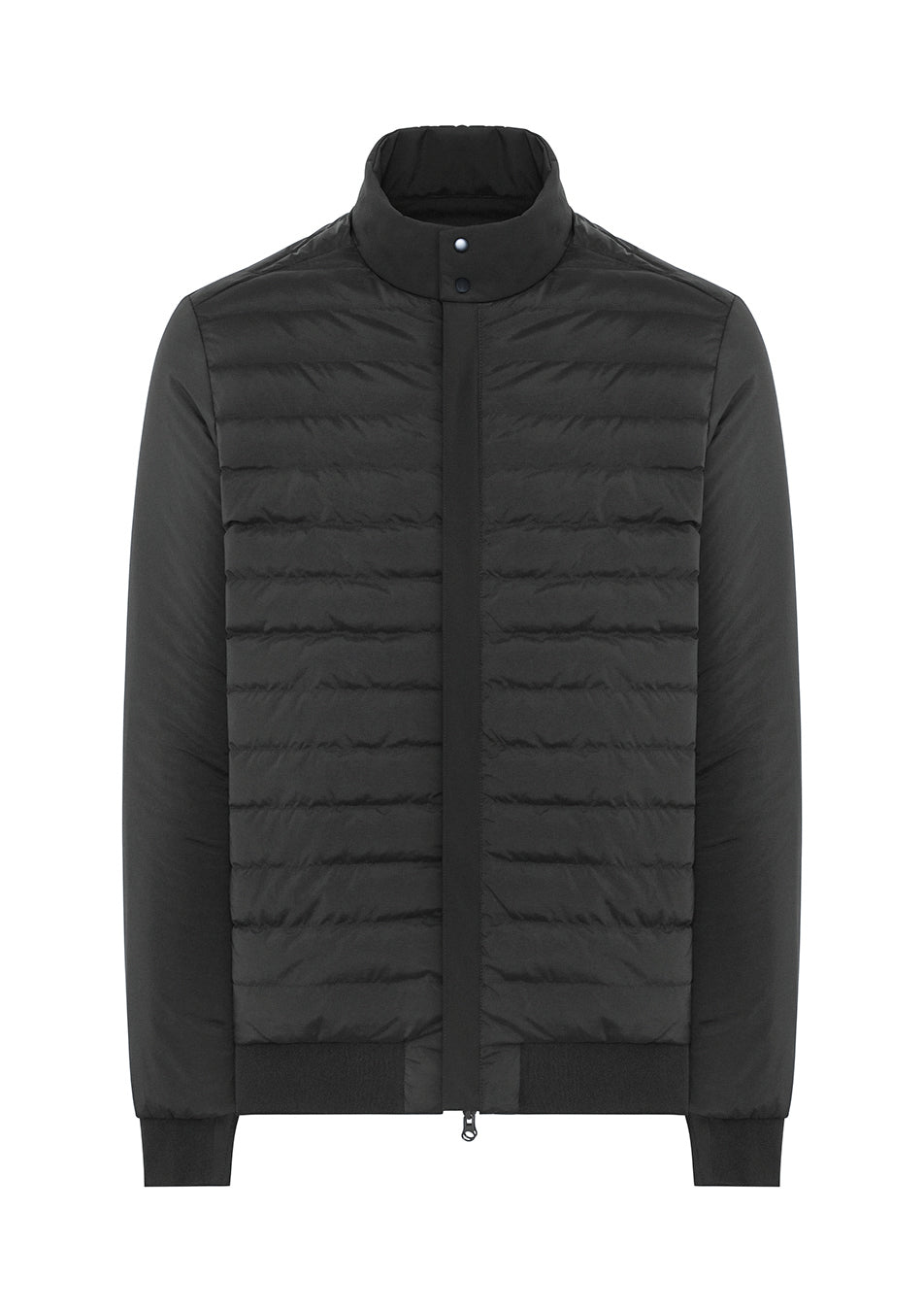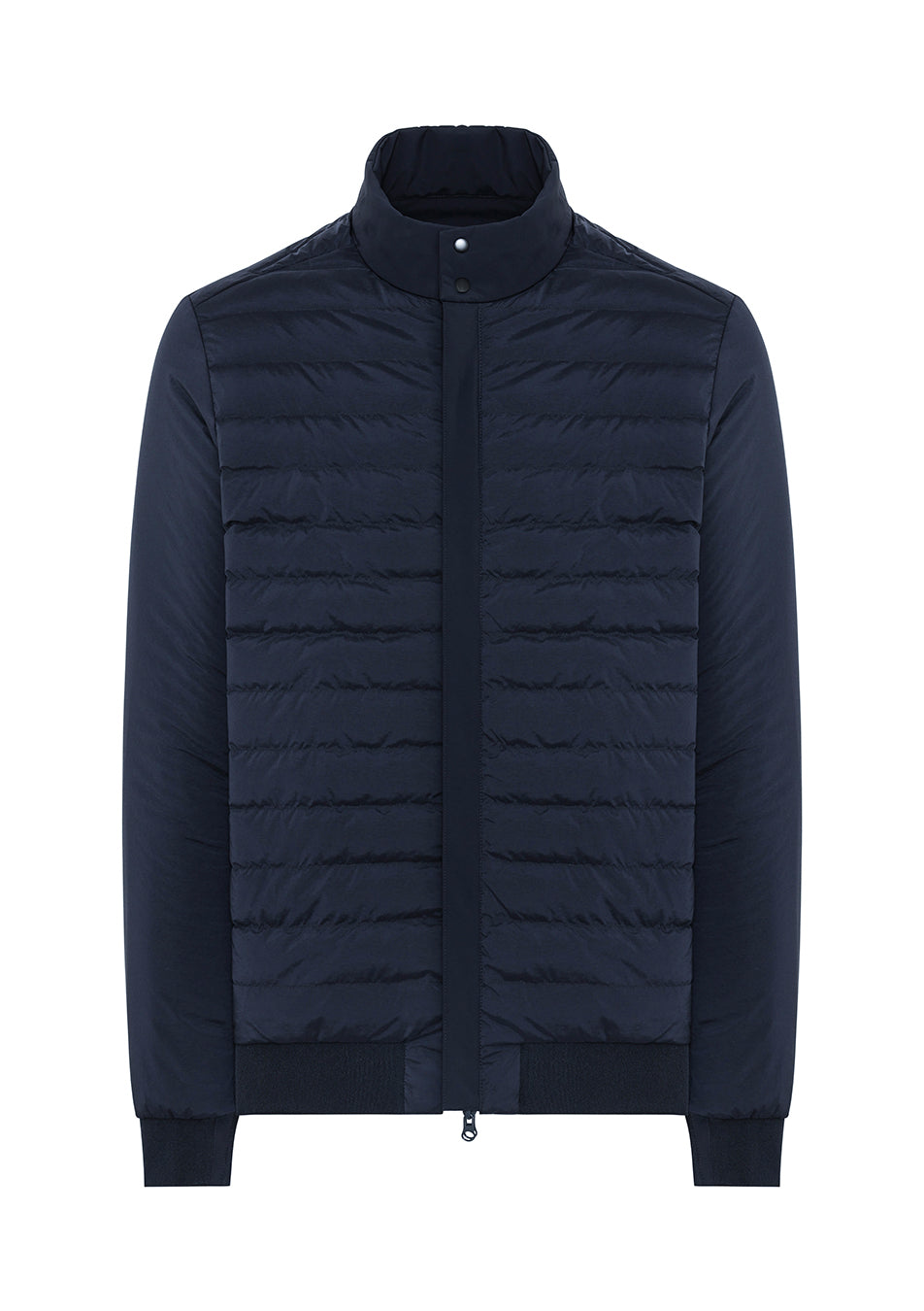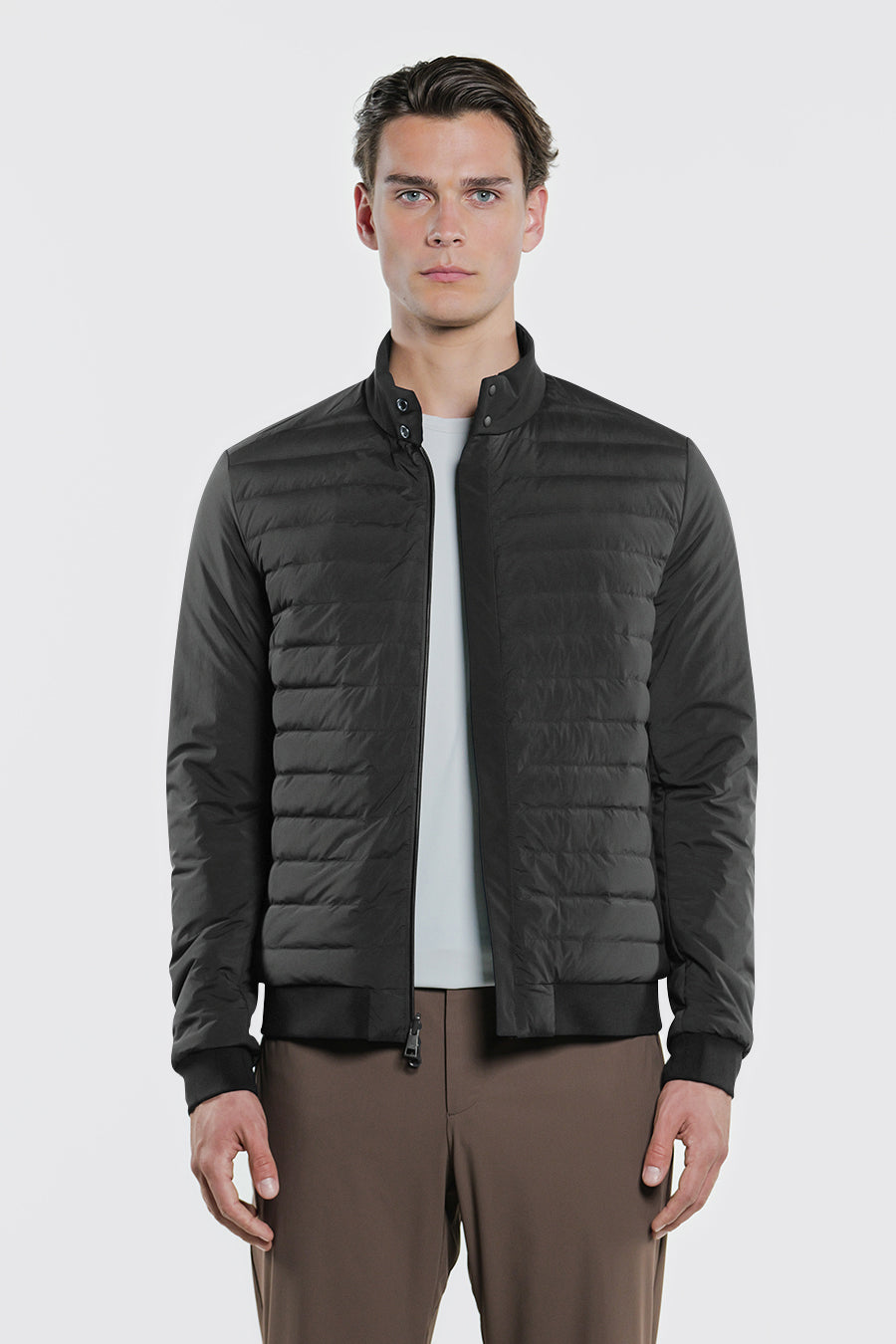 • Inside, a down jacket in stretch technical fabric with side seam pockets and zip closure