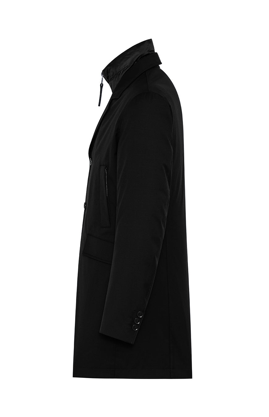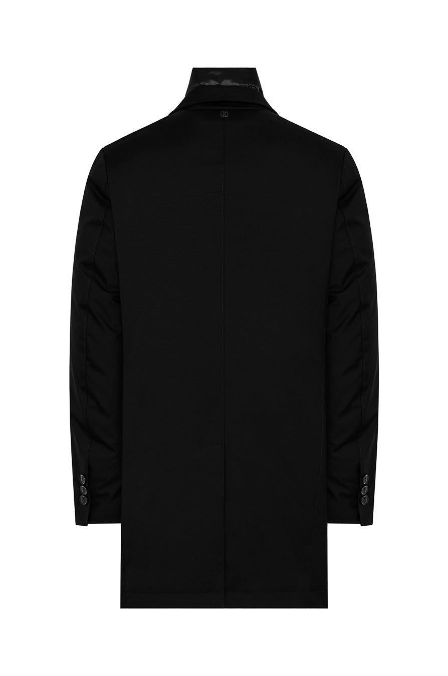 Down padded coat made of technical wool with high-performance back membrane in terms of waterproofing and breathability, featuring a detachable bib with stand collar and zip closure. Front closure with buttons, centrai vent at the back bottom closed by a hidden snap button and side flap pockets and hand warmer welt pockets. Adjustable cuff with slit and closure with 3 buttons. Multifunctional pockets with reflective details on the inside.