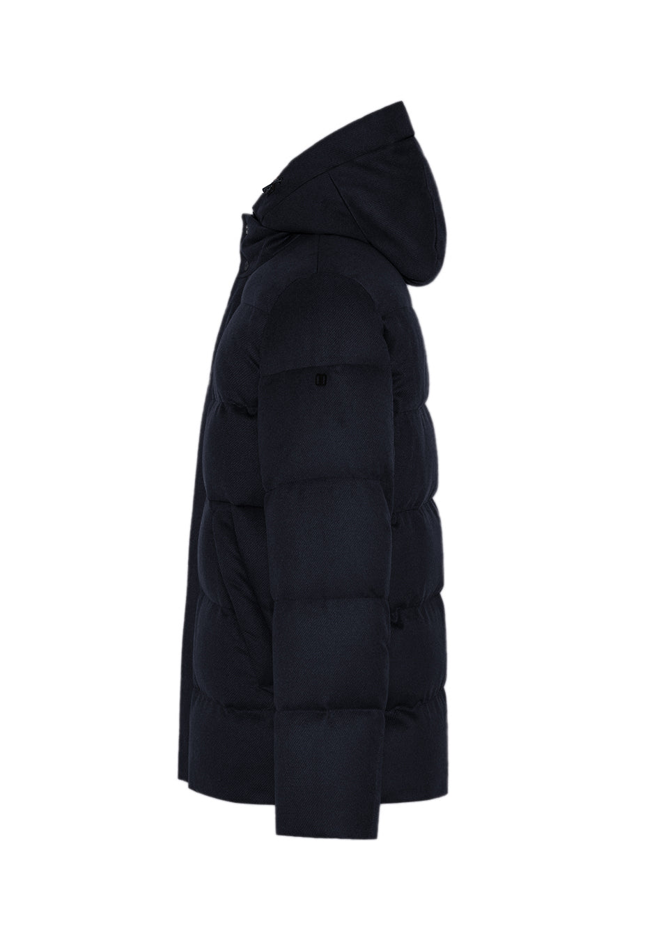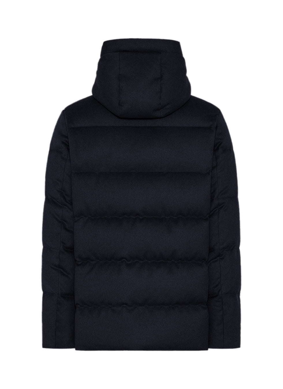Quilted down jacket in technical wool with standing collar and zippered detachable hood which is adjustable with drawstring. Double front closure with double-slider zipper and hidden snap buttons, windproof side pockets with hidden zipper and elastic cuffs. Neoprene detail with embossed logo on the back of the collar. Inside multi-functional pockets.