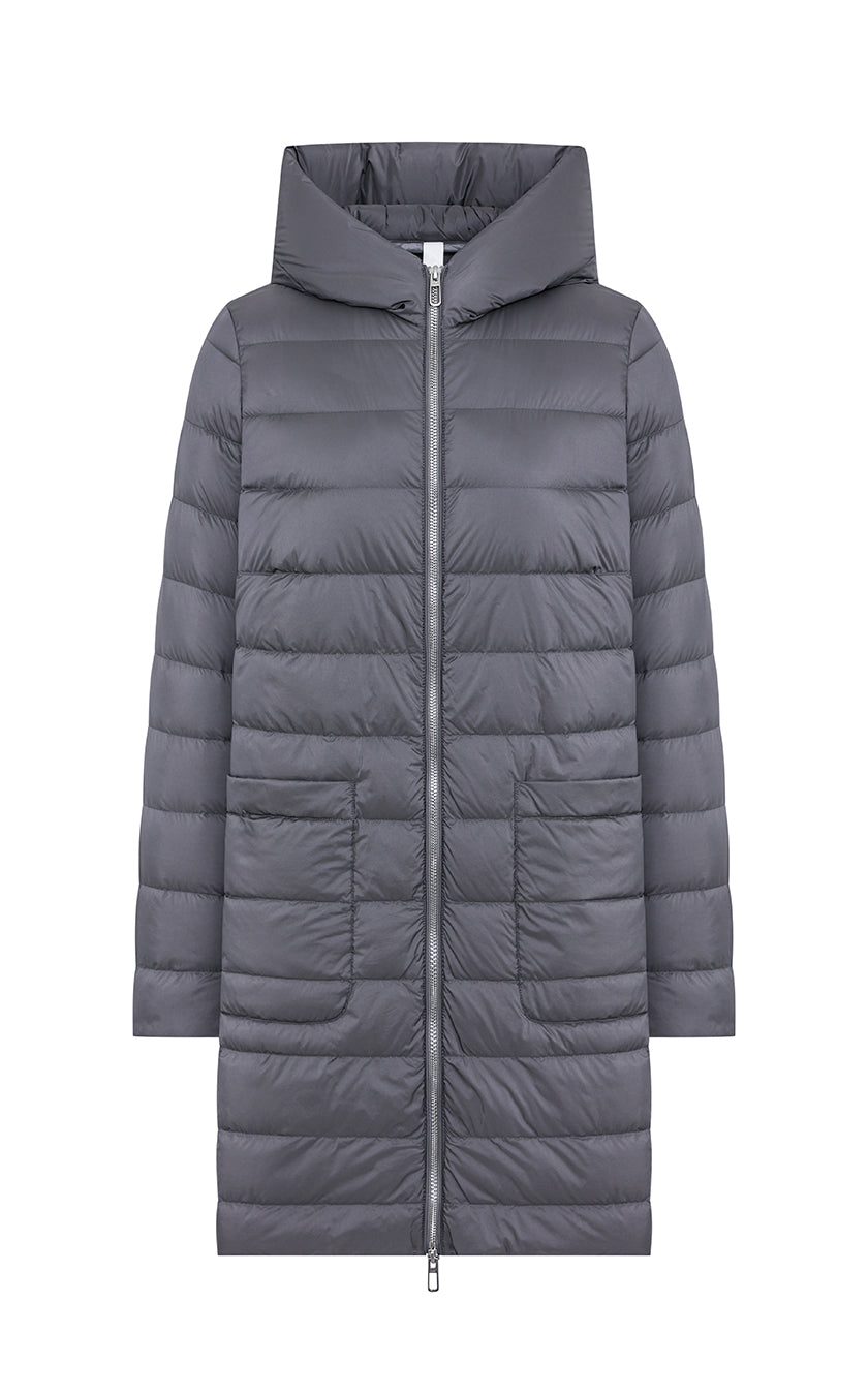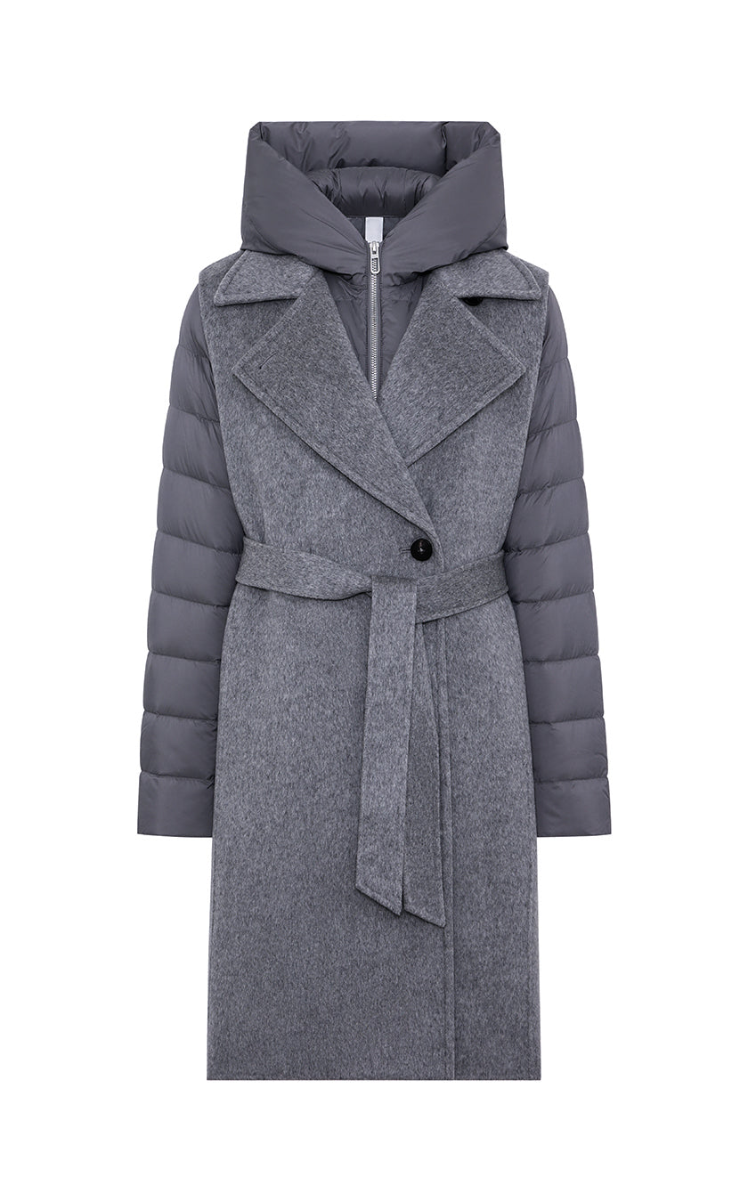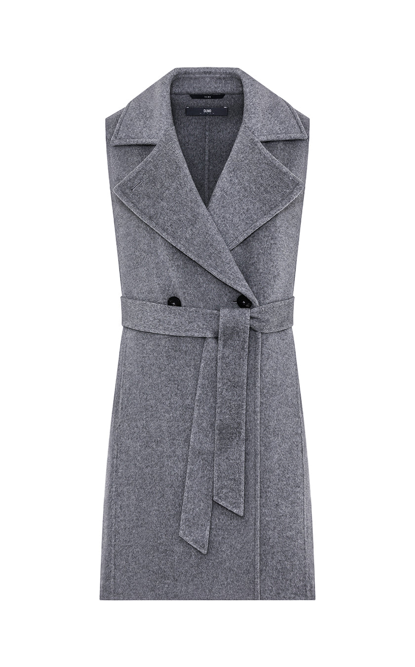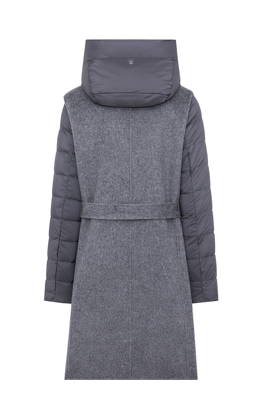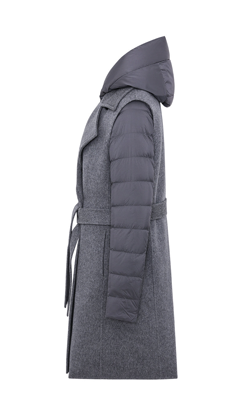 Long double-breasted vest completely unlined belonging to DUNO’s “ATTIC” PROJECT for Luxury Garments segment. The garment is made with a tailor-made double-layer fabric in wool and cashmere. External belt to emphasize the waist, front button closure and side pockets in the side cut. Inside, a down jacket in ultra-lightweight technical fabric with down padding that can be worn separately, characterized by front zipper closure, hood and patch pockets.