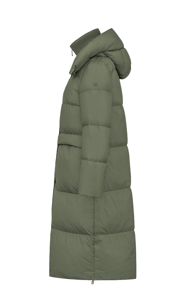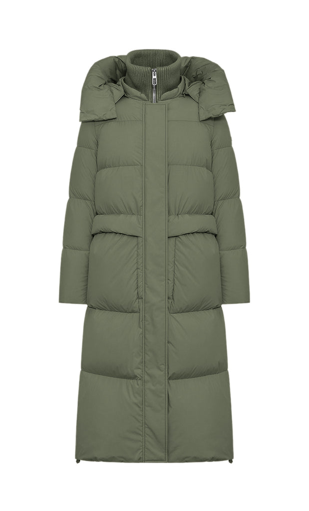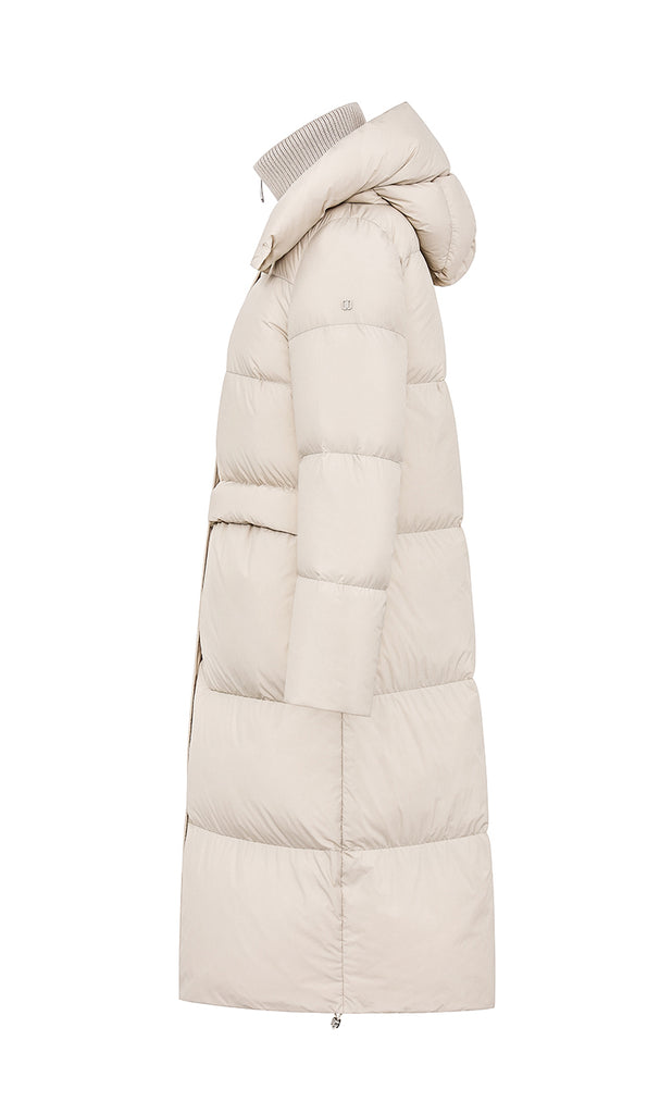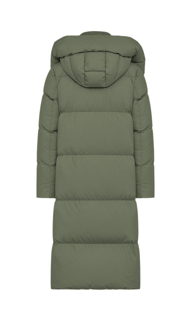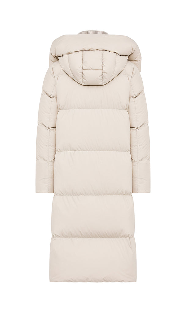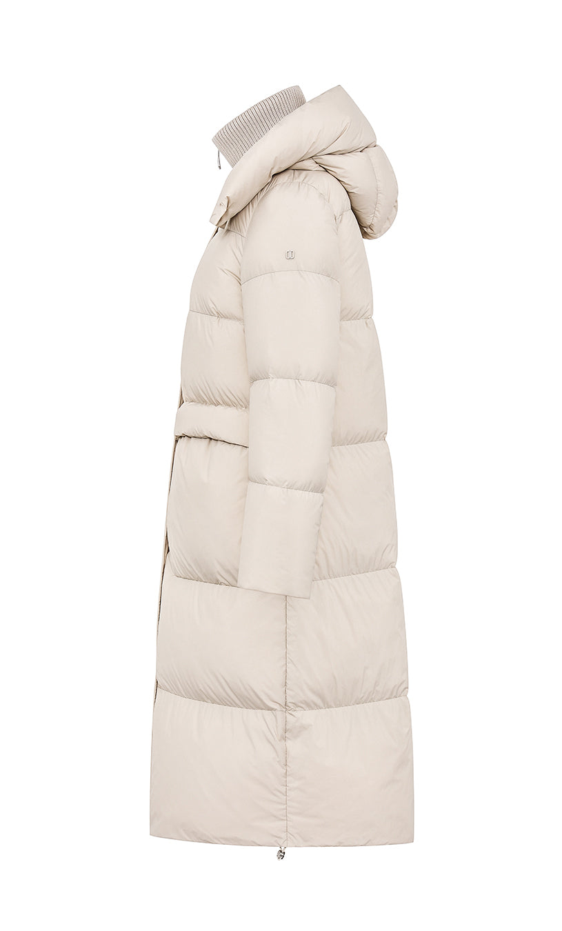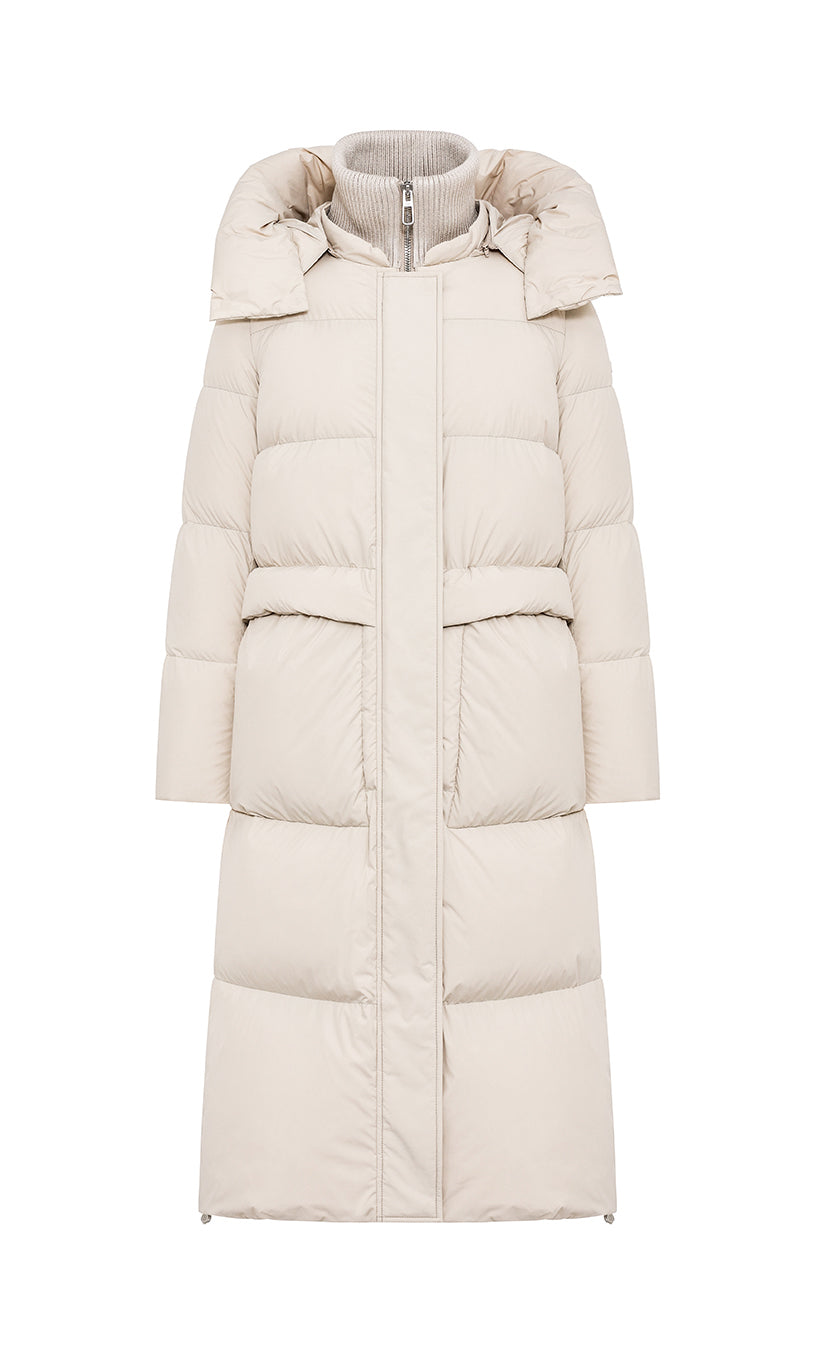 Long down jacket in lightweight microfiber characterized by the combination of a high stand collar in wide-ribbed wool knit and a large hood with magnetic closure, detachable with zip at the outer neckline. Double front closure with double-slider metal zipper and hidden snap buttons, wide front pockets hidden by bellows and inside technical knitted cuff. The drawstring at the bottom makes the fit adjustable.