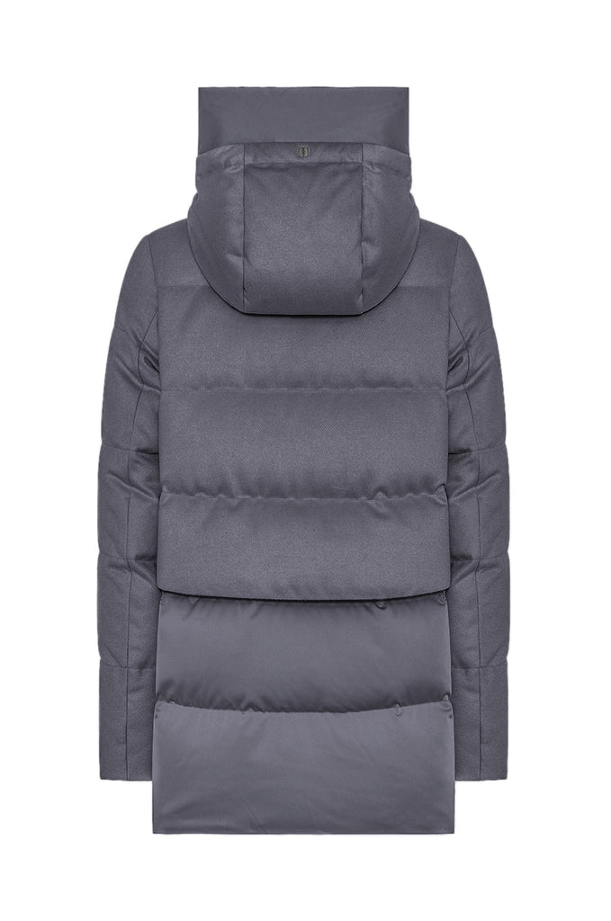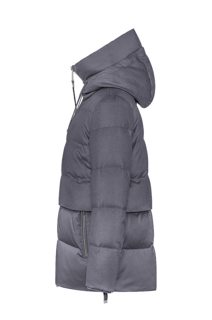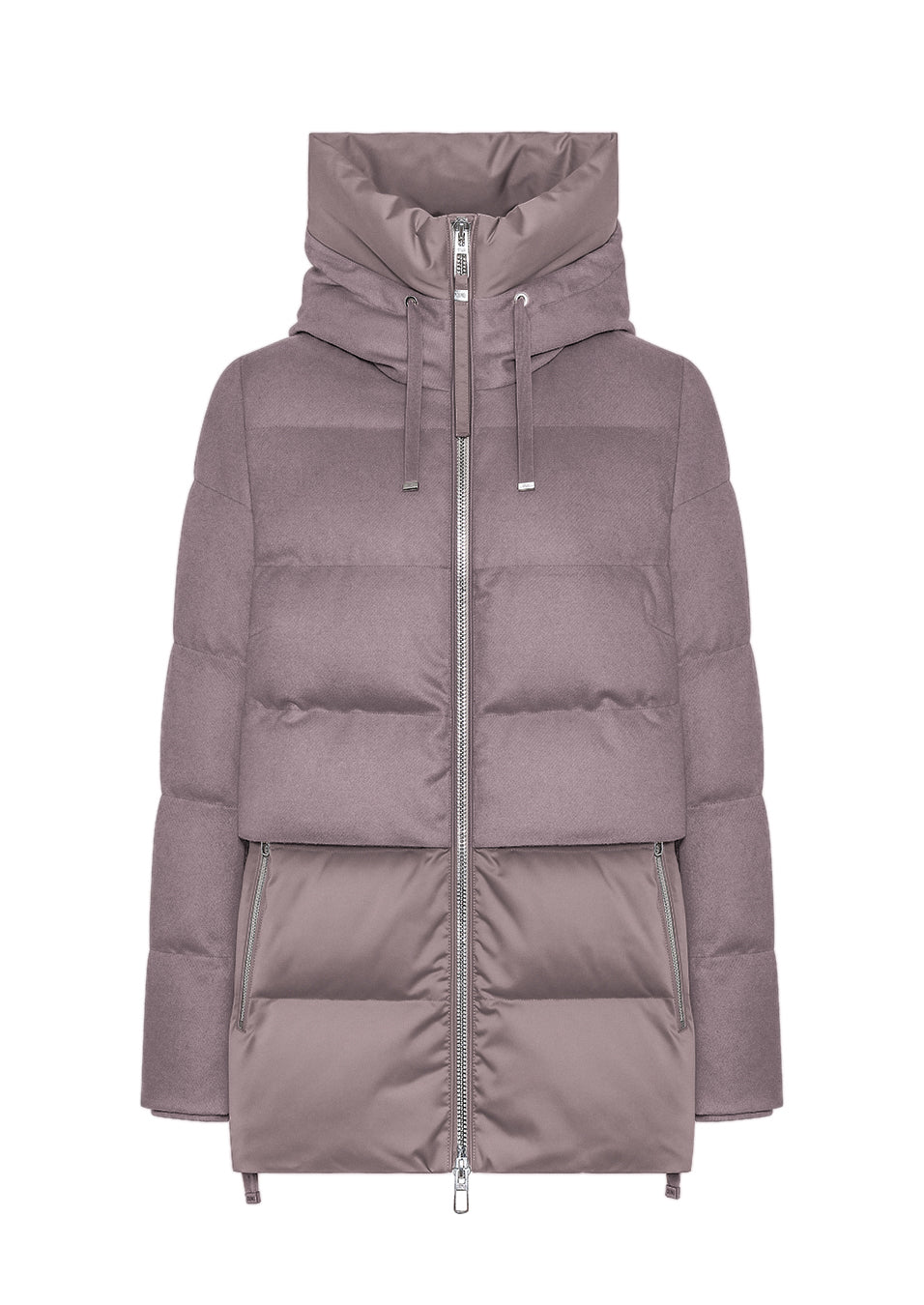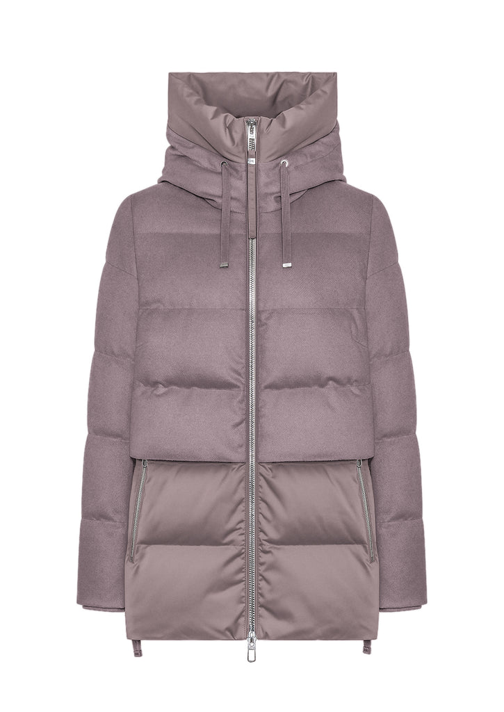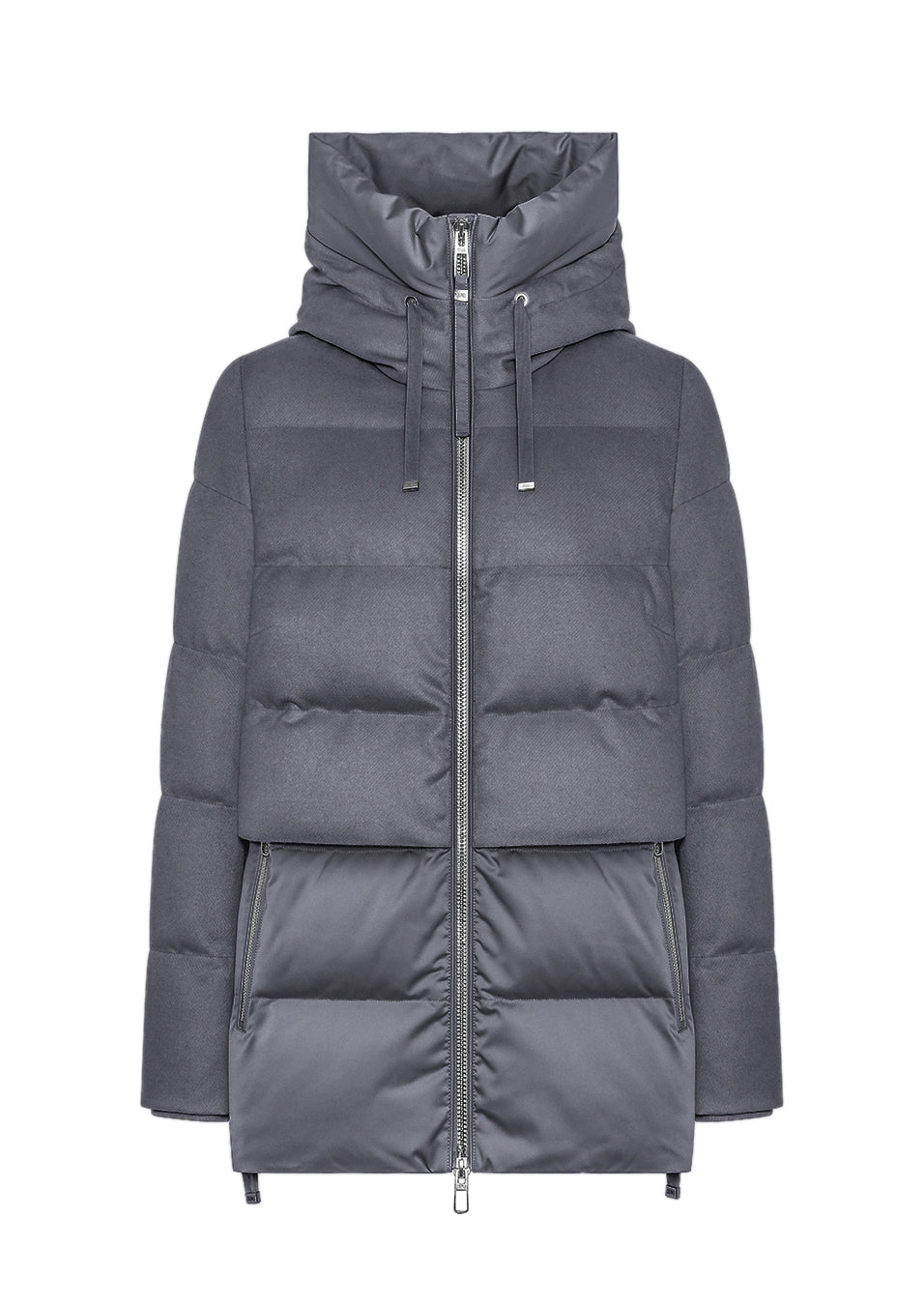 Short bi-material down jacket made with quilted technical wool and satin. The garment features a wide adjustable padded hood with drawstring, front closure with double-slider metal zipper and side pockets with zipper closure. Drawstring at the bottom to adjust the fit and inner cuff in technical knit.