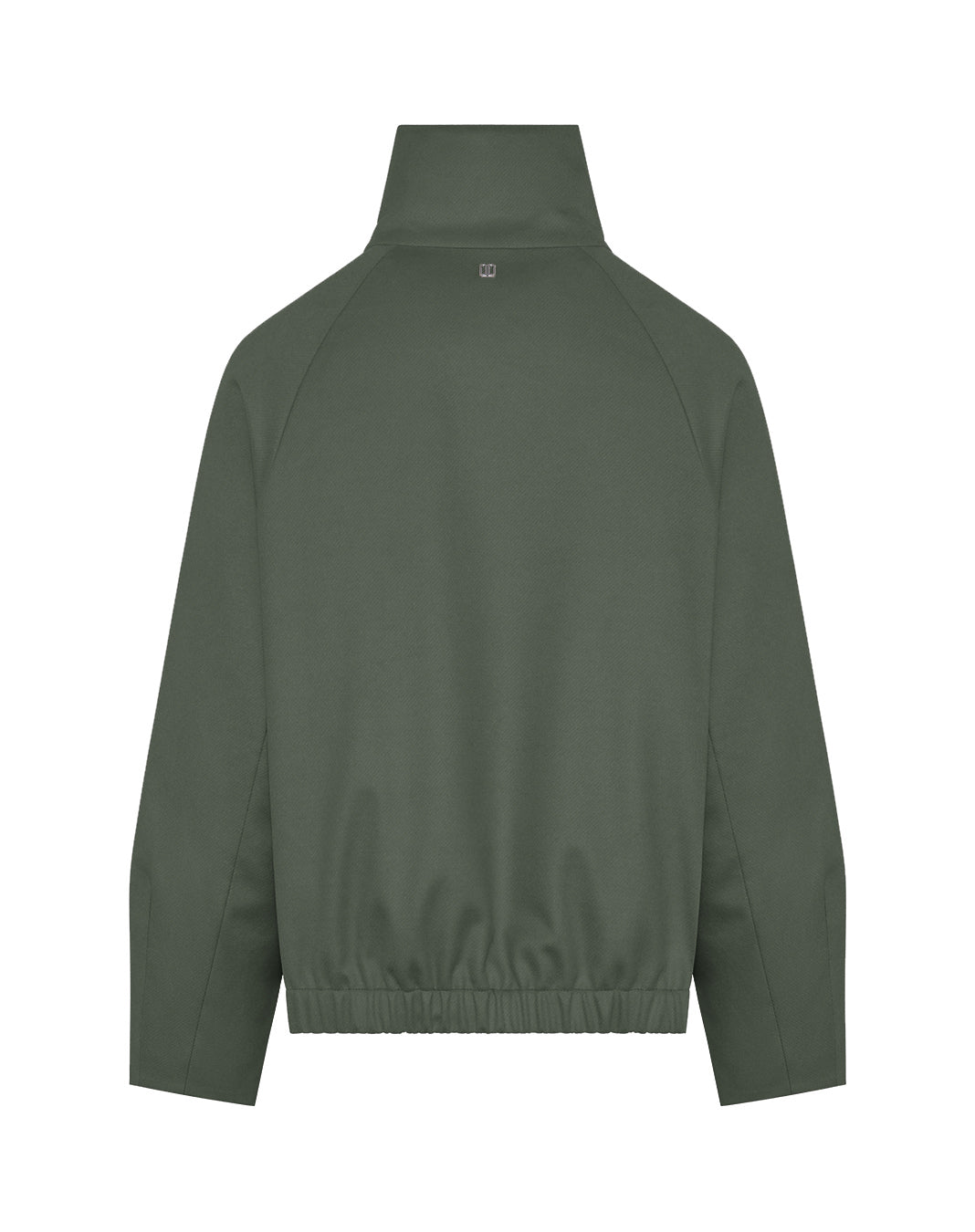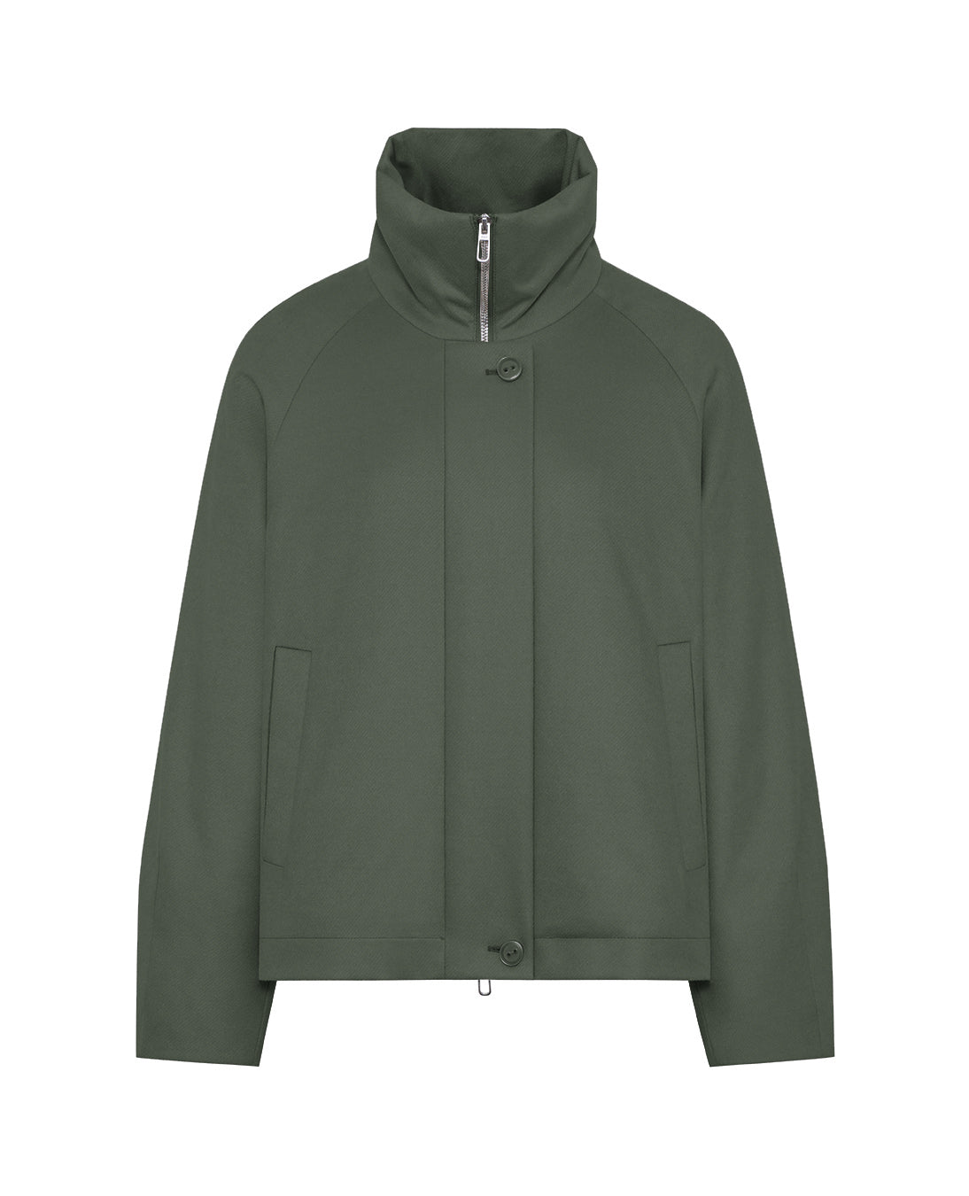 Bomber with stand collar made with technical wool with down padding, characterized by front closure with full-length double slider zipper, hidden by a wide flap with buttons. Hidden elastic on the back bottom hem, side welt pockets and raglan sleeves with voluminous effect due to the bottom sleeve seams.