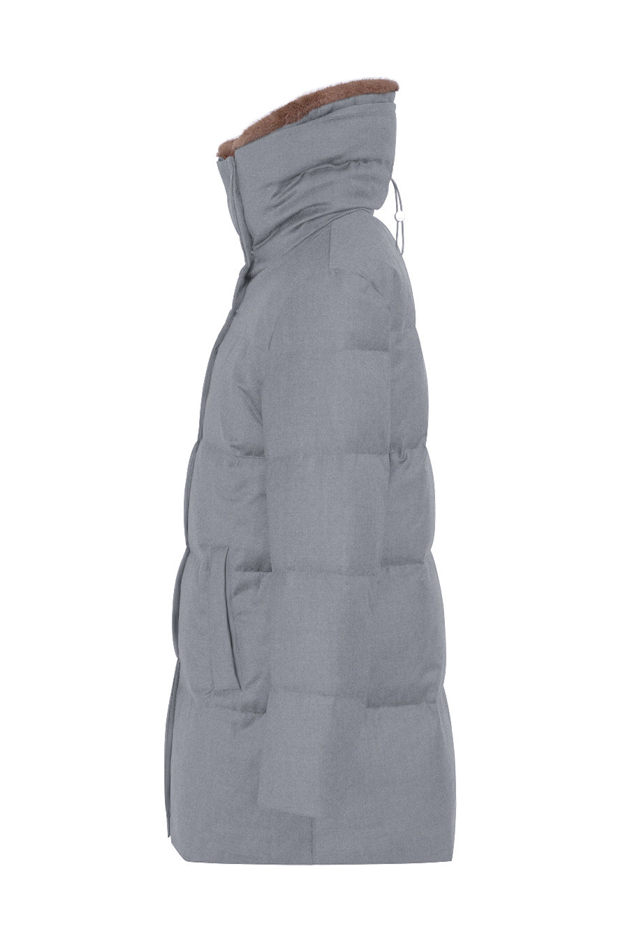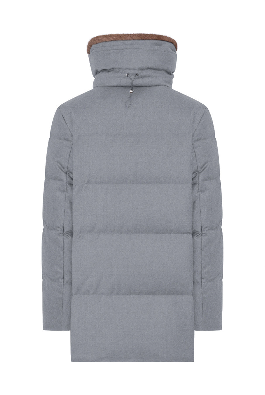Down jacket in pure wool fabric featuring a wide adjustable collar with drawstring and synthetic fur detail on the inside, detachable through zipper and snap buttons. Front asymmetrical closure with hidden zipper and snap buttons, side welt pockets with snap closure and inside drawstring at the waist to adjust the garment’s fit. The down padding and knitted wool hidden cuffs preserve the microclimate inside the garment.
