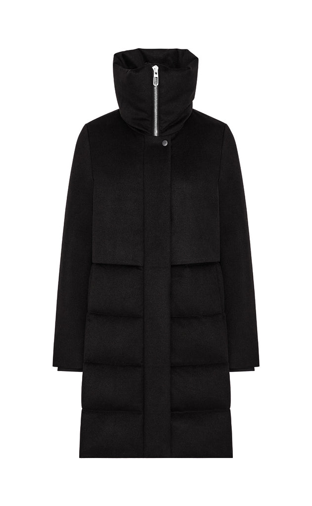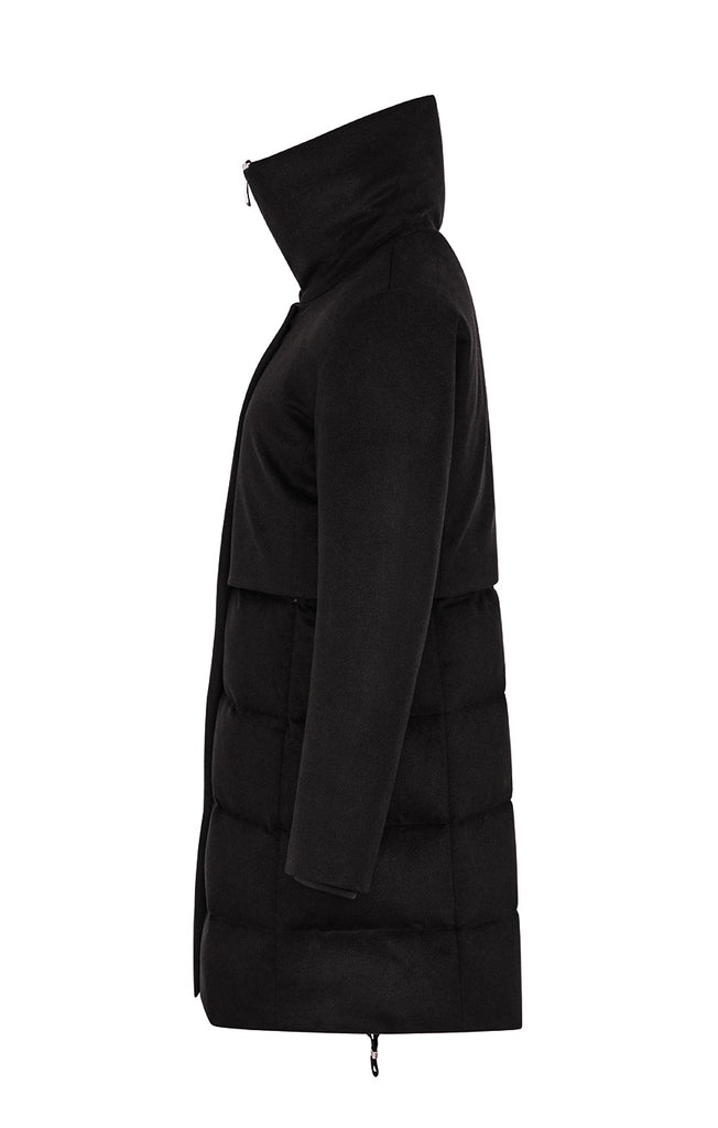 Technical wool down jacket characterized by a combination of smooth and quilted fabric and wide round neck. Front closure with double-slider zipper hidden by a flap with snap buttons closure, hidden side pockets with invisible zipper and inside cuff in technical knit. Coulisse at bottom hem to adjust the fit of the garment.