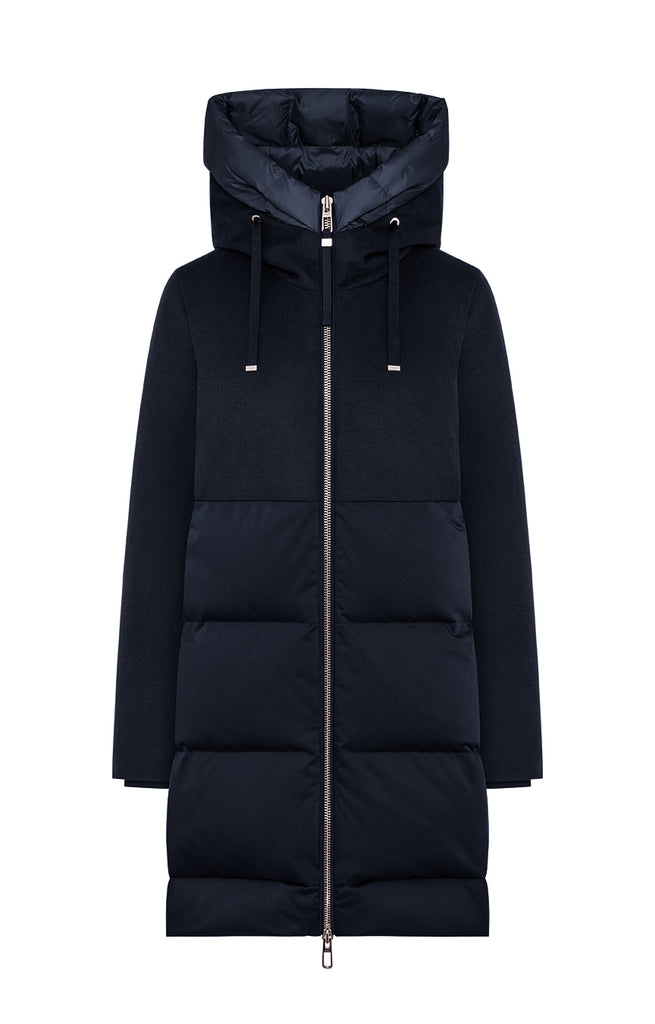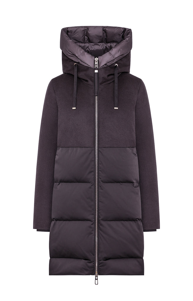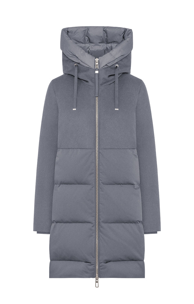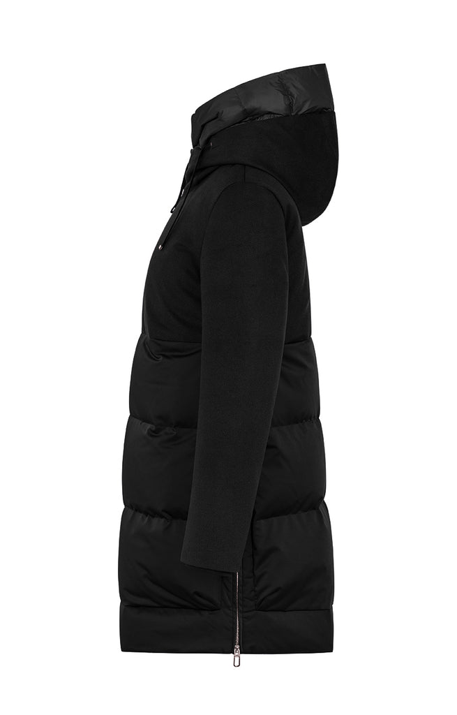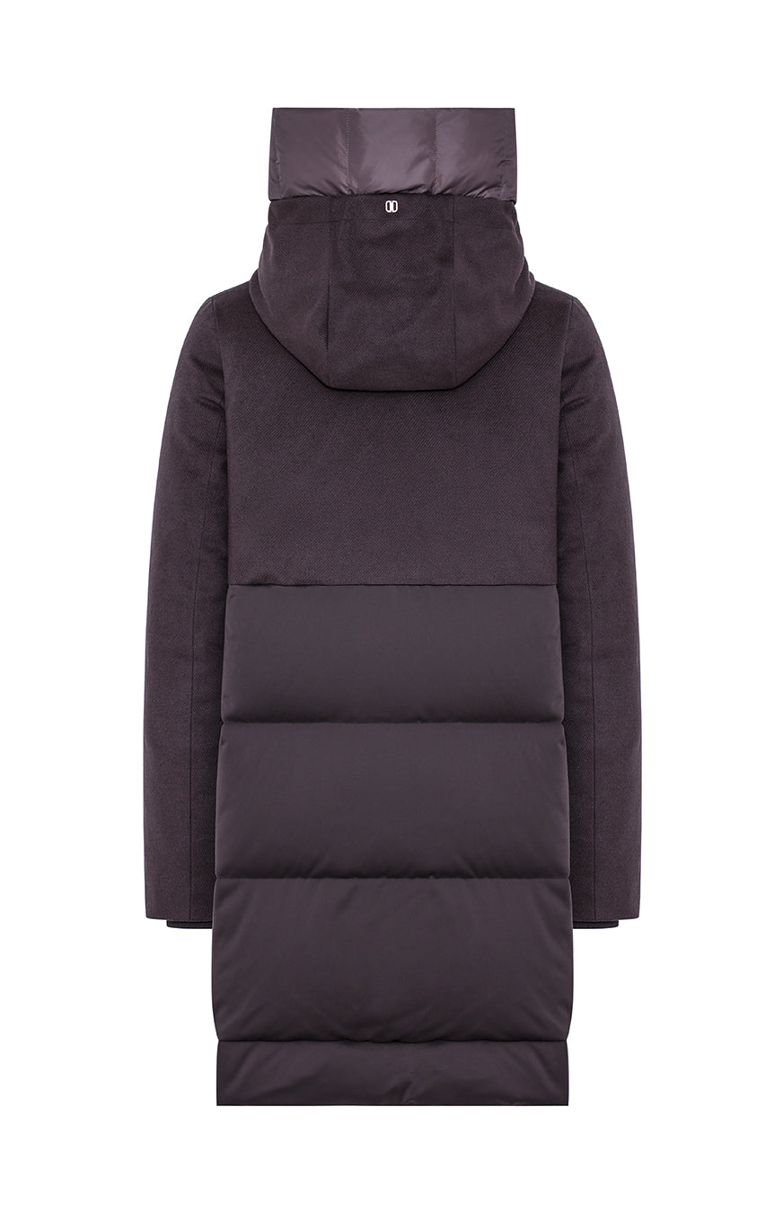 Bi-material down jacket in technical wool and technical fabric with satin structure. The garment features a wide hood with drawstring, with superlight technical quilted fabric trims at the hemline and bellow side zippers that make the garment’s bottom width
