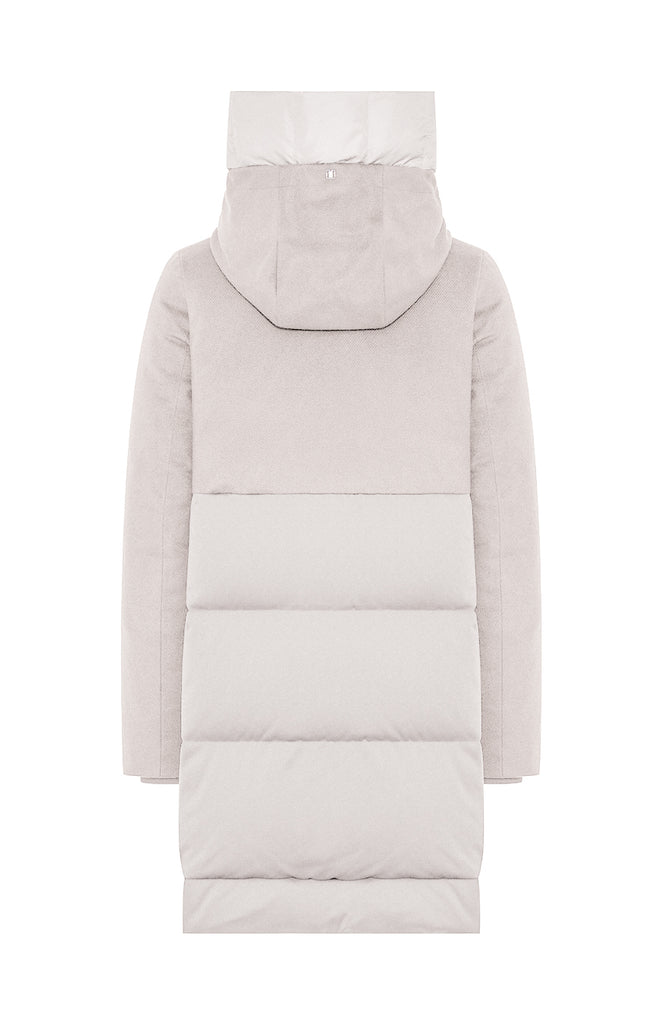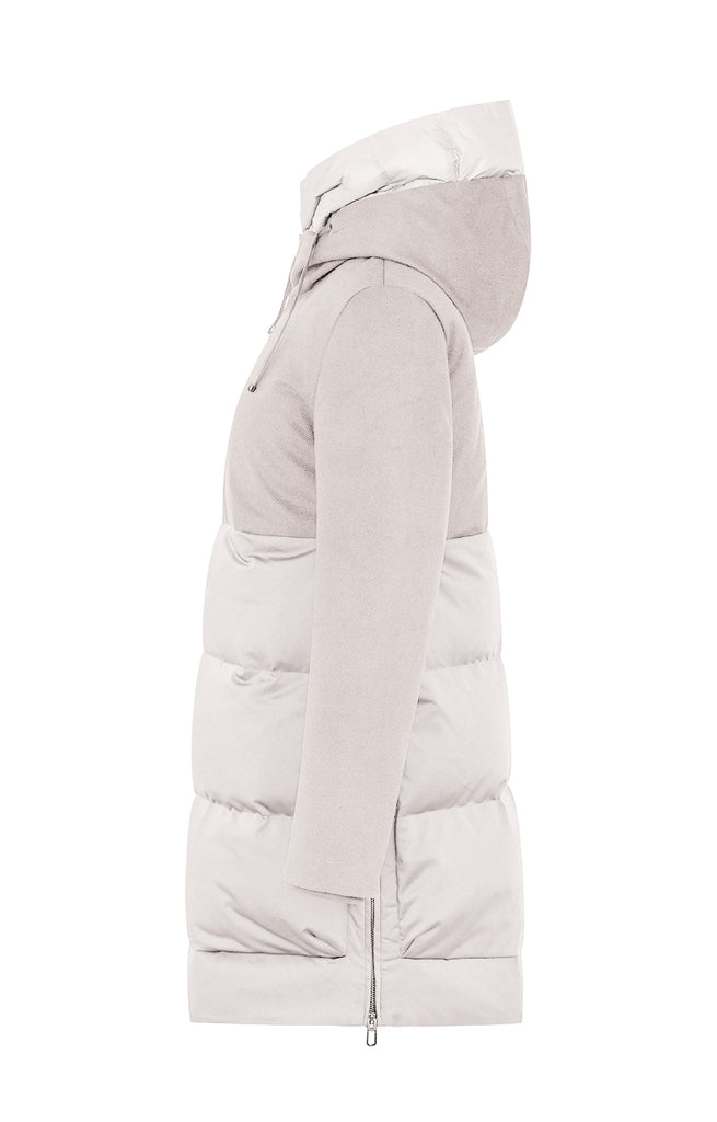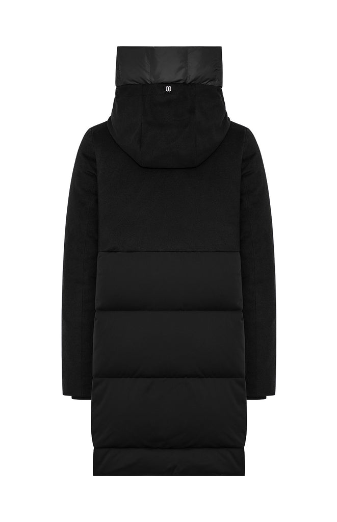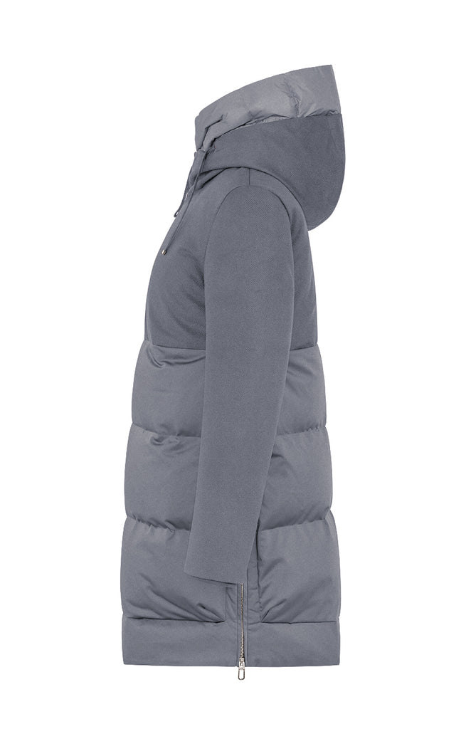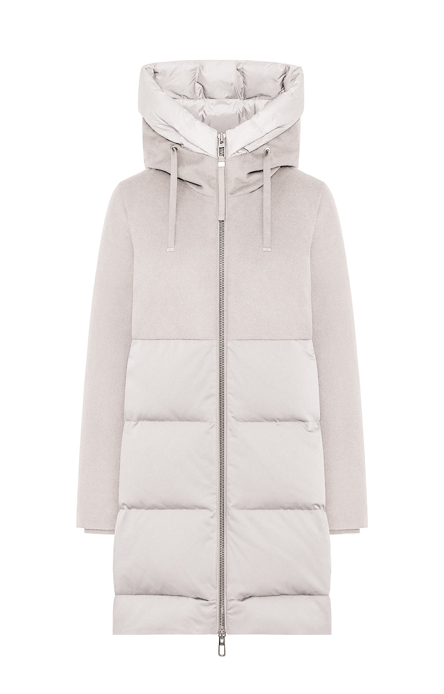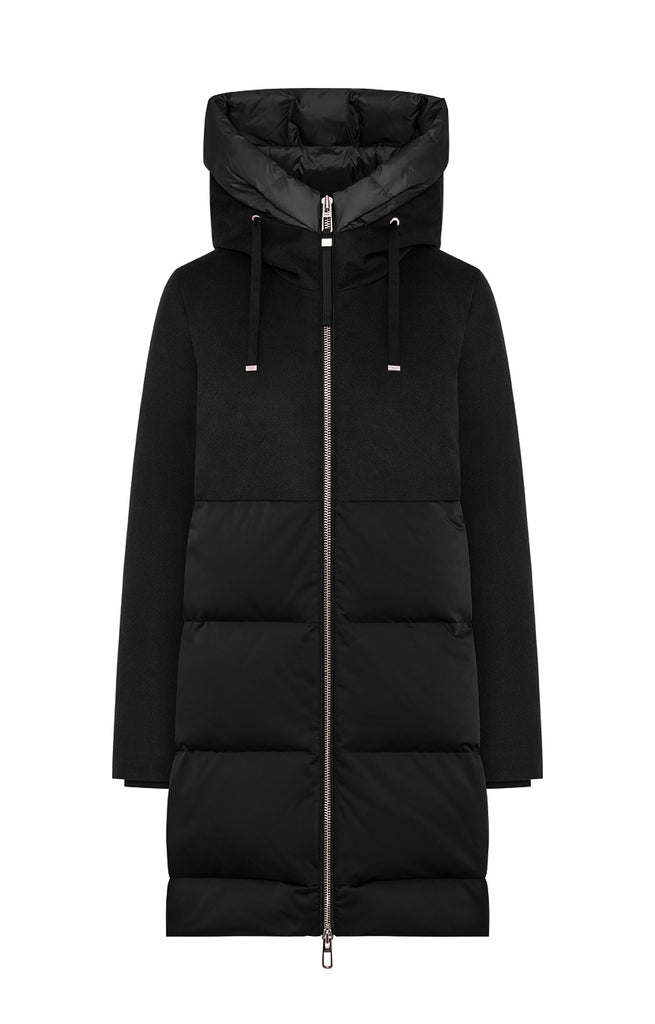 Bi-material down jacket in technical wool and technical fabric with satin structure. The garment features a wide hood with drawstring, with superlight technical quilted fabric trims at the hemline and bellow side zippers that make the garment’s bottom width