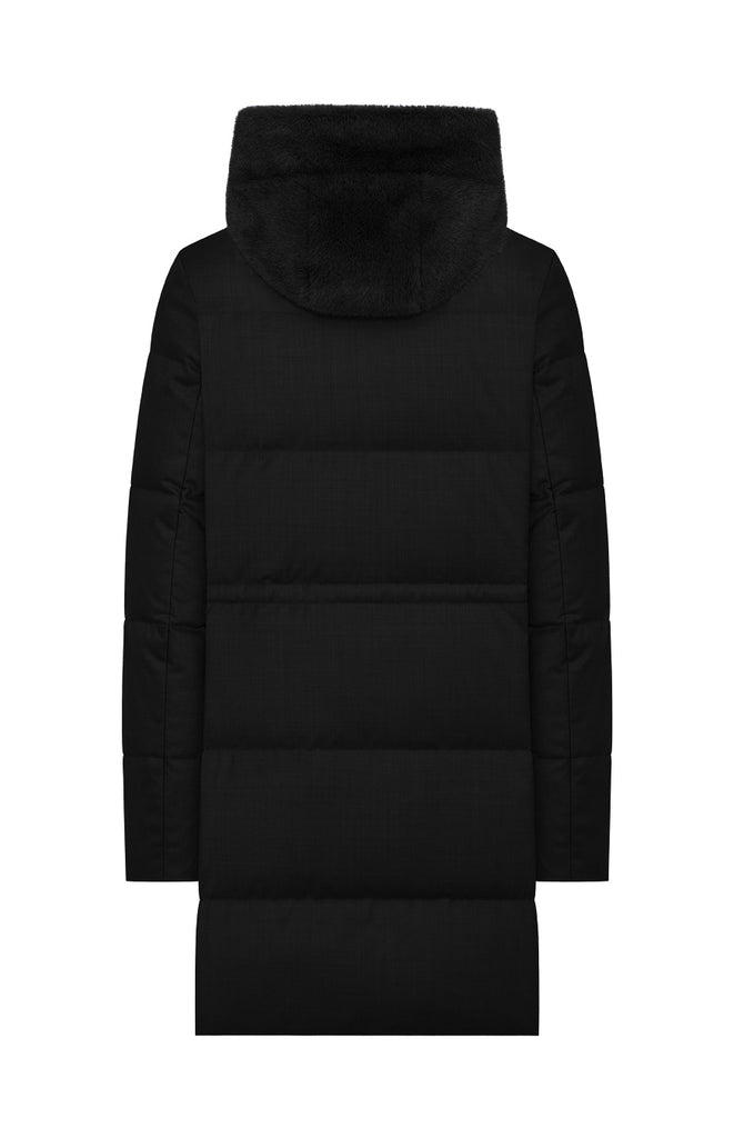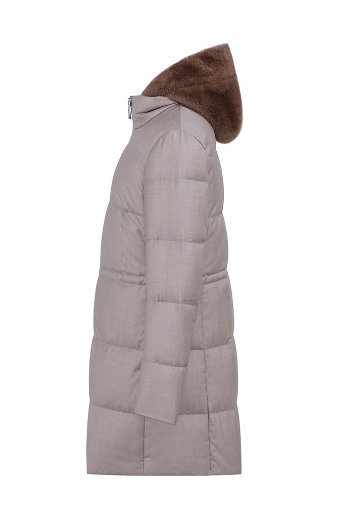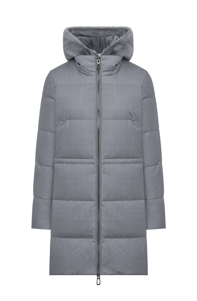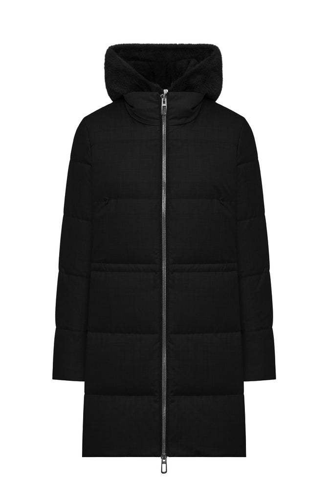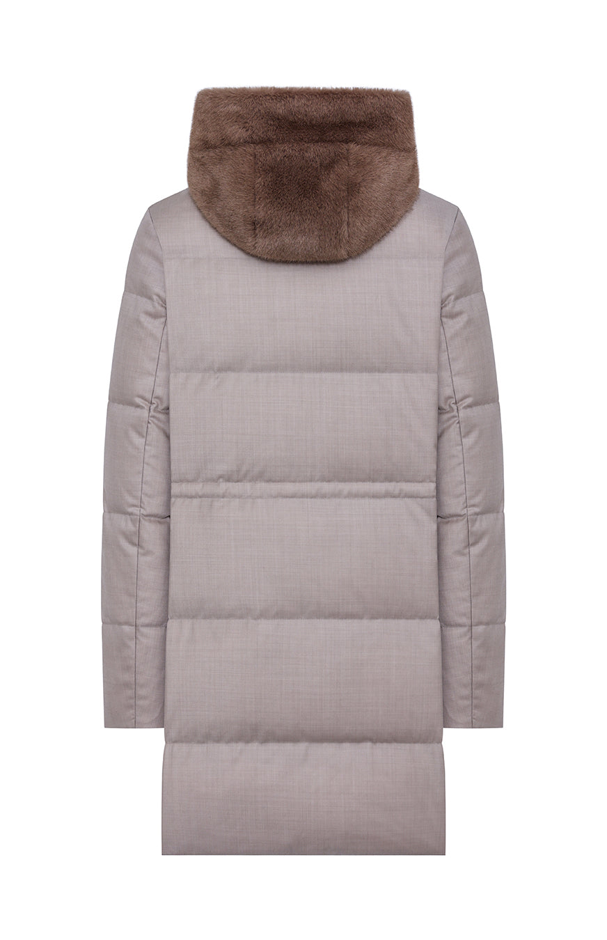 Down jacket in pure wool fabric featuring a detachable hooded bib in faux fur and drawstring at the waist to adjust the fit of the garment. Stand collar, double-slider front zip closure and side pockets with invisible zipper inserted in the side. The down padding and knitted wool hidden cuffs preserve the microclimate inside the garment.