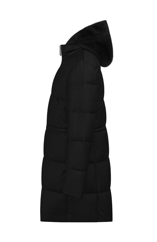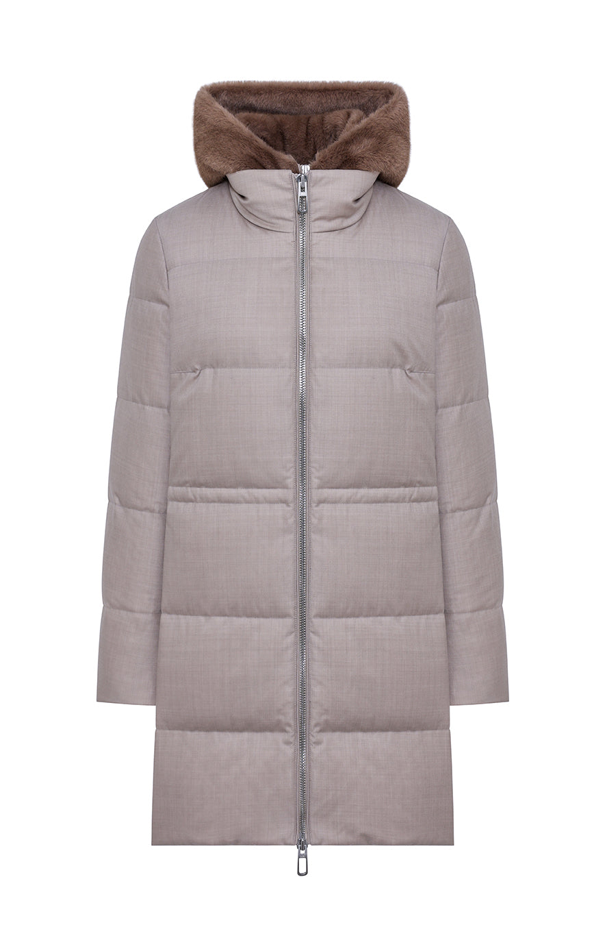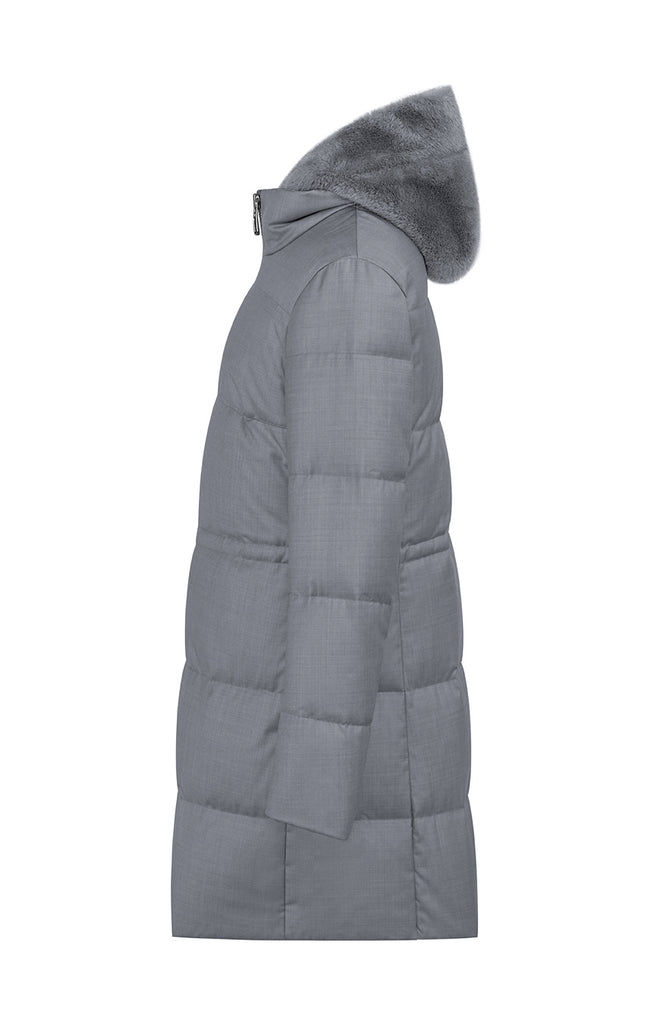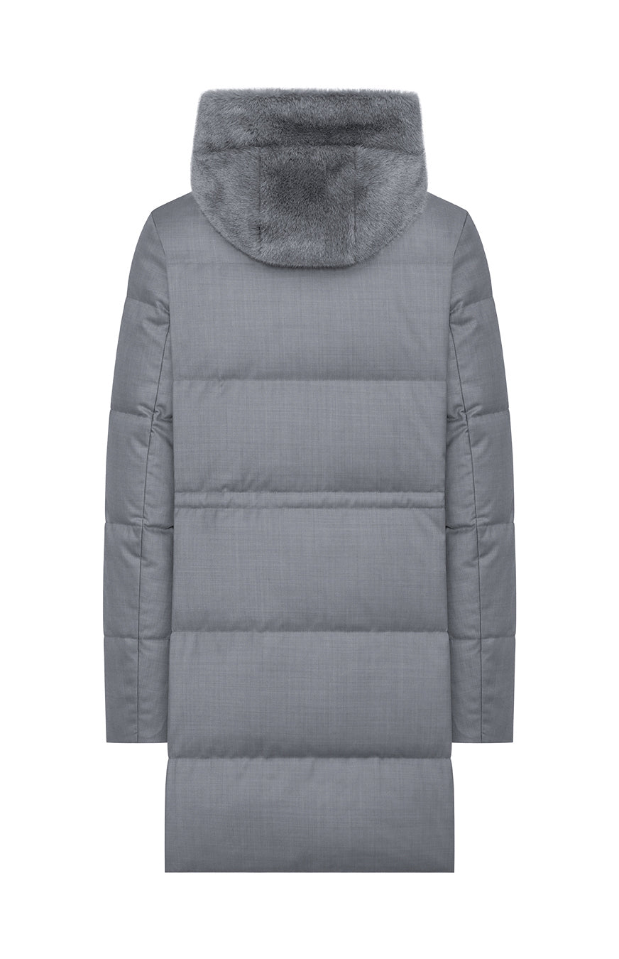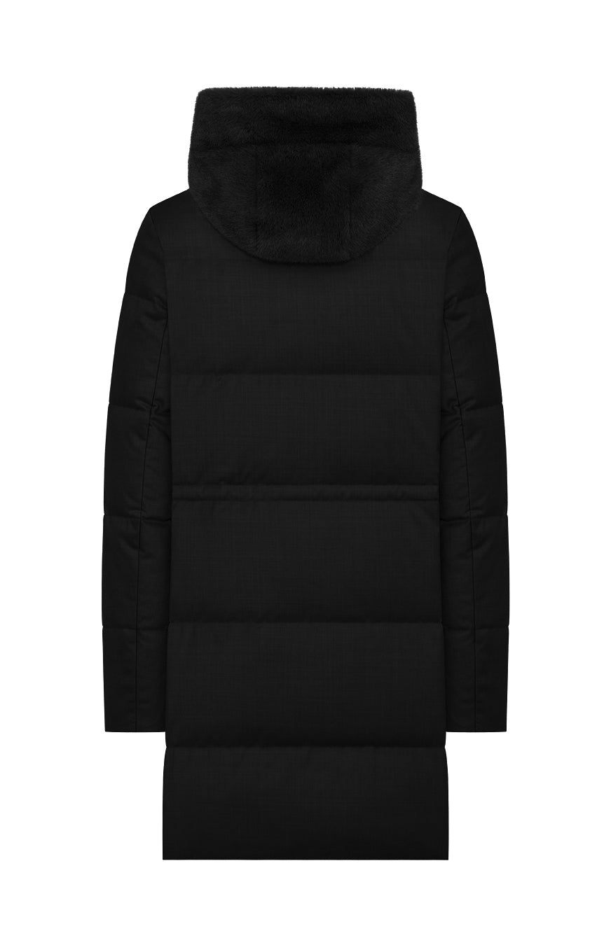 Down jacket in pure wool fabric featuring a detachable hooded bib in faux fur and drawstring at the waist to adjust the fit of the garment. Stand collar, double-slider front zip closure and side pockets with invisible zipper inserted in the side. The down padding and knitted wool hidden cuffs preserve the microclimate inside the garment.