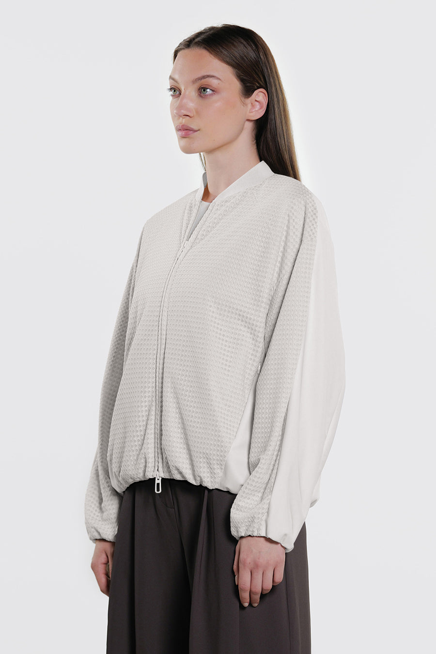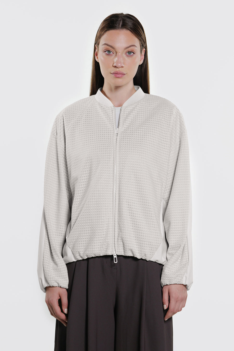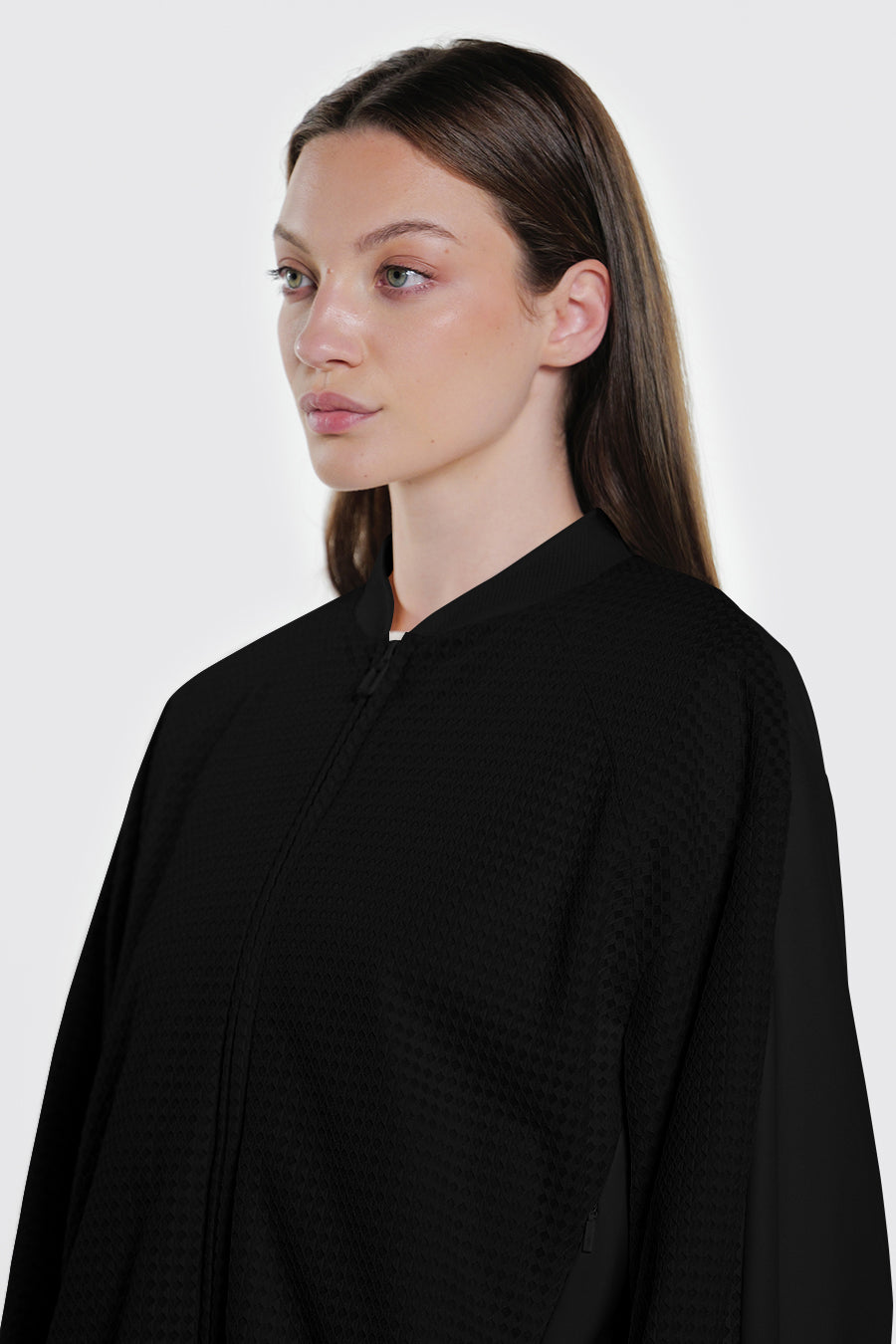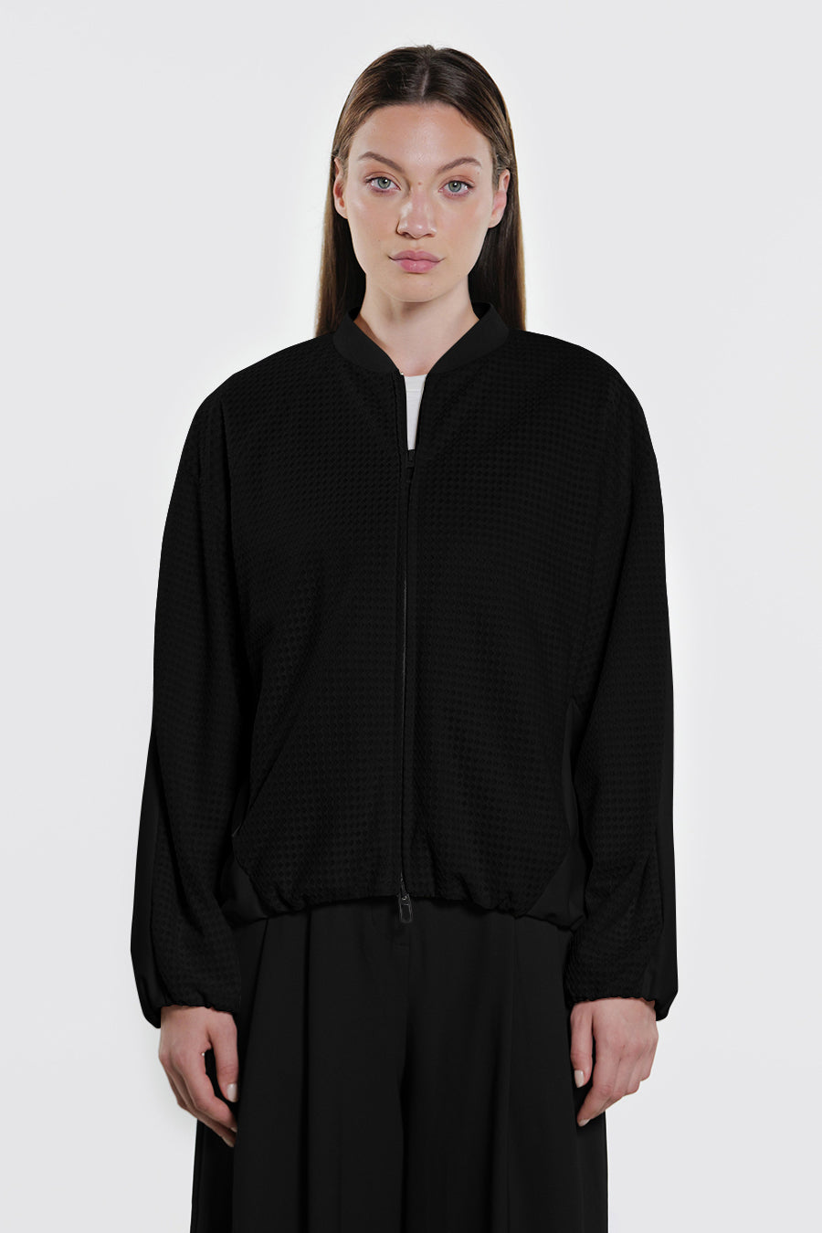 • Giacca corta over realizzata con la combinazione di tessuto a retee tessuto tecnico indemagliabile, entrambi bi-stretch