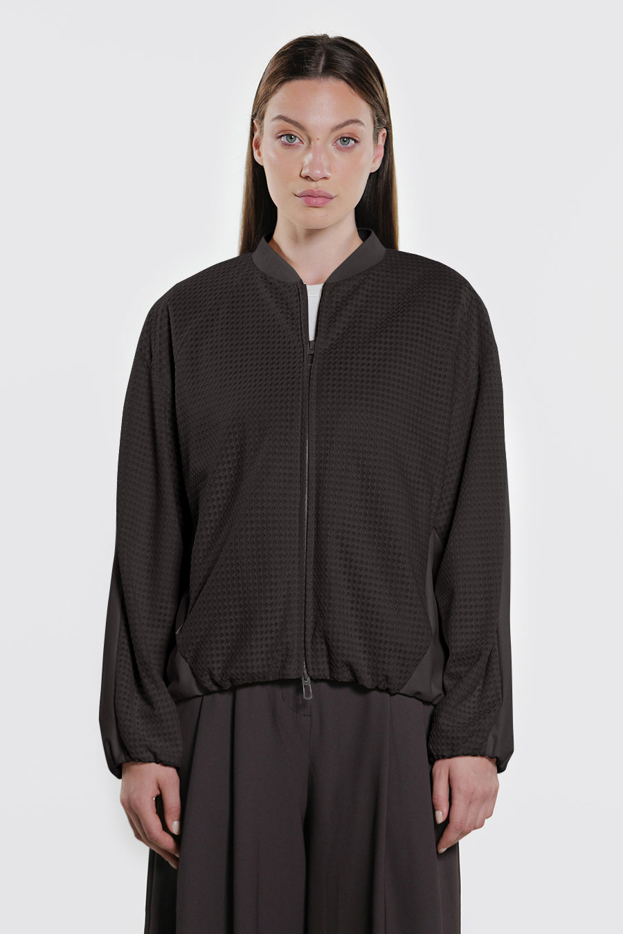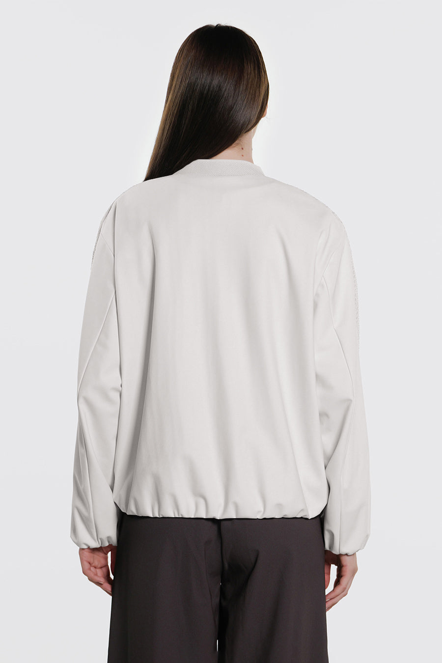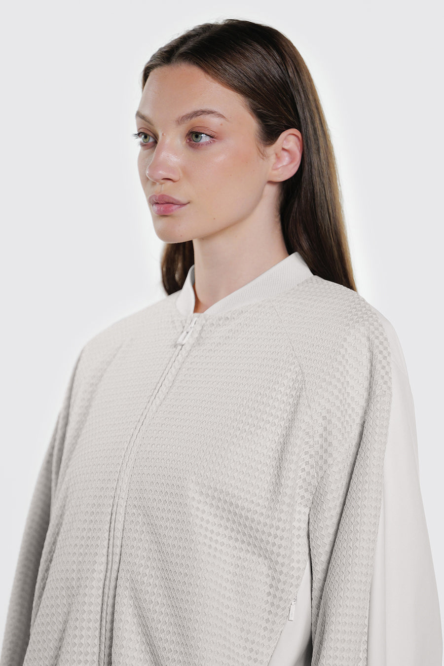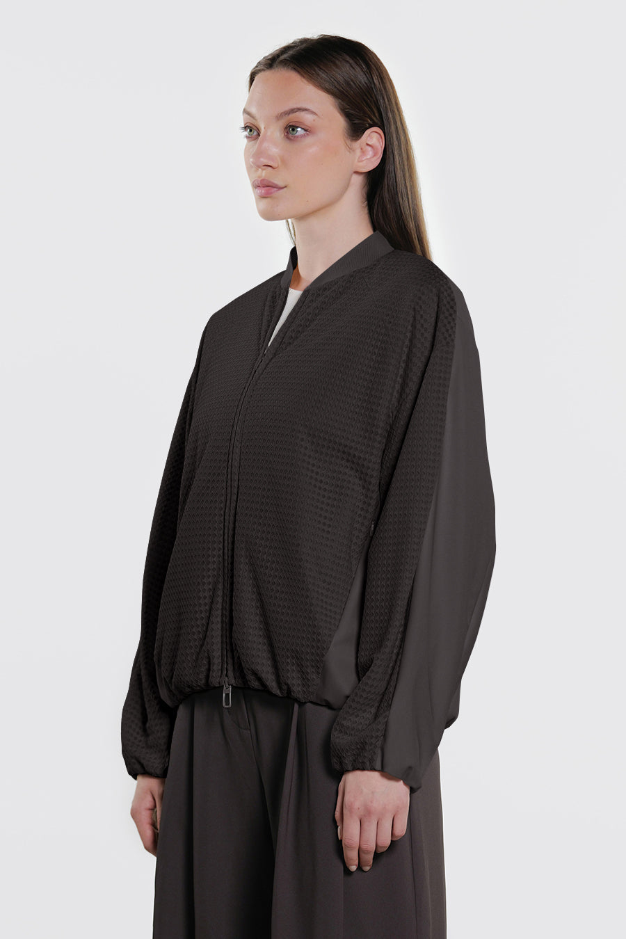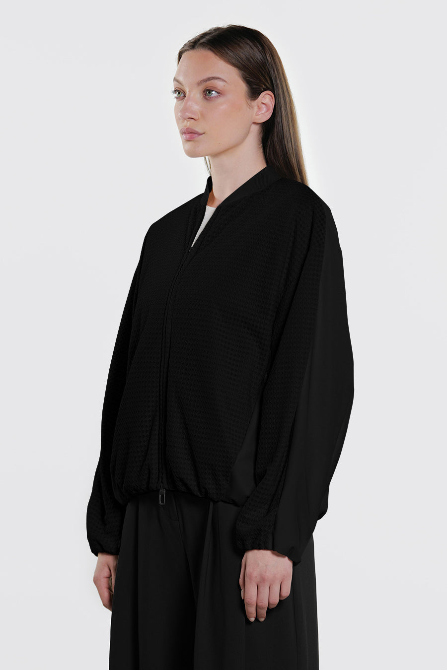 • Giacca corta over realizzata con la combinazione di tessuto a retee tessuto tecnico indemagliabile, entrambi bi-stretch