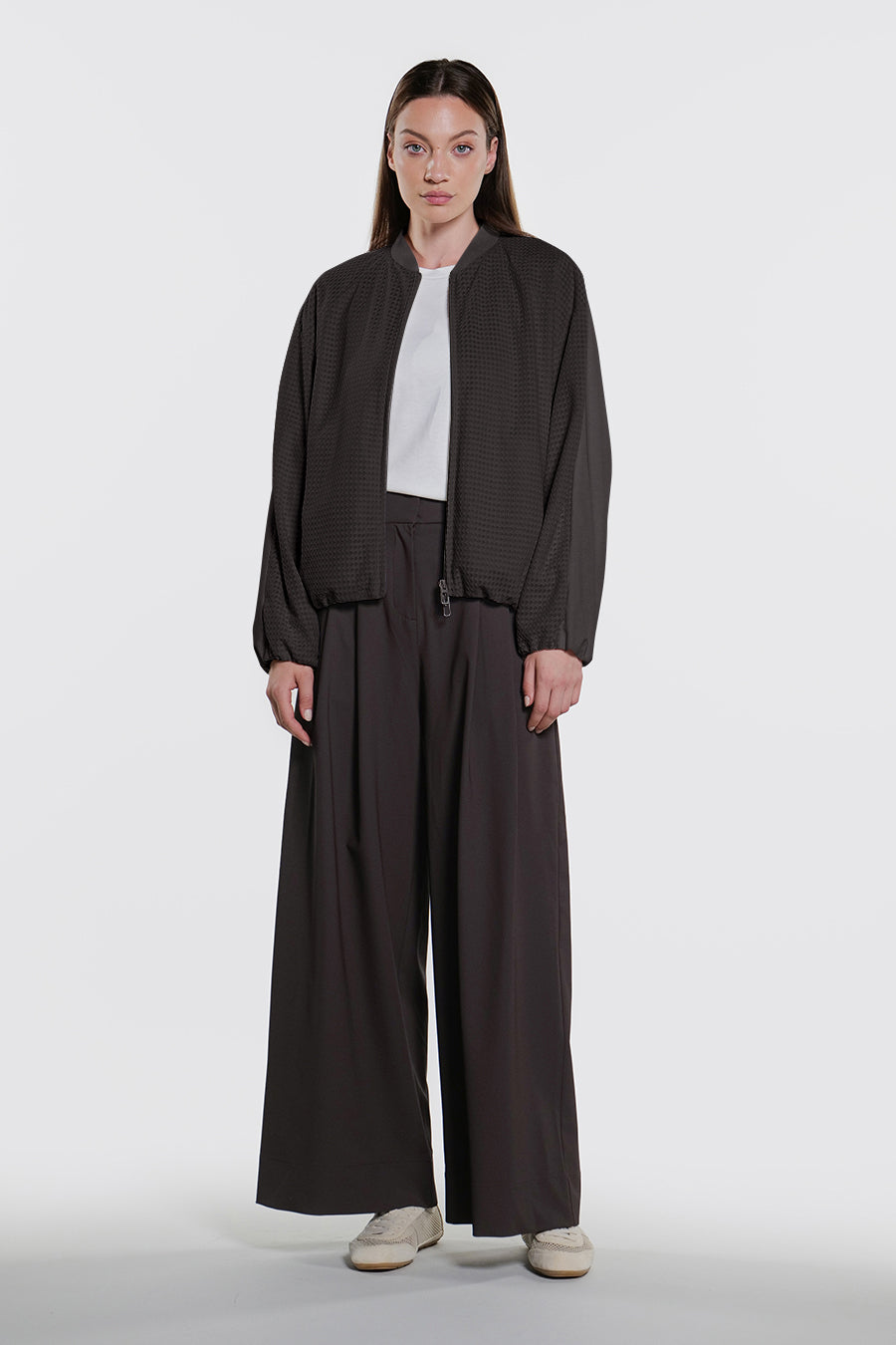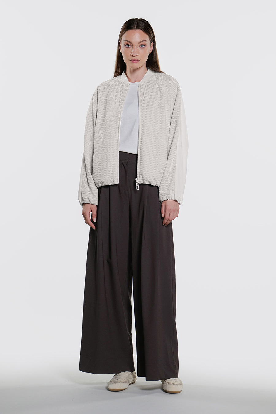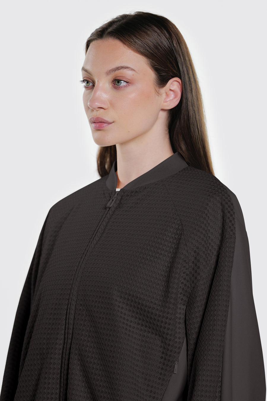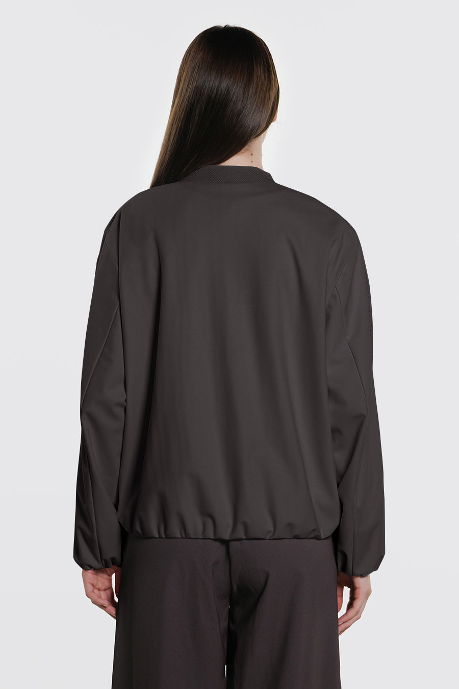 • Giacca corta over realizzata con la combinazione di tessuto a retee tessuto tecnico indemagliabile, entrambi bi-stretch