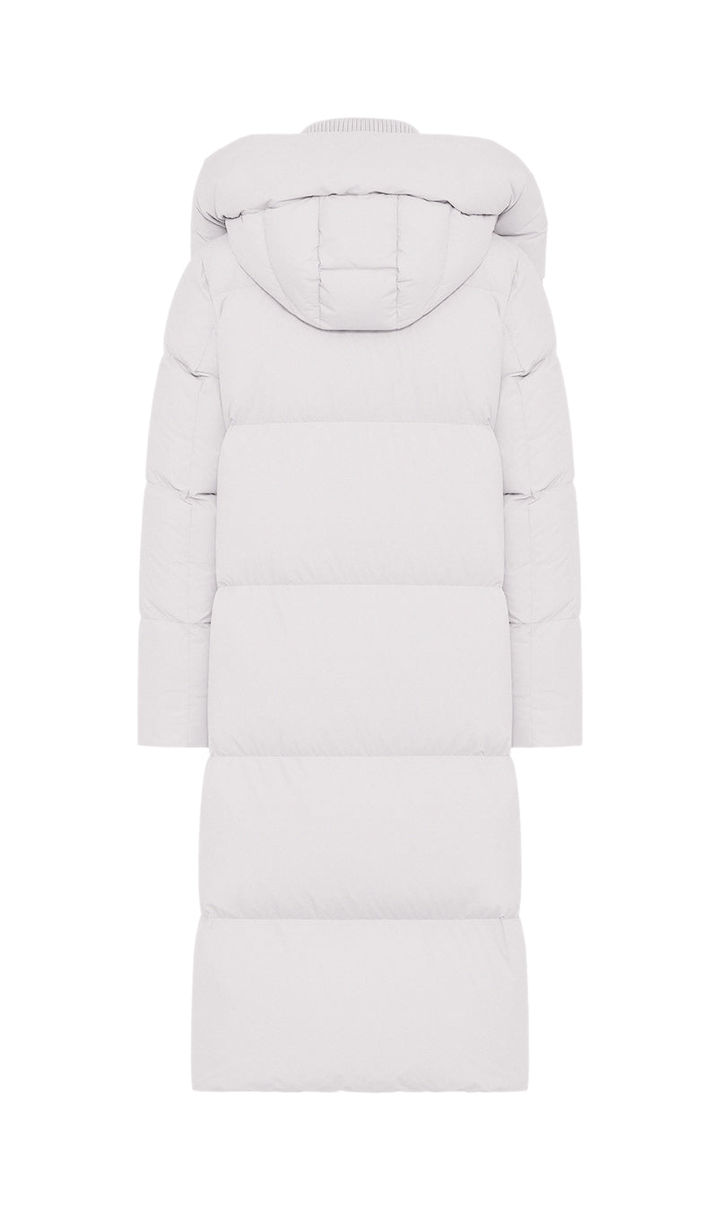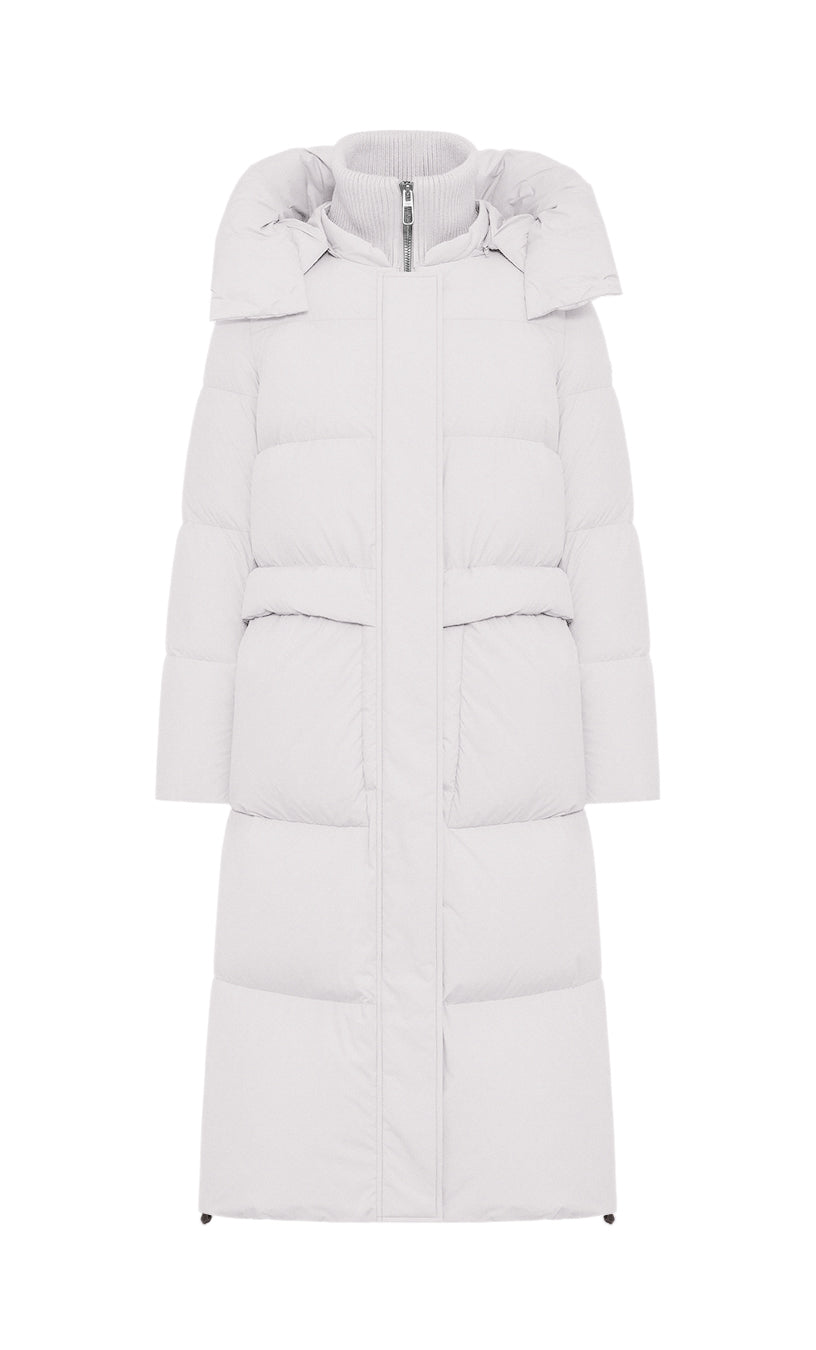 Piumino lungo in microfibra leggera caratterizzato dalla combinazione di collo in piedi alto in maglia di lana a coste larghe ed ampio cappuccio con chiusura magnetica, staccabile con zip allo scollo esterno. Doppia chiusura frontale con zip metallica doppio