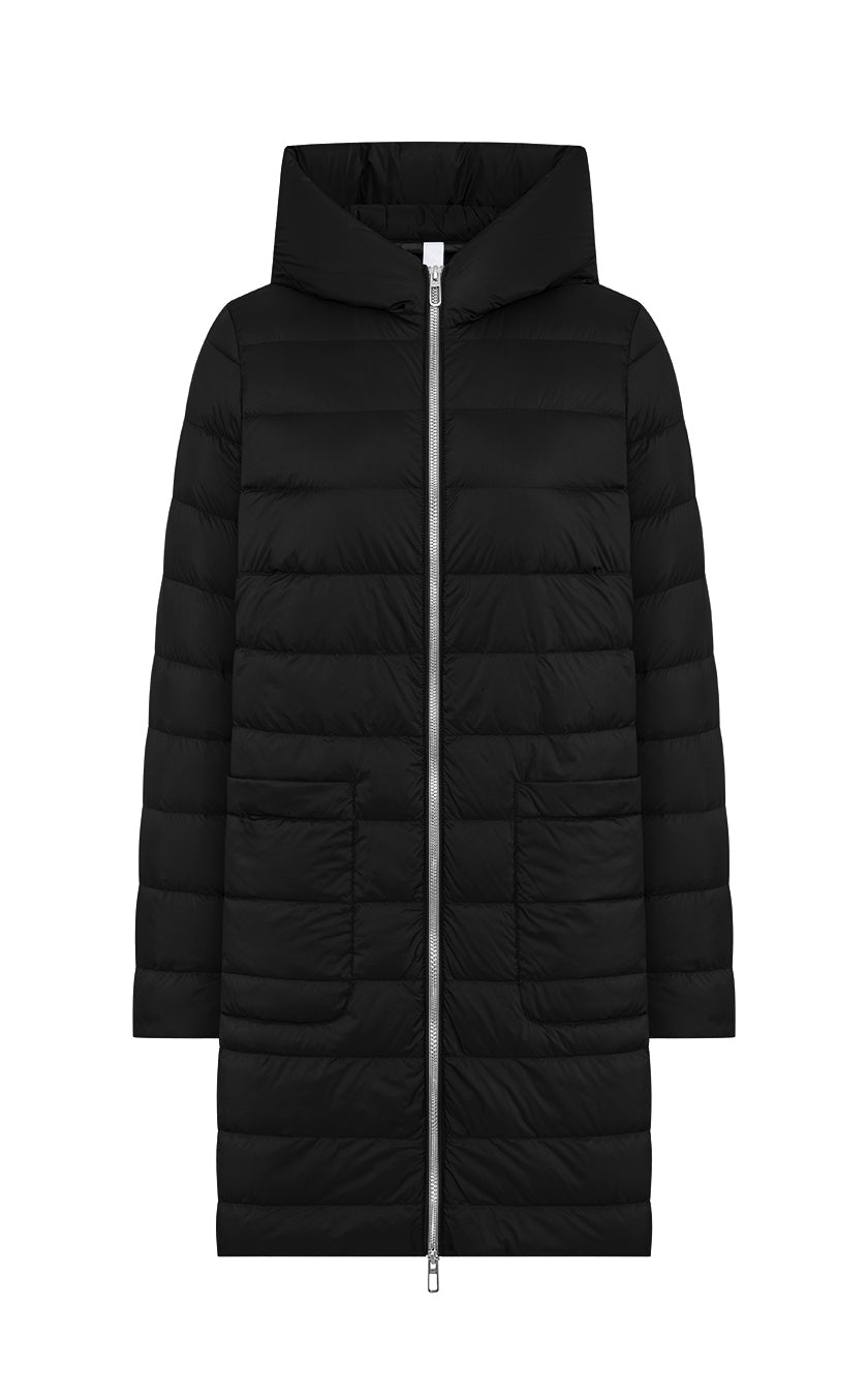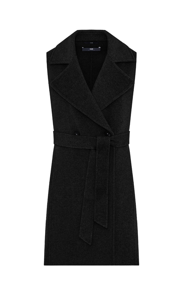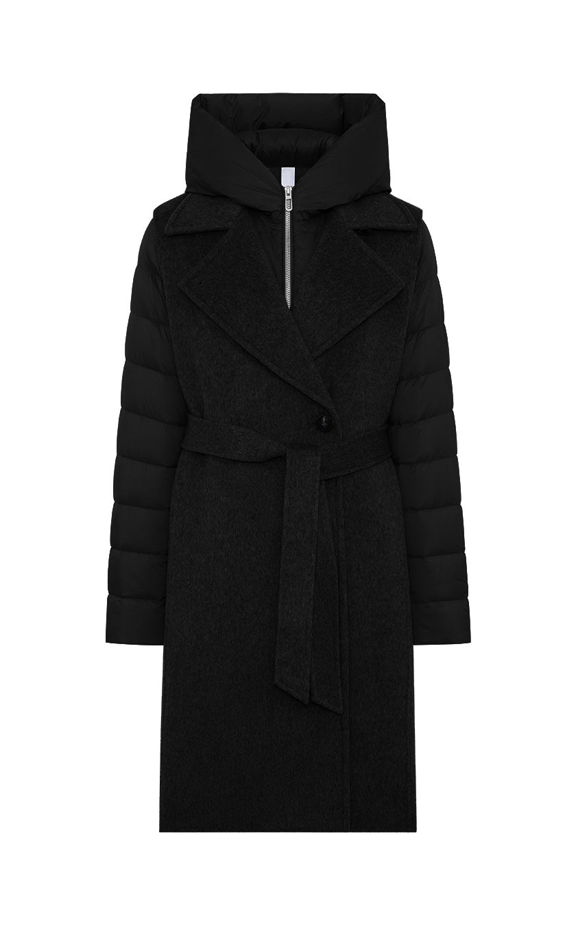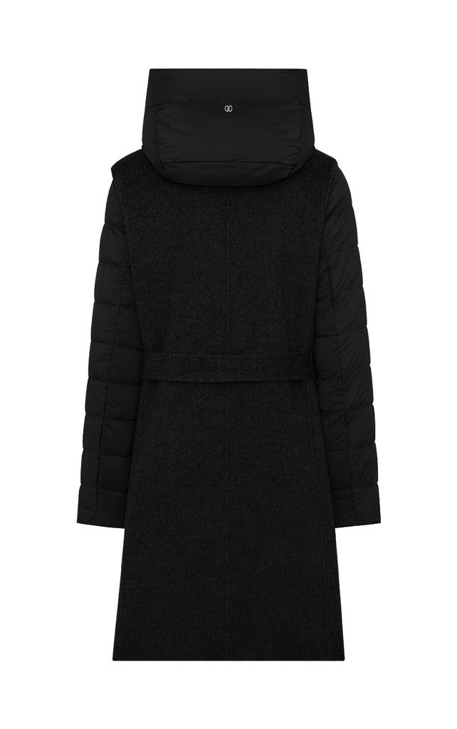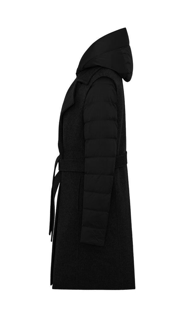 Long double-breasted vest completely unlined belonging to DUNO’s “ATTIC” PROJECT for Luxury Garments segment. The garment is made with a tailor-made double-layer fabric in wool and cashmere. External belt to emphasize the waist, front button closure and side pockets in the side cut. Inside, a down jacket in ultra-lightweight technical fabric with down padding that can be worn separately, characterized by front zipper closure, hood and patch pockets.