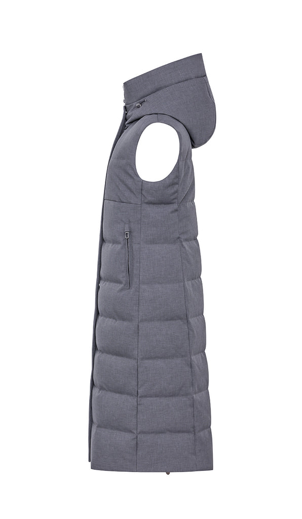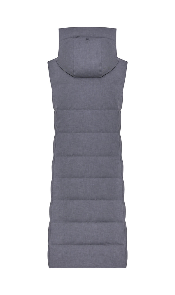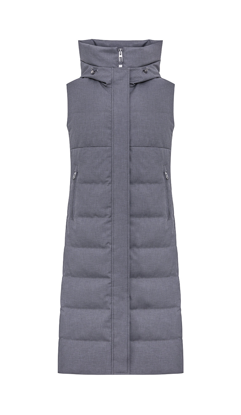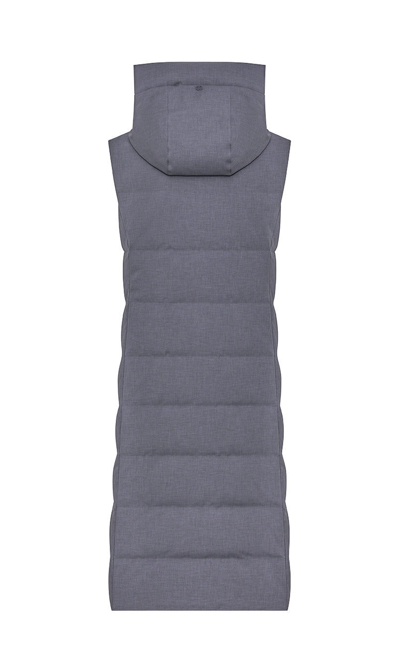 Gilet lungo in piumino di tessuto tecnico di aspetto laniero. Ampio cappuccio regolabile con coulisse, chiusura frontale con zip doppio cursore e dettaglio di tirazip e coulisse al fondo per regolare la vestibilità. Tasche laterali coperte da doppio filetto.