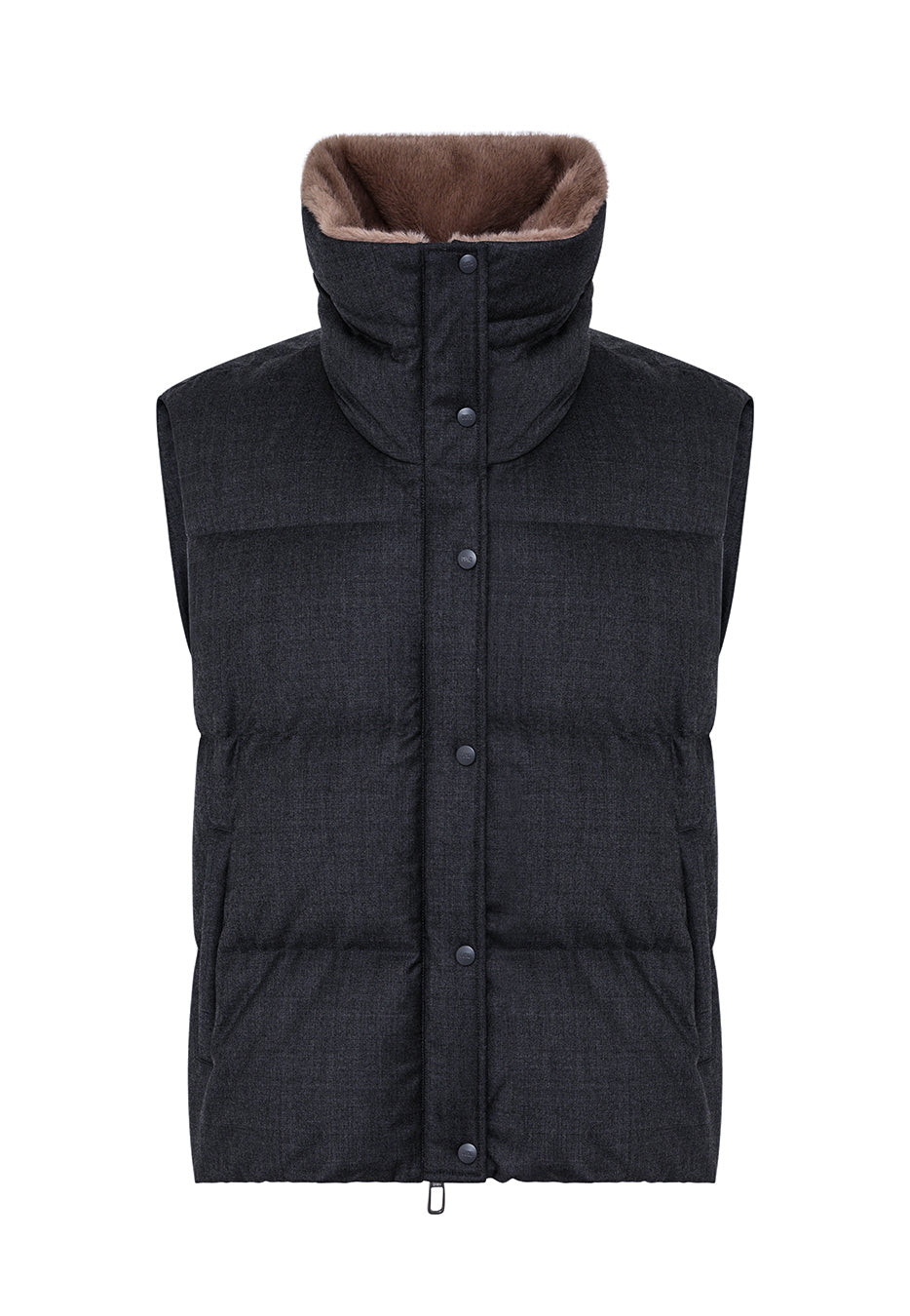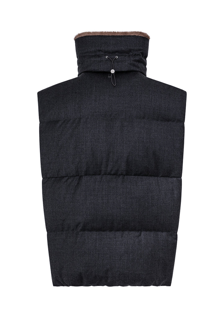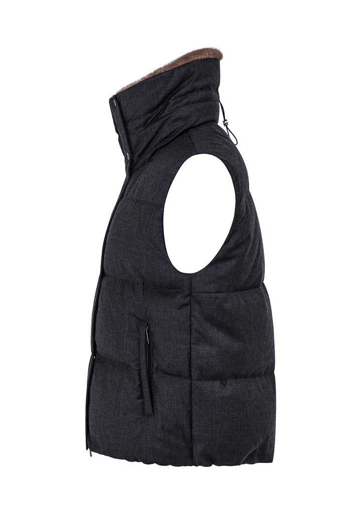 Piumino-gilet in tessuto di pura lana caratterizzato da leggerezza e comfort. Ampio collo regolabile con coulisse con dettaglio di pelo sintetico all’interno, doppia chiusura frontale con zip e automatici e tasche laterali con filetto chiuso da zip. Elastico nascosto al fondo.