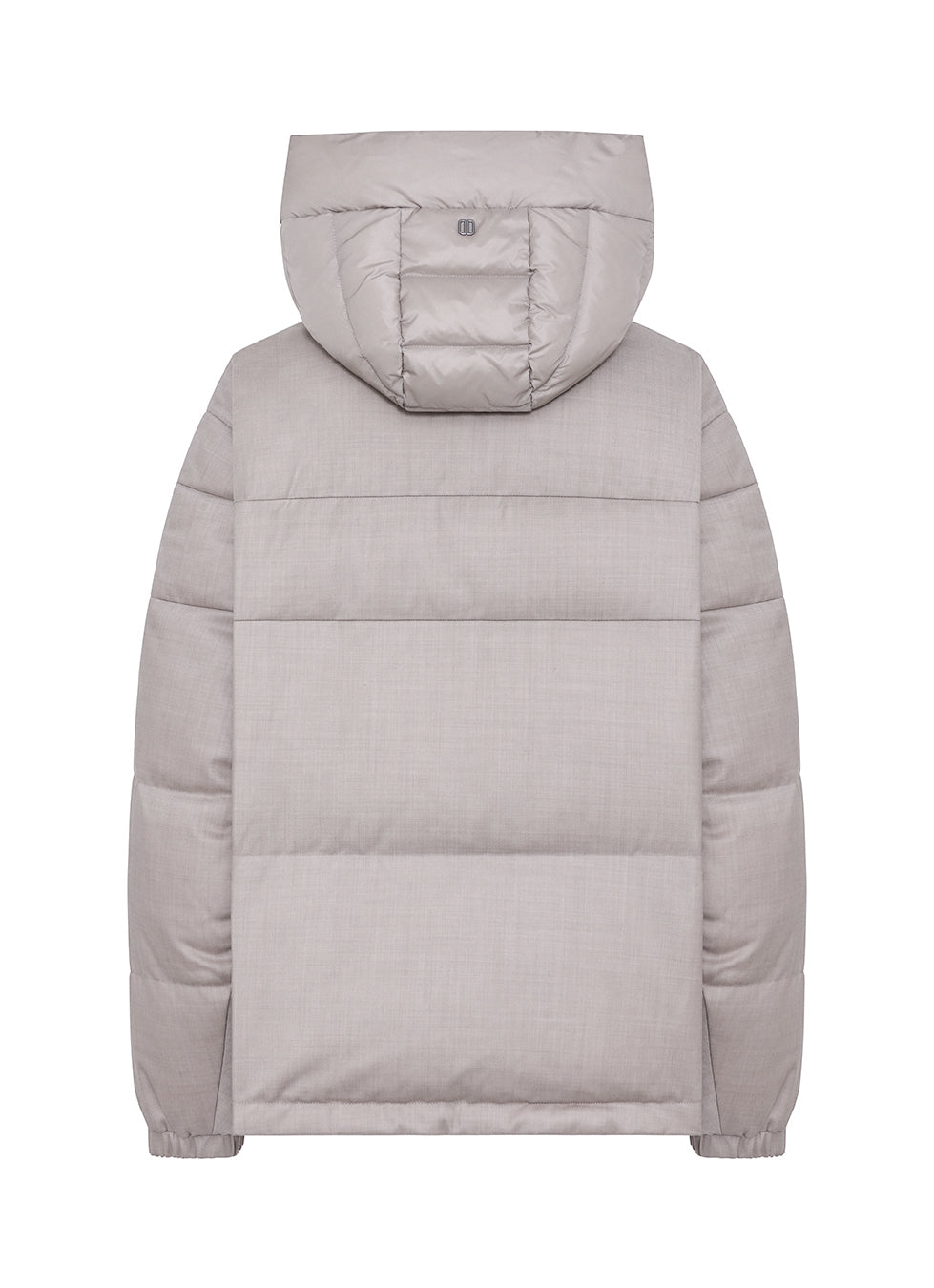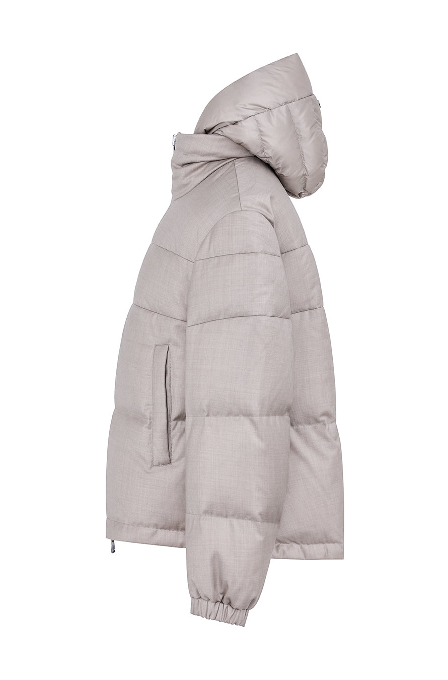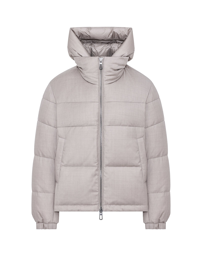 Piumino corto in tessuto di pura lana caratterizzato da spalla scesa e una linea svasata al fondo regolabile con coulisse nascosta. Collo in piedi ampio con coulisse esterna, cappuccio staccabile con zip allo scollo interno in tessuto tecnico superlight, elastico nascosto al fondo manica e tasche laterali a filetto con chiusura ad automatico nascosto. L’imbottitura in piuma preserva il microclima interno al capo.