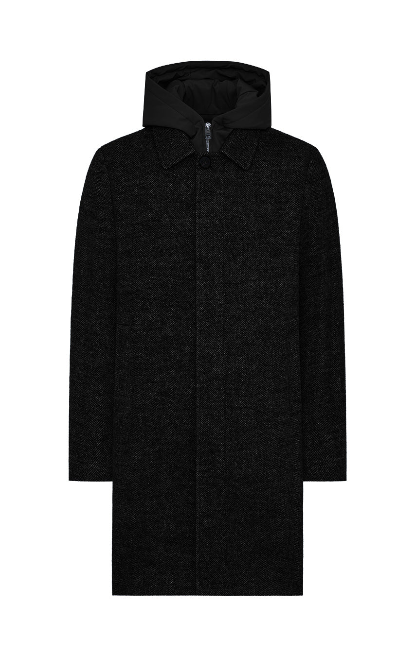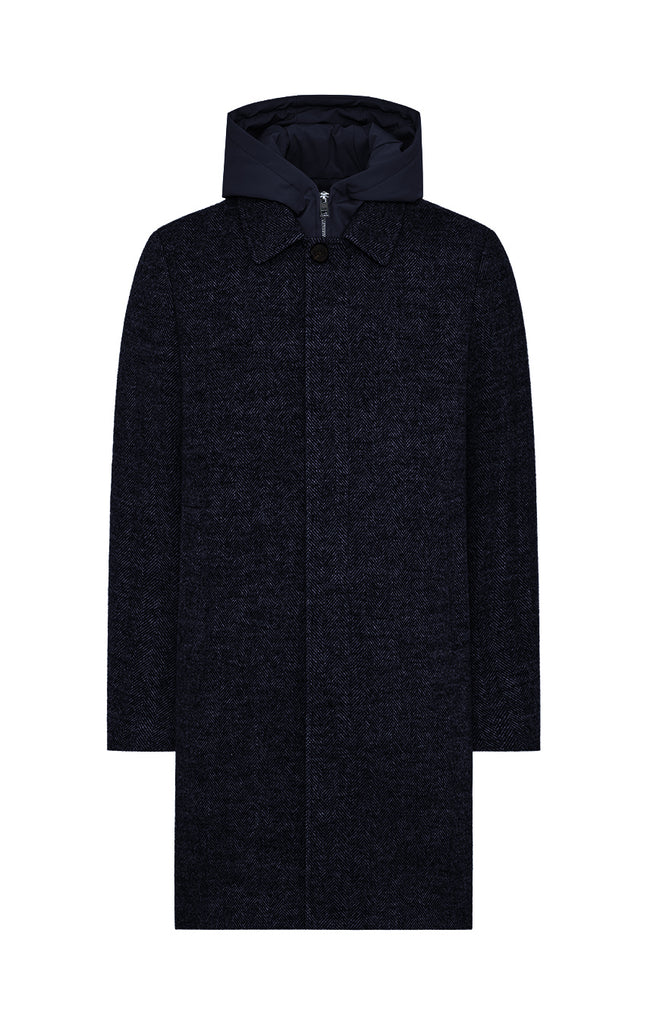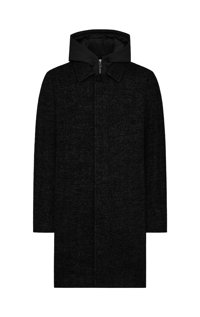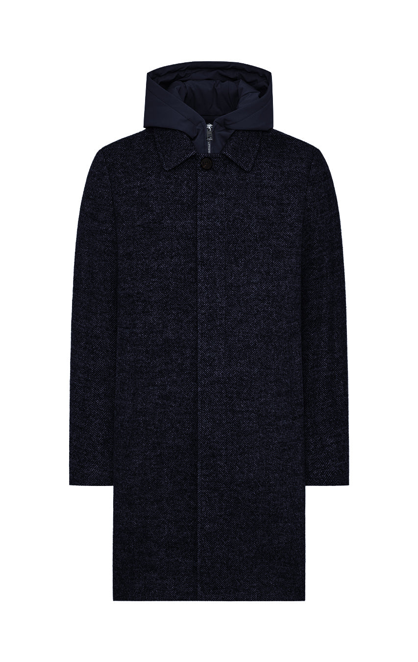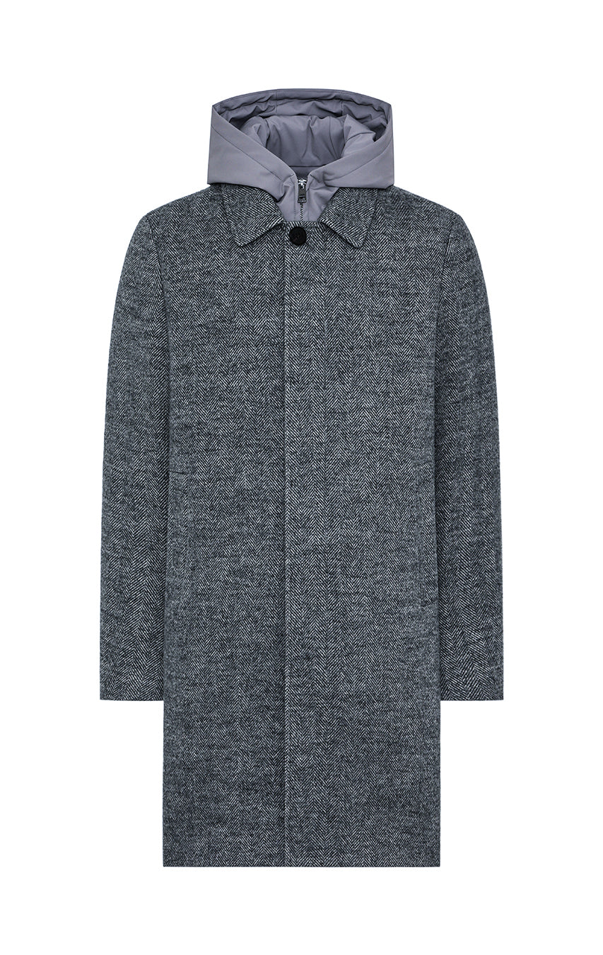 Cappotto realizzato in lana con disegno a resca. Collo a camicia, sottocollo con impunture a zig-zag, chiusura con bottoni nascosti e pettorina staccabile leggermente imbottita in tessuto tecnico superlight con cappuccio e chiusura con zip doppio cursore. Spacco centrale al fondo posteriore chiuso da automatico, tasche laterali oblique a filetto chiuse da automatico e tasche interne multifunzione.