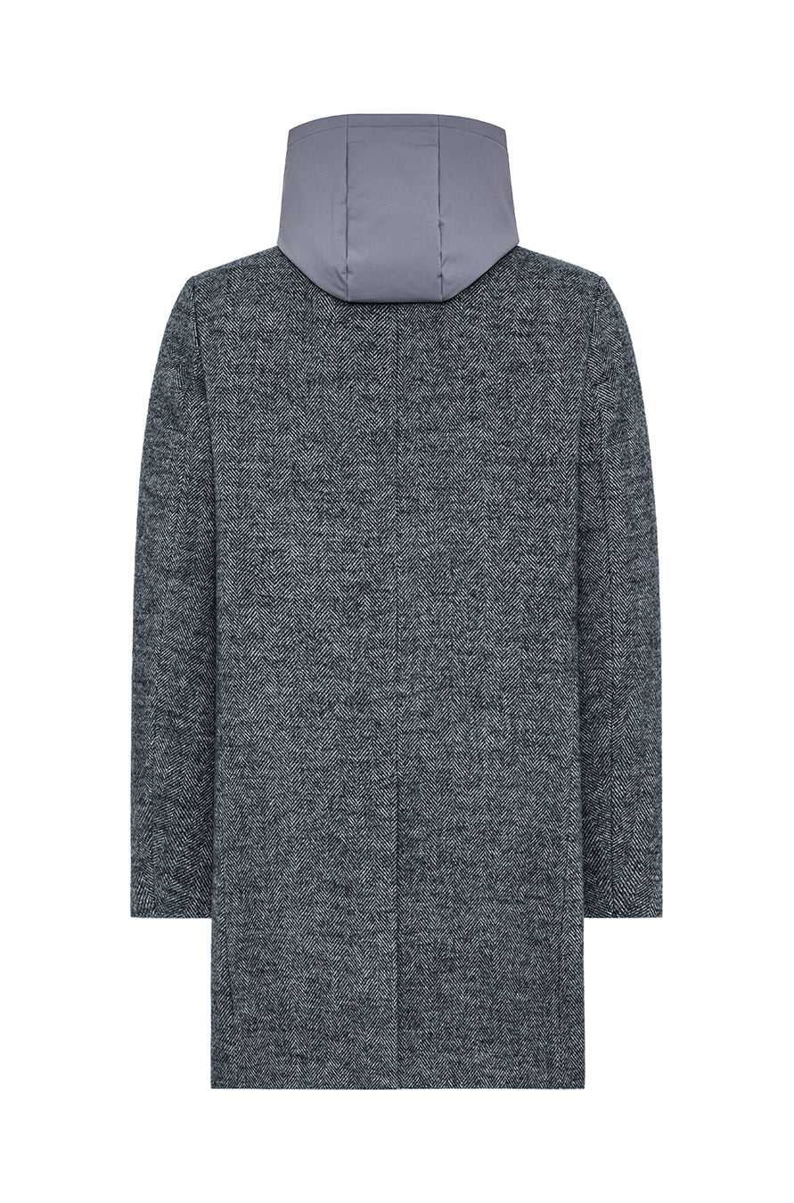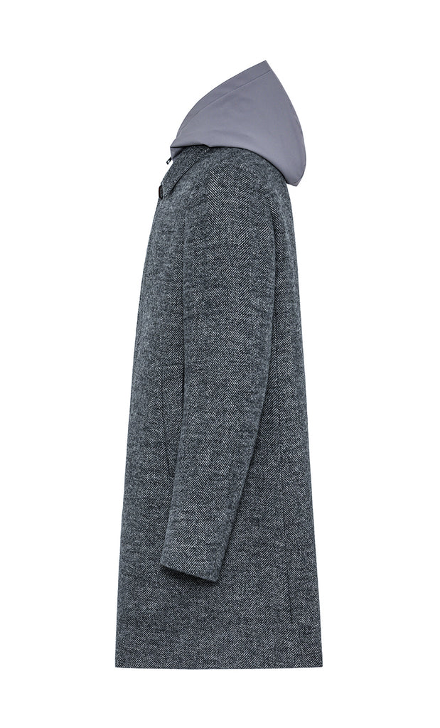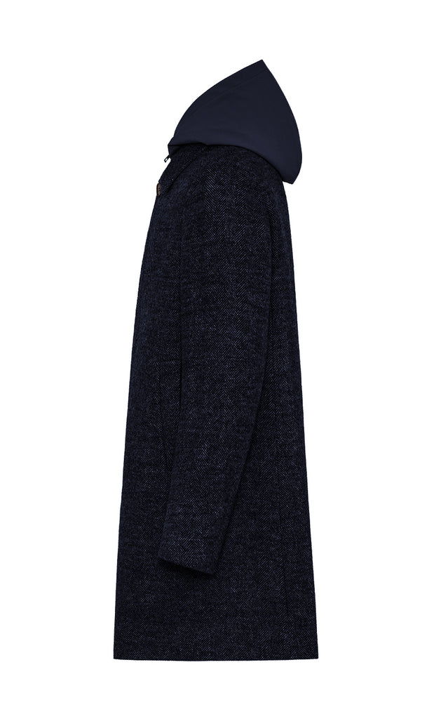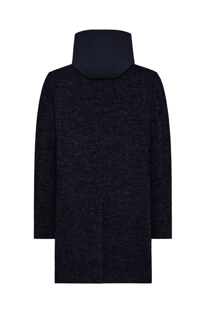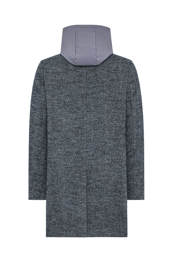 Cappotto realizzato in lana con disegno a resca. Collo a camicia, sottocollo con impunture a zig-zag, chiusura con bottoni nascosti e pettorina staccabile leggermente imbottita in tessuto tecnico superlight con cappuccio e chiusura con zip doppio cursore. Spacco centrale al fondo posteriore chiuso da automatico, tasche laterali oblique a filetto chiuse da automatico e tasche interne multifunzione.
