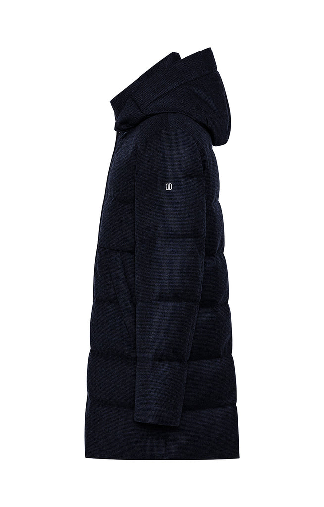 Tessuto di altissima qualità a marchio LORO PIANA® consistente in una combinazione di lane vergini pregiate e cashmere con disegno pied-de-poule a 3 colori con palette esclusiva. Il tessuto è arricchito dal trattamento brevettato STORM SYSTEM®, consistente in un finissaggio sulla superficie brevettato Rain System® che lo protegge dal vento e dalla pioggia e da una speciale membrana idrofila GO bio-based applicata sul rovescio che garantisce performance waterproof e windproof, mantenendo la mano dolce del tessuto. La capacità igroscopica e termo-regolatrice della lana unita alla morbidezza e calore del cashmere nonchè l'imbottitura in piuma regolano la termoregolazione del corpo, preservando il microclima interno al capo.