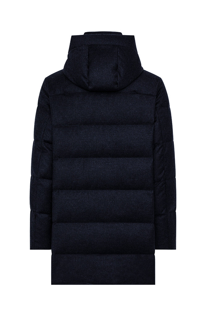 Parka trapuntato in tessuto pregiato di lana e cashmere a marchio LORO PIANA® appartenente al progetto "ATTIC" per il segmento Luxury Garments di DUNO. Il capo è caratterizzato da doppia chiusura frontale con zip metallica doppio cursore ed automatici nascosti, cappuccio staccabile con zip allo scollo esterno e tasche laterali antivento chiuse da zip coperte da filetto. Il trattamento brevettato STORM SYSTEM® garantisce performance waterproof e windproof. La morbidezza e il calore del tessuto sono enfatizzati dall'imbottitura in piuma che, con i polsini interni in costina di lana, completa il sistema protettivo del capo. All'interno labeling dedicato al tema "ATTIC" e tasche con chiusura a zip.