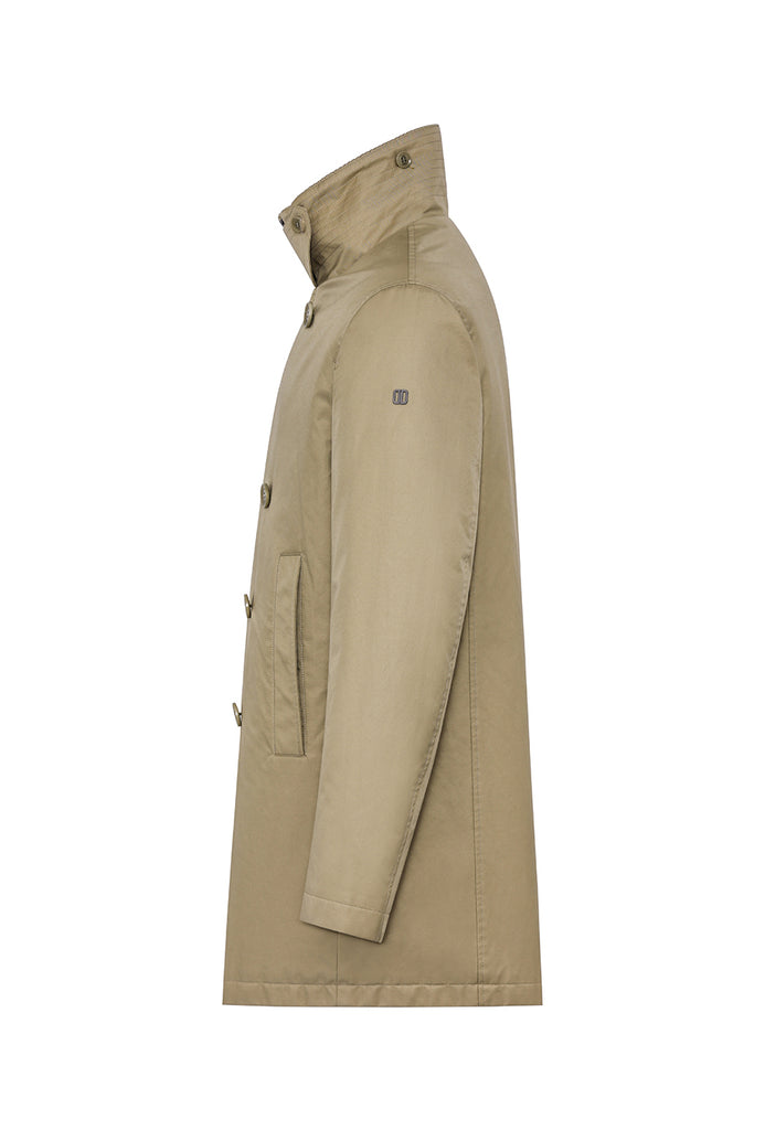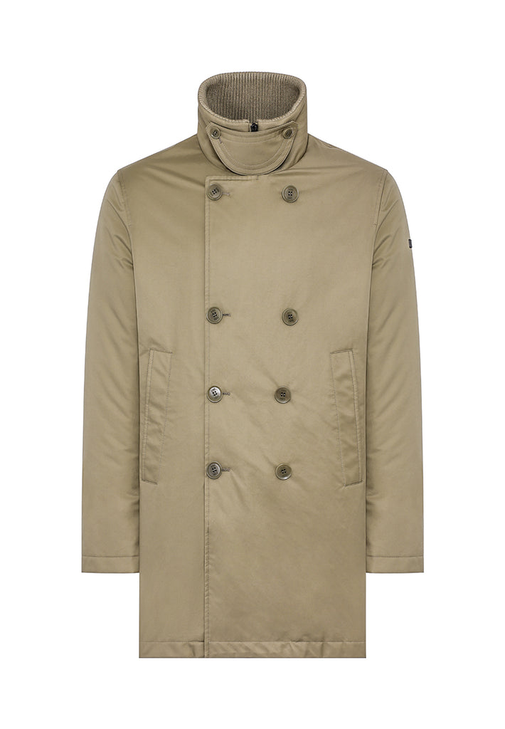 Caban doppiopetto in tessuto di cotone 3-Layer con imbottitura sintetica trapuntata. Il capo è caratterizzato da una doppia chiusura frontale con bottoni e zip, collo interno in maglia di lana a coste e tasche laterali a filetto con chiusura ad automatico. Dettaglio di laccio sottogola staccabile con bottoni e polsini interni in maglia tecnica.
