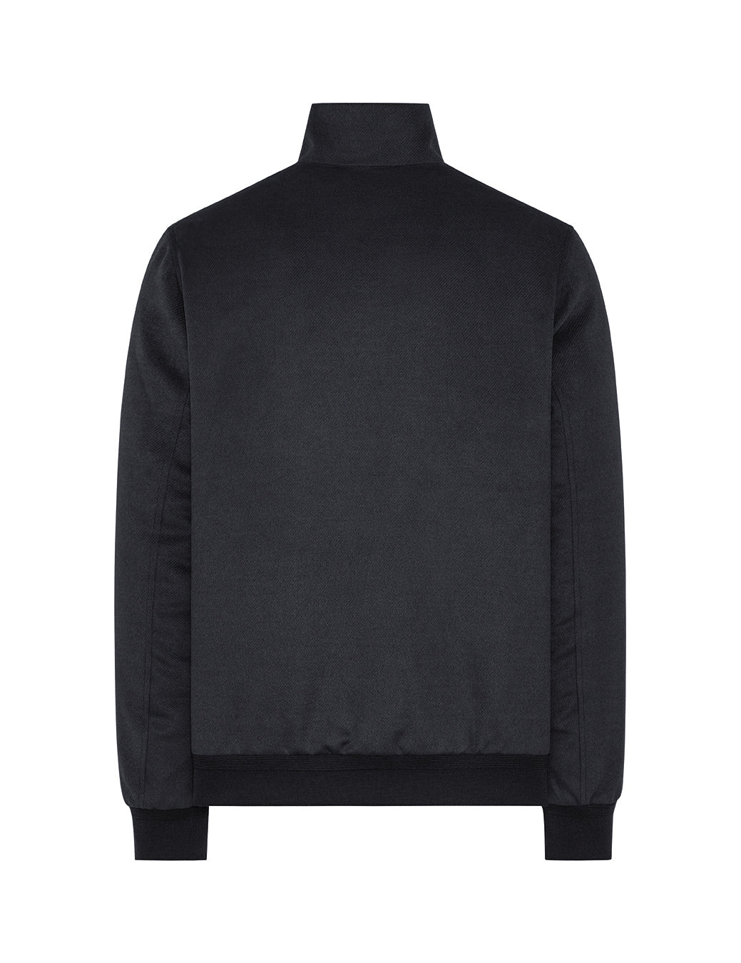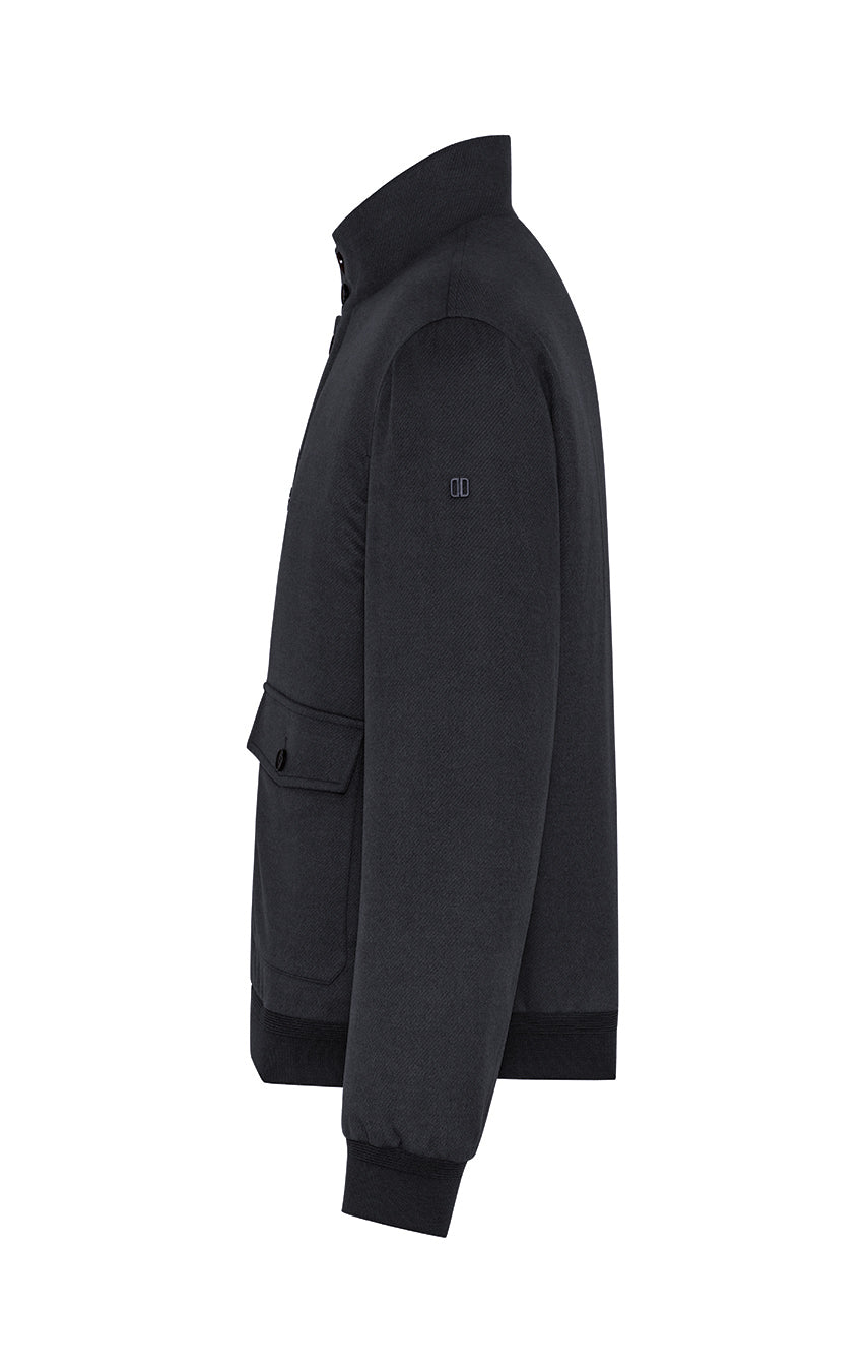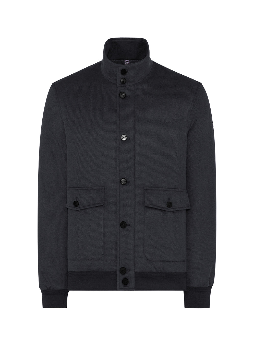 Bomber jacket realizzato in lana tecnica con imbottitura in piuma, con collo in piedi rivestito internamente in maglia di lana, doppia chiusura frontale con bottoni e zip doppio cursore. Tasche frontali a toppa con pattina chiusa da bottone e tasche laterali inserite nel taglio del fianco. Fondo manica e polsini in maglia di lana.