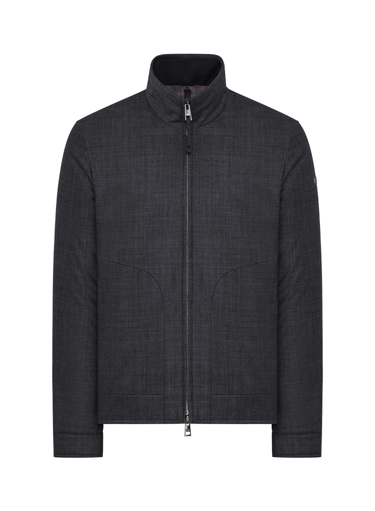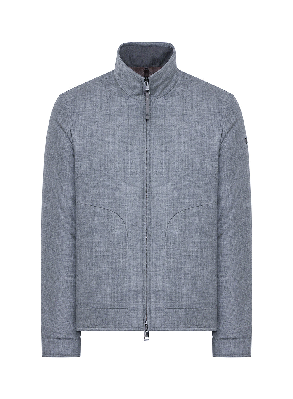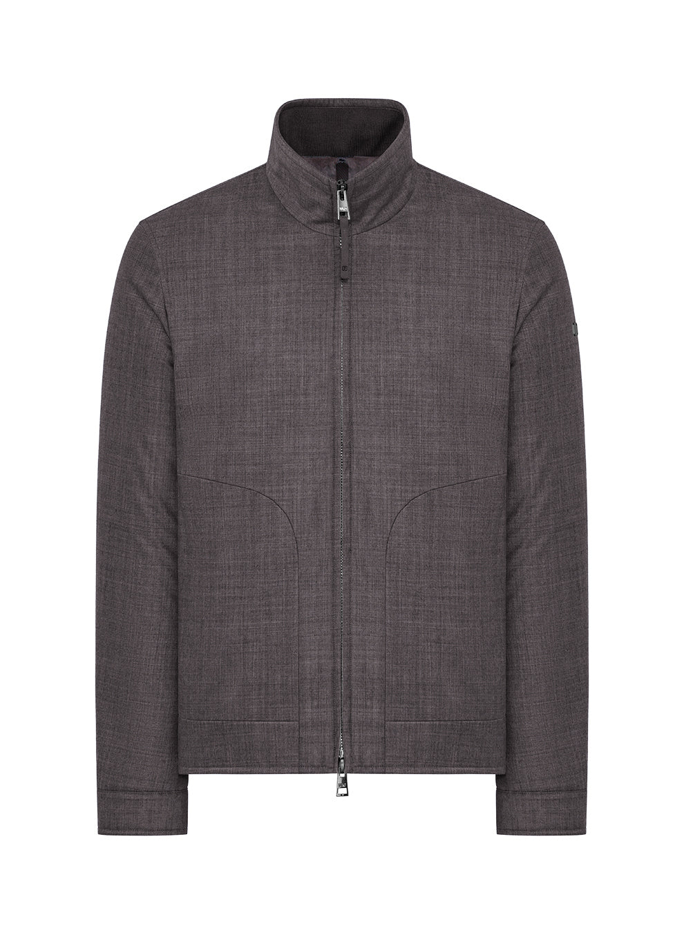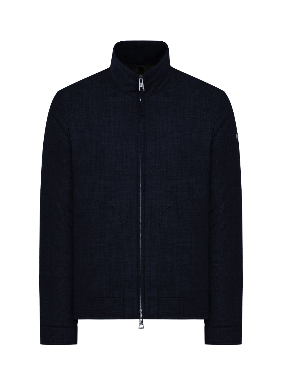 Giacca corta realizzata in pura lana con fodera in pelliccia sintetica. Collo in piedi con interno in costina di lana, chiusura frontale con zip doppio cursore a tutta altezza e fondo dietro con costina di lana. Tasche laterali con zip coperte da filetto e fondo manica con polsino regolabile tramite automatici. Tasche interne con zip.