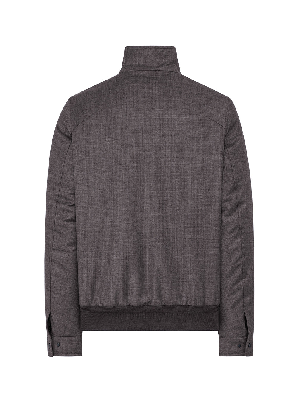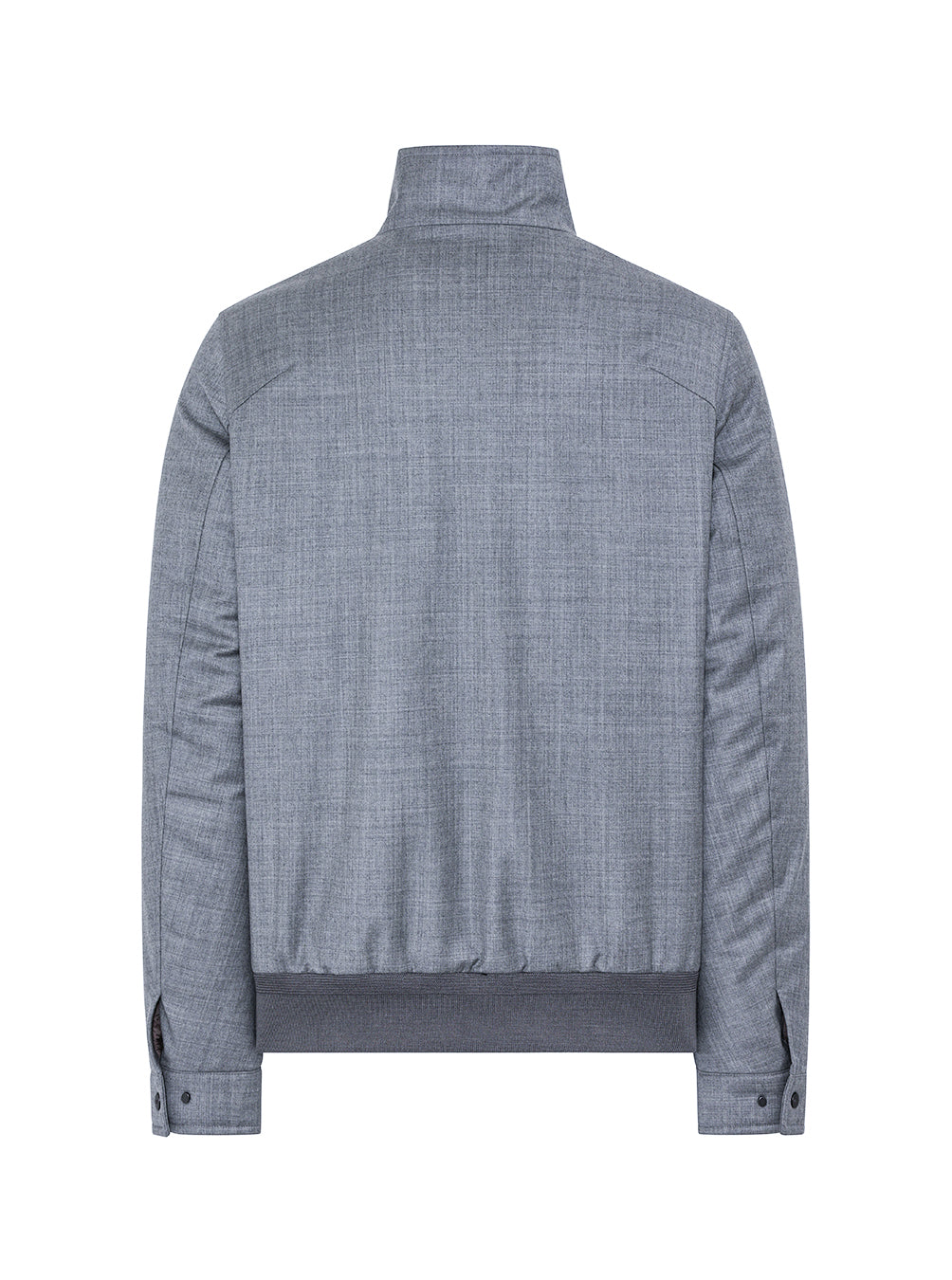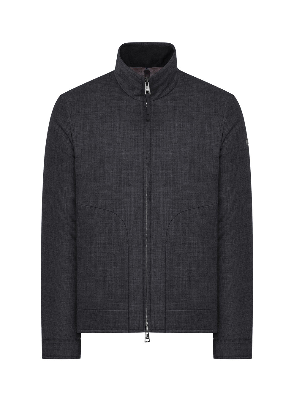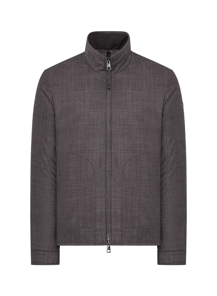 Giacca corta realizzata in pura lana con fodera in pelliccia sintetica. Collo in piedi con interno in costina di lana, chiusura frontale con zip doppio cursore a tutta altezza e fondo dietro con costina di lana. Tasche laterali con zip coperte da filetto e fondo manica con polsino regolabile tramite automatici. Tasche interne con zip.