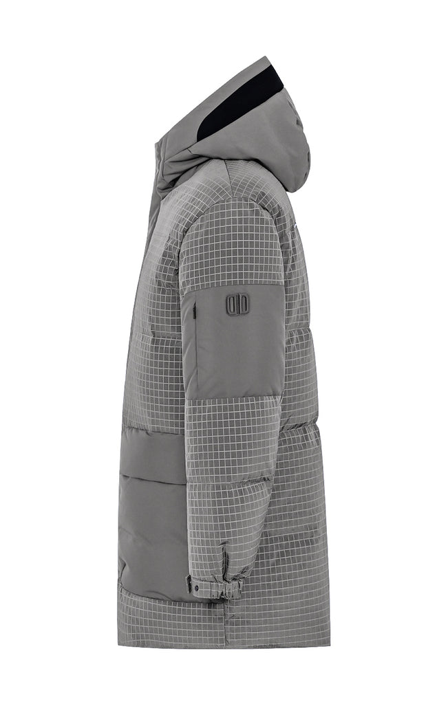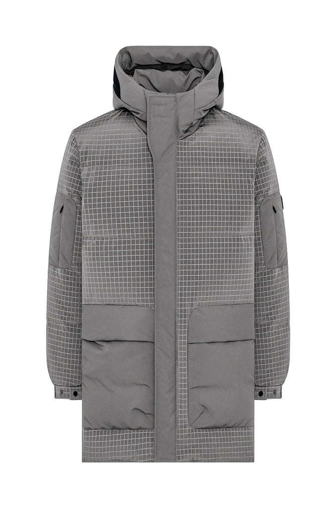 Parka in tessuto tecnico con struttura macro rip-stop e imbottitura in piuma. Doppia chiusura frontale con zip doppio cursore e automatici nascosti da patta, dettagliata da automatico magnetico FIDLOCK®. Ampie tasche laterali a toppa chiuse da automatico e zip invisibile, tasche sulla manica, fondo manica elasticizzato e regolabile tramite automatici. All'interno tasche multifunzione con dettagli catarifrangenti.