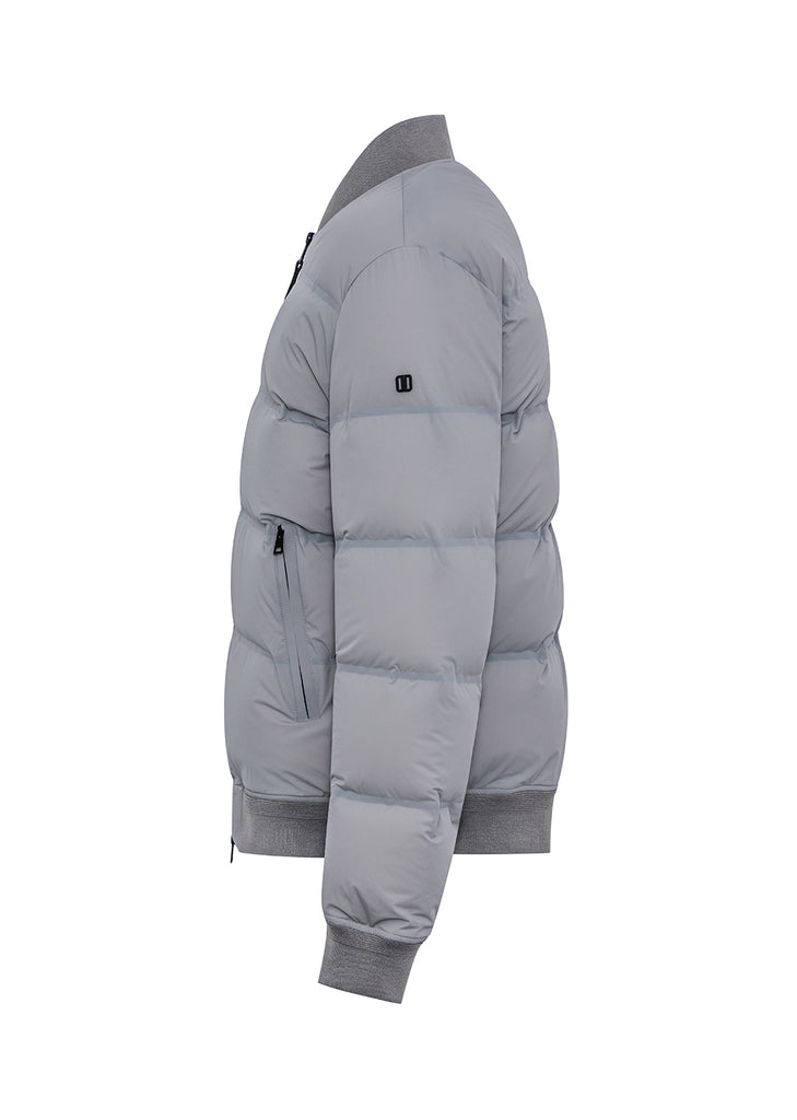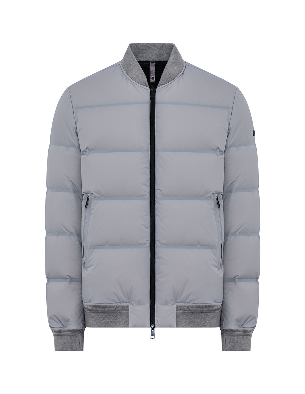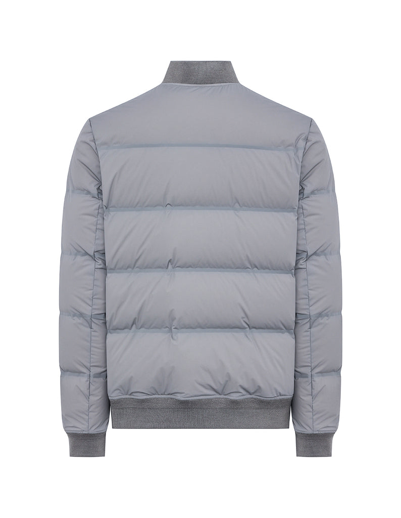 Bomber imbottito in piuma realizzato in tessuto tecnico superlight bi-stretch con rifiniture in maglia di lana al collo, ai polsi e al fondo. Le termo-saldature definiscono i canali per l'iniezione diretta della piuma, senza utilizzo di cuciture. Chiusura frontale e alle tasche laterali oblique con zip water-resistant e dettaglio di sotto zip in neoprene nero e logo a rilievo. All'interno tasche multifunzione e dettagli catarifrangenti.
