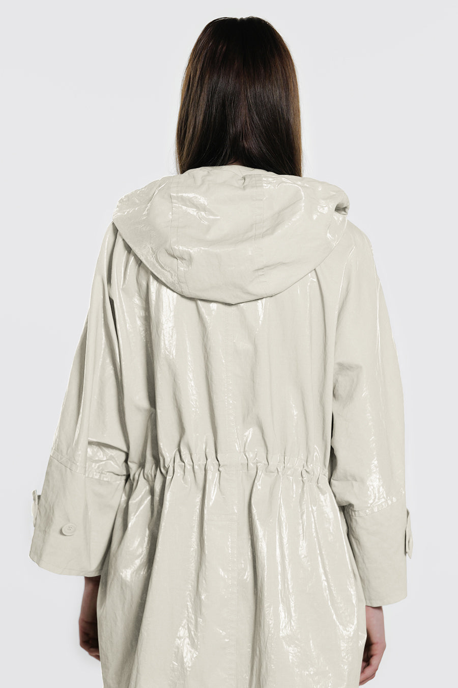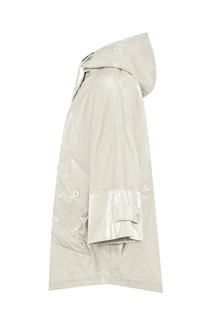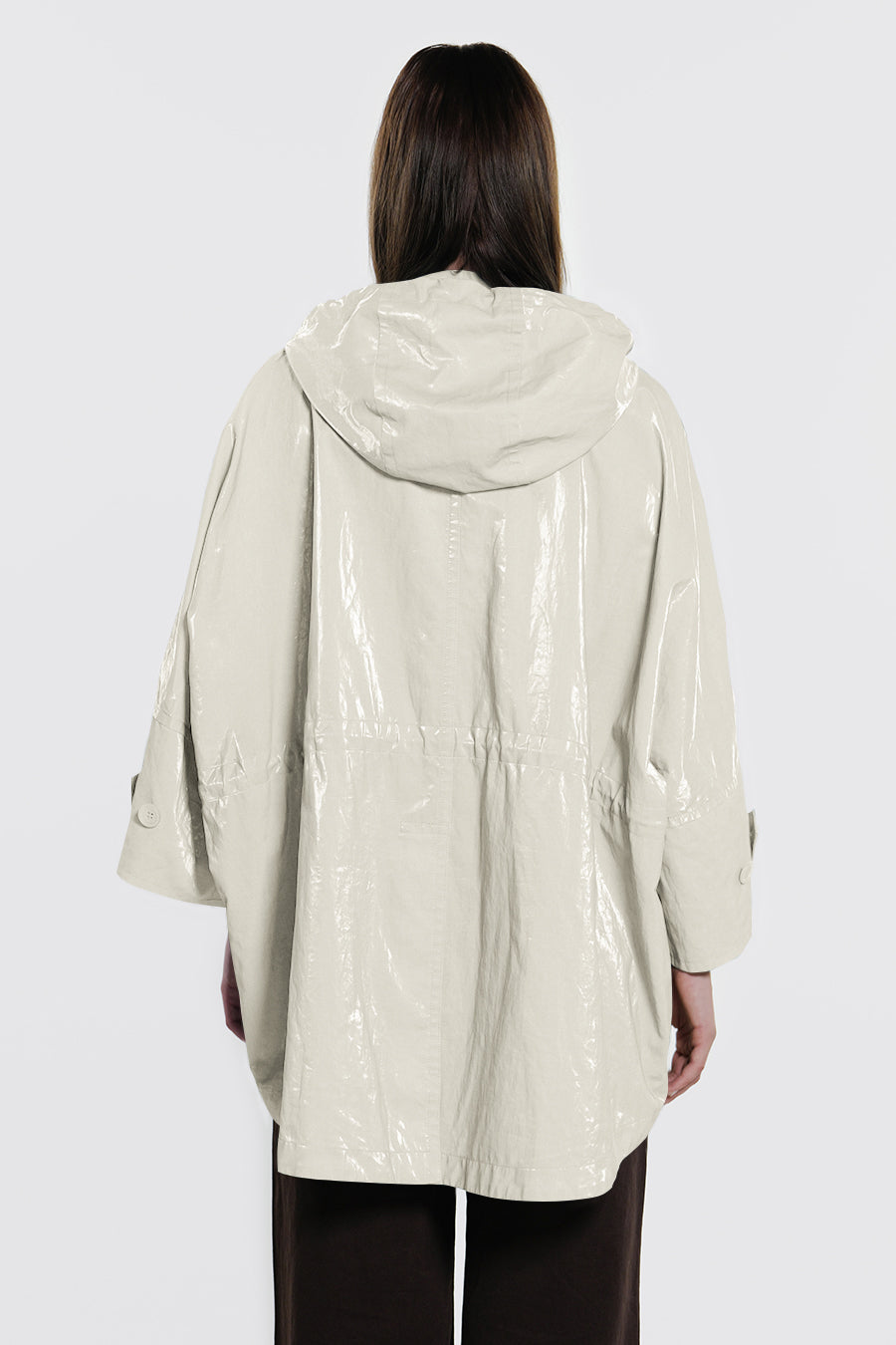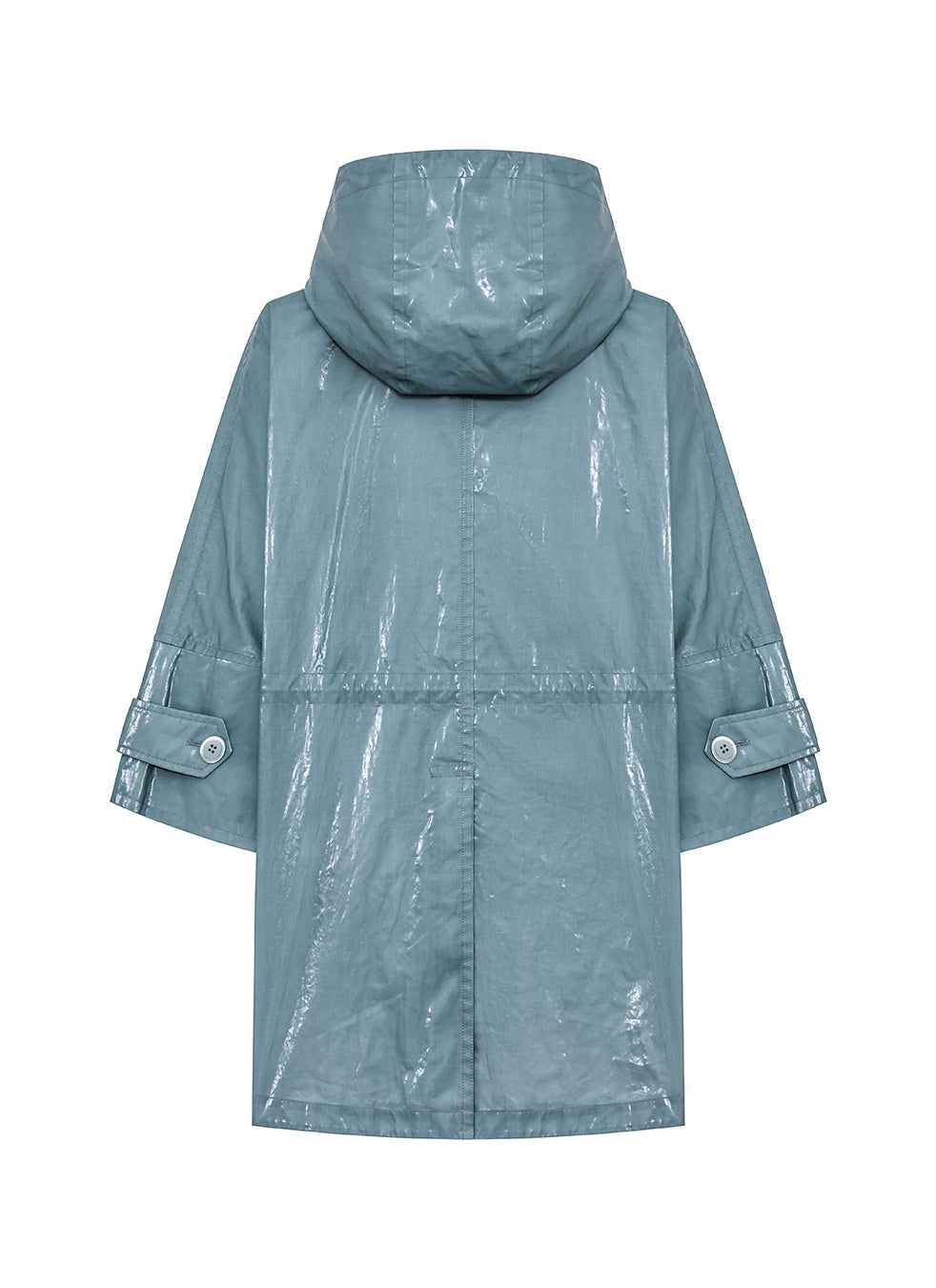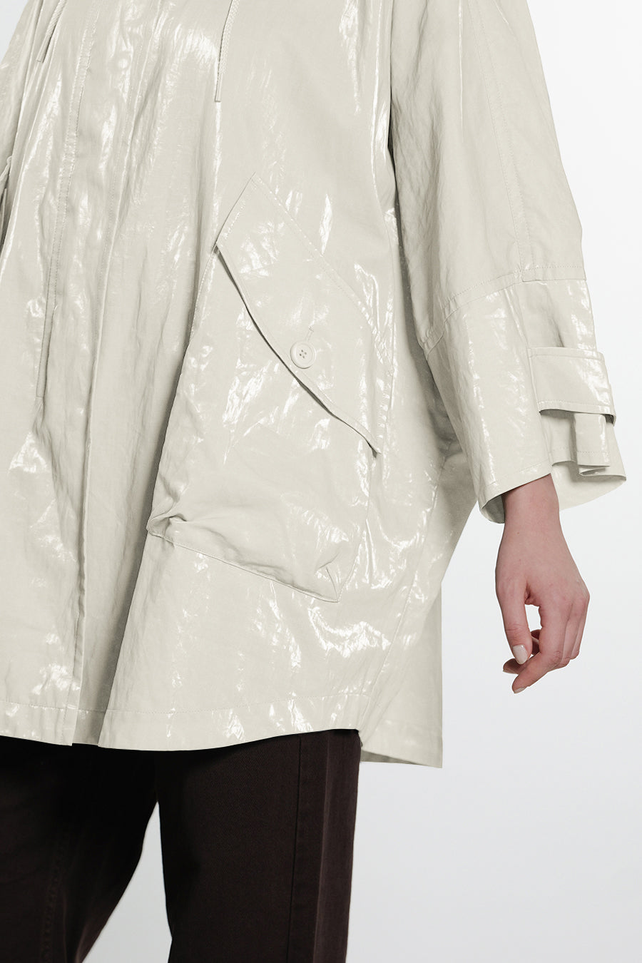 Lightweight white ramie canvas with semi-transparent colored polyurethane surface coating that reveals the structure of the fabric below, two-tone fabric: shiny on the outside with an iridescent effect. The rubberized effect due to polyurethane makes the fabric water-repellent.