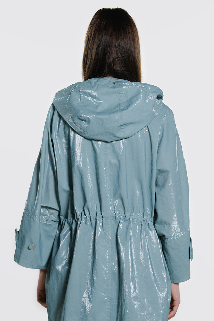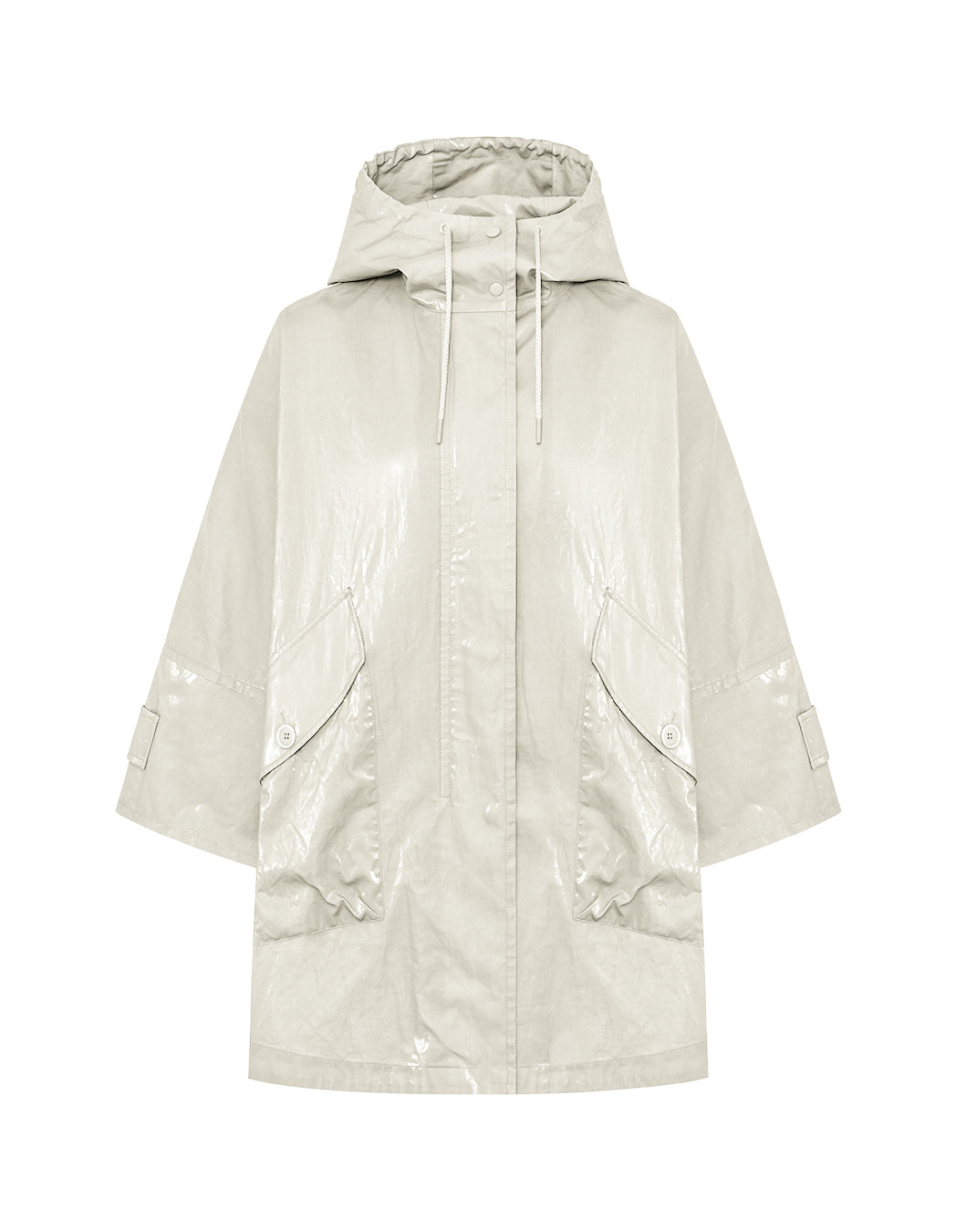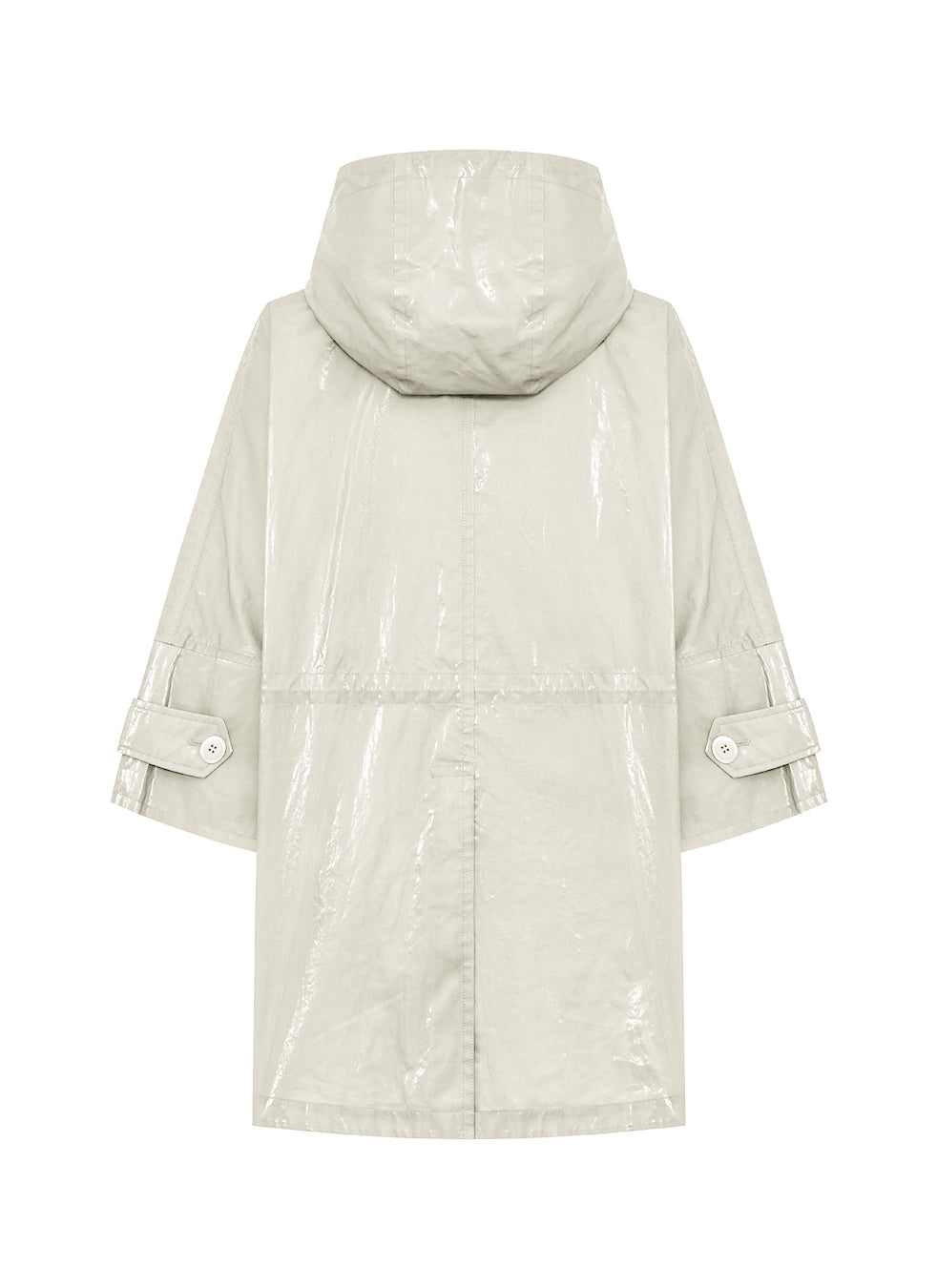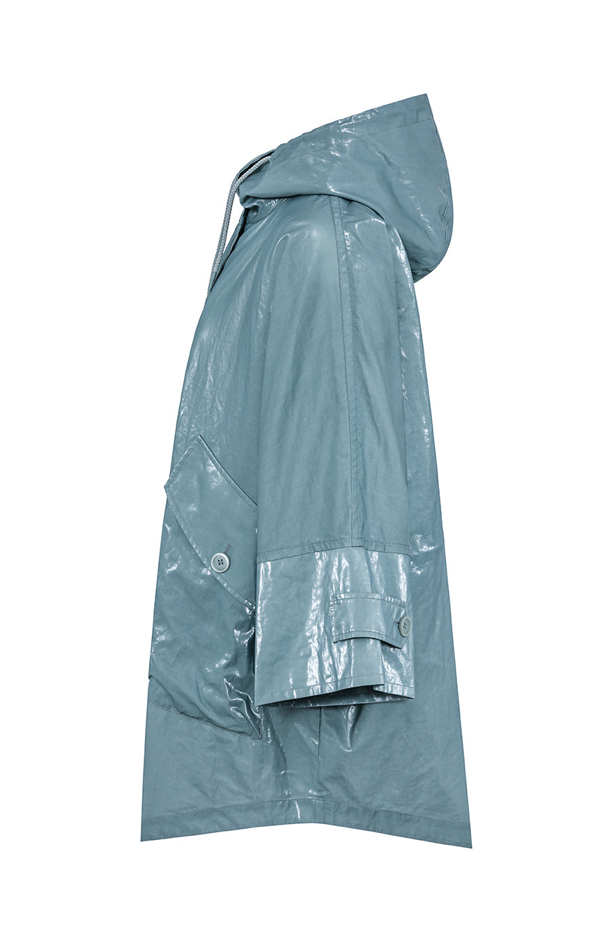 Lightweight white ramie canvas with semi-transparent colored polyurethane surface coating that reveals the structure of the fabric below, two-tone fabric: shiny on the outside with an iridescent effect. The rubberized effect due to polyurethane makes the fabric water-repellent.