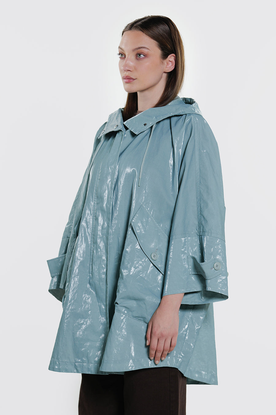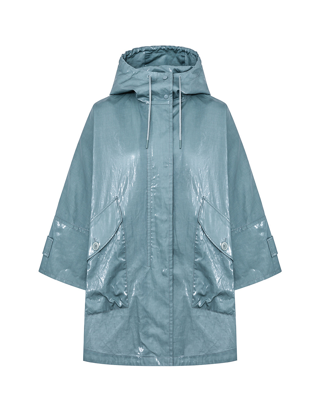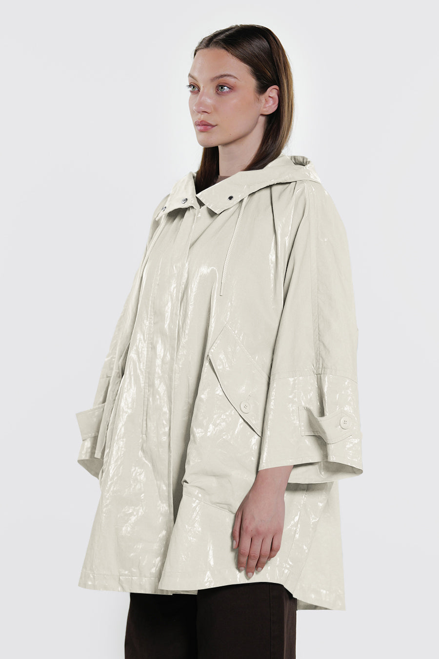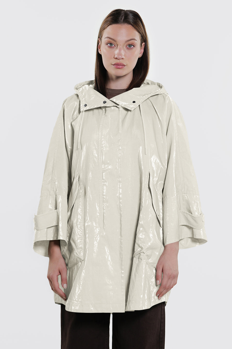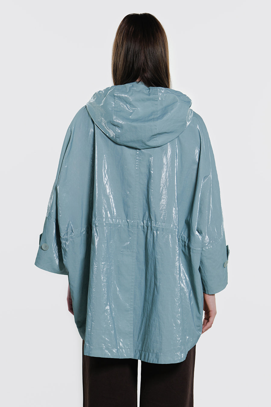Lightweight white ramie canvas with semi-transparent colored polyurethane surface coating that reveals the structure of the fabric below, two-tone fabric: shiny on the outside with an iridescent effect. The rubberized effect due to polyurethane makes the fabric water-repellent.
