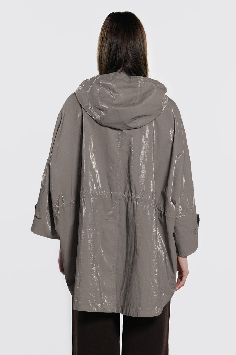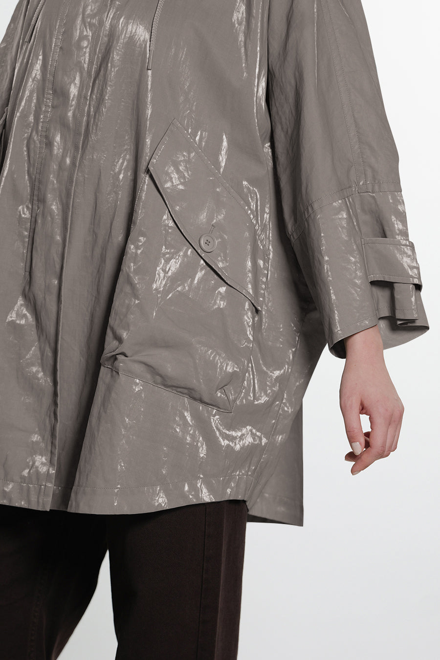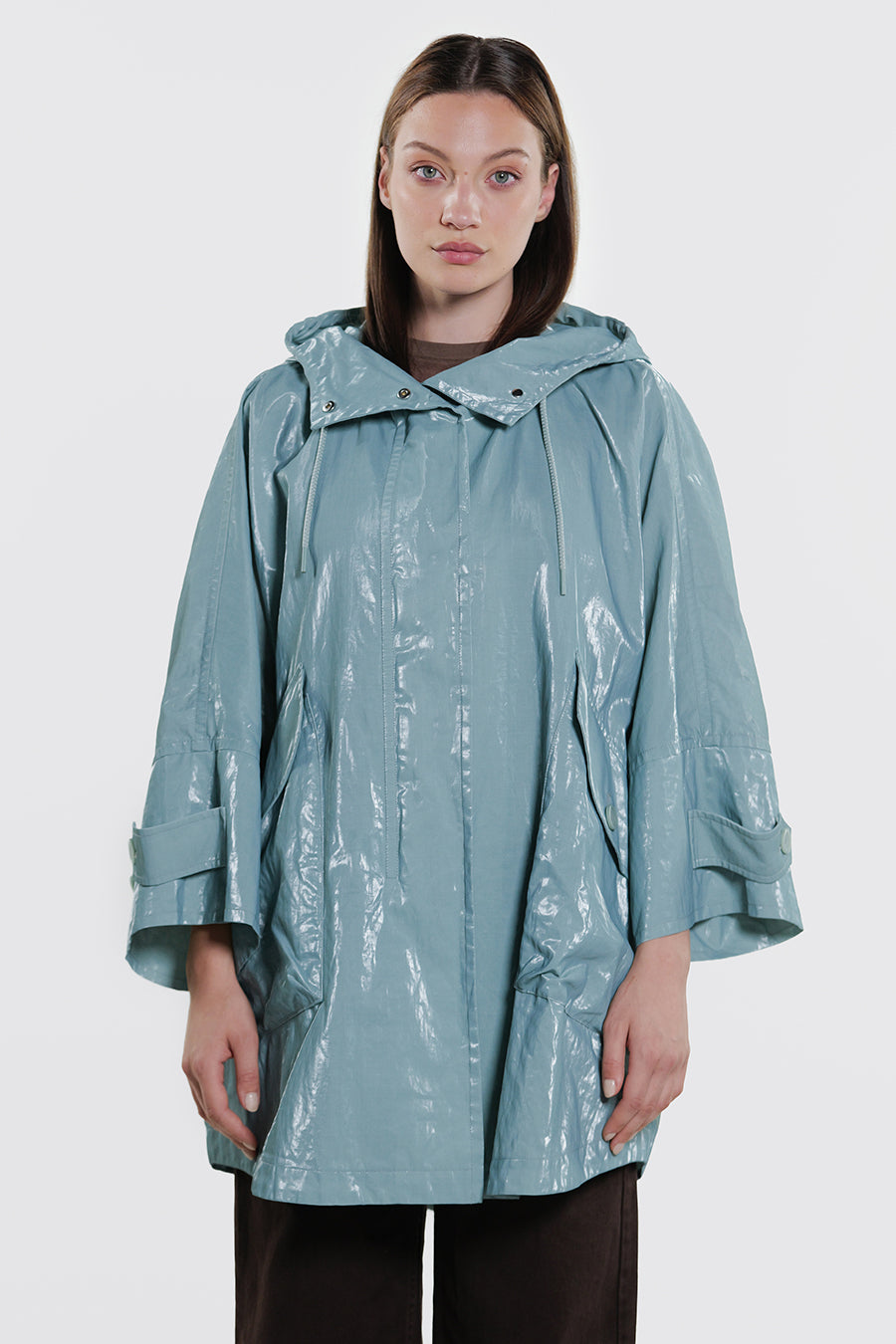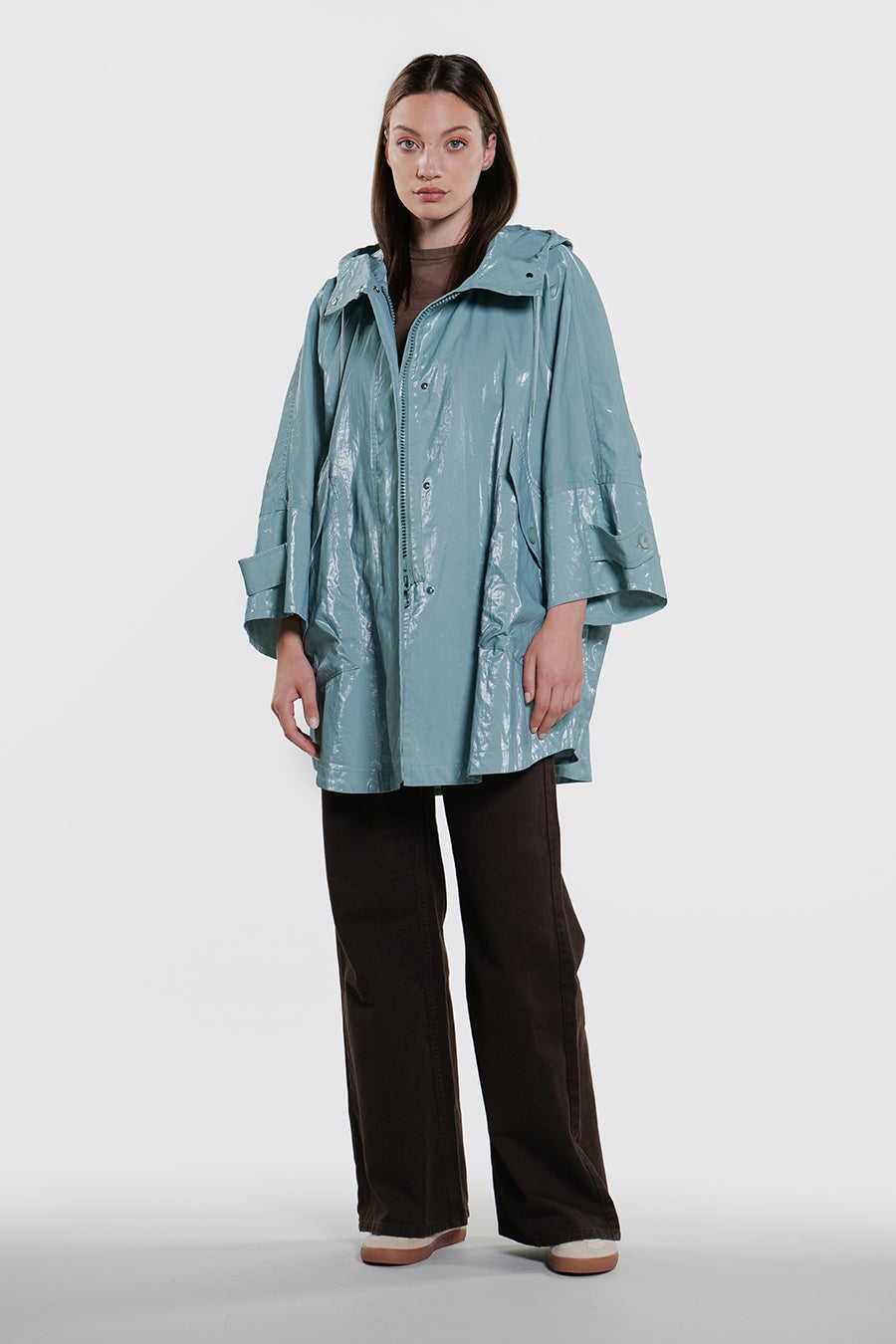 Lightweight white ramie canvas with semi-transparent colored polyurethane surface coating that reveals the structure of the fabric below, two-tone fabric: shiny on the outside with an iridescent effect. The rubberized effect due to polyurethane makes the fabric water-repellent.